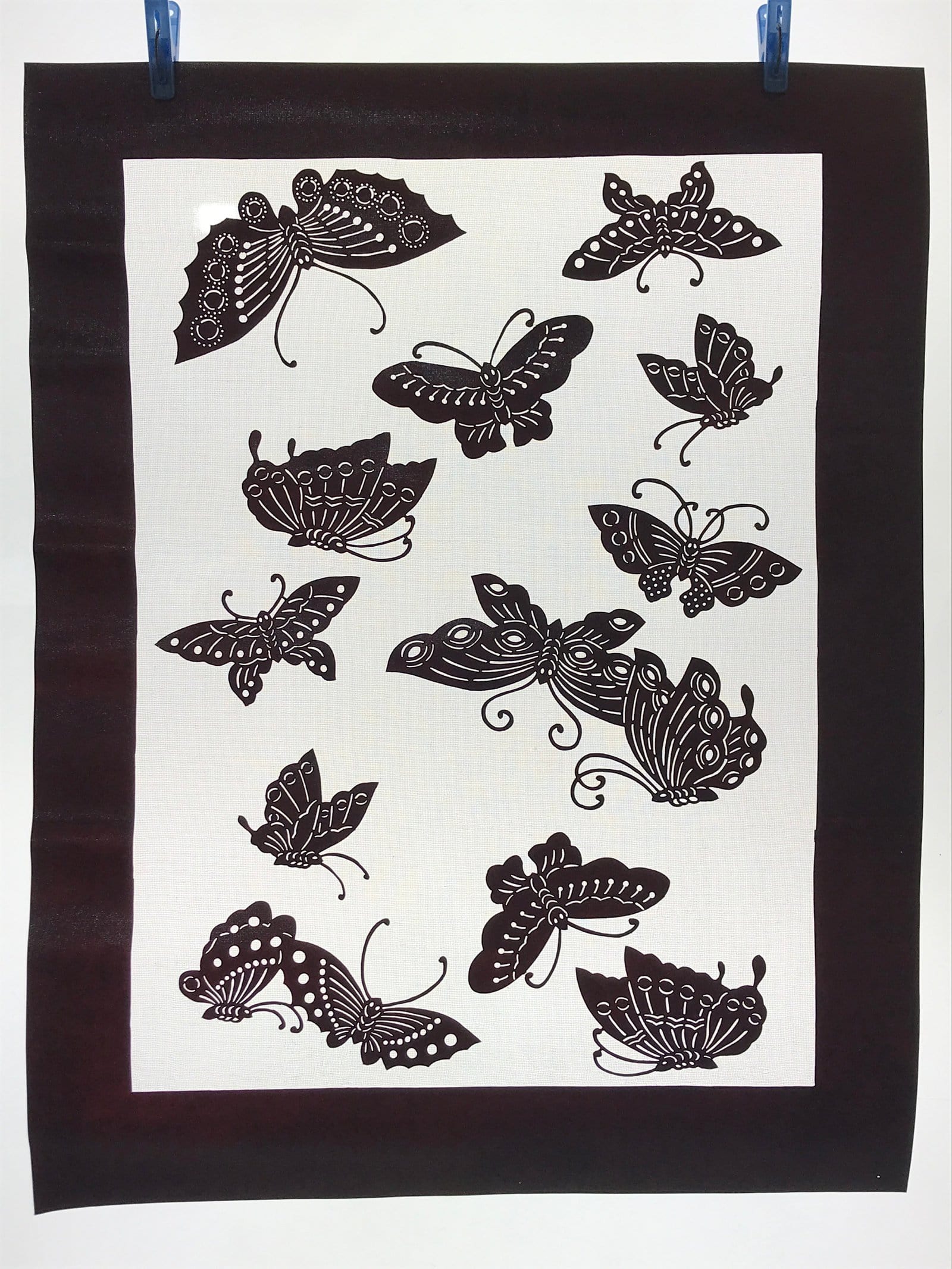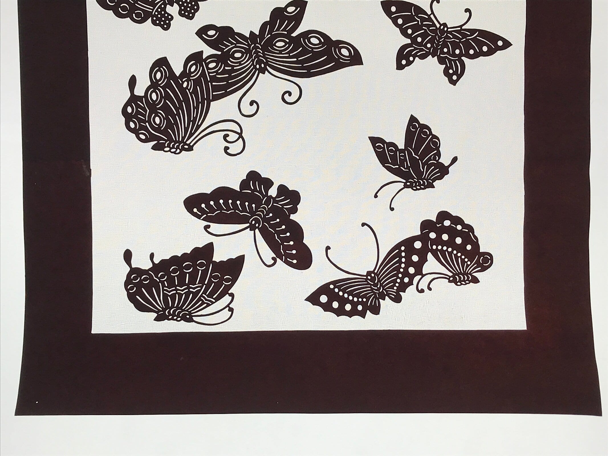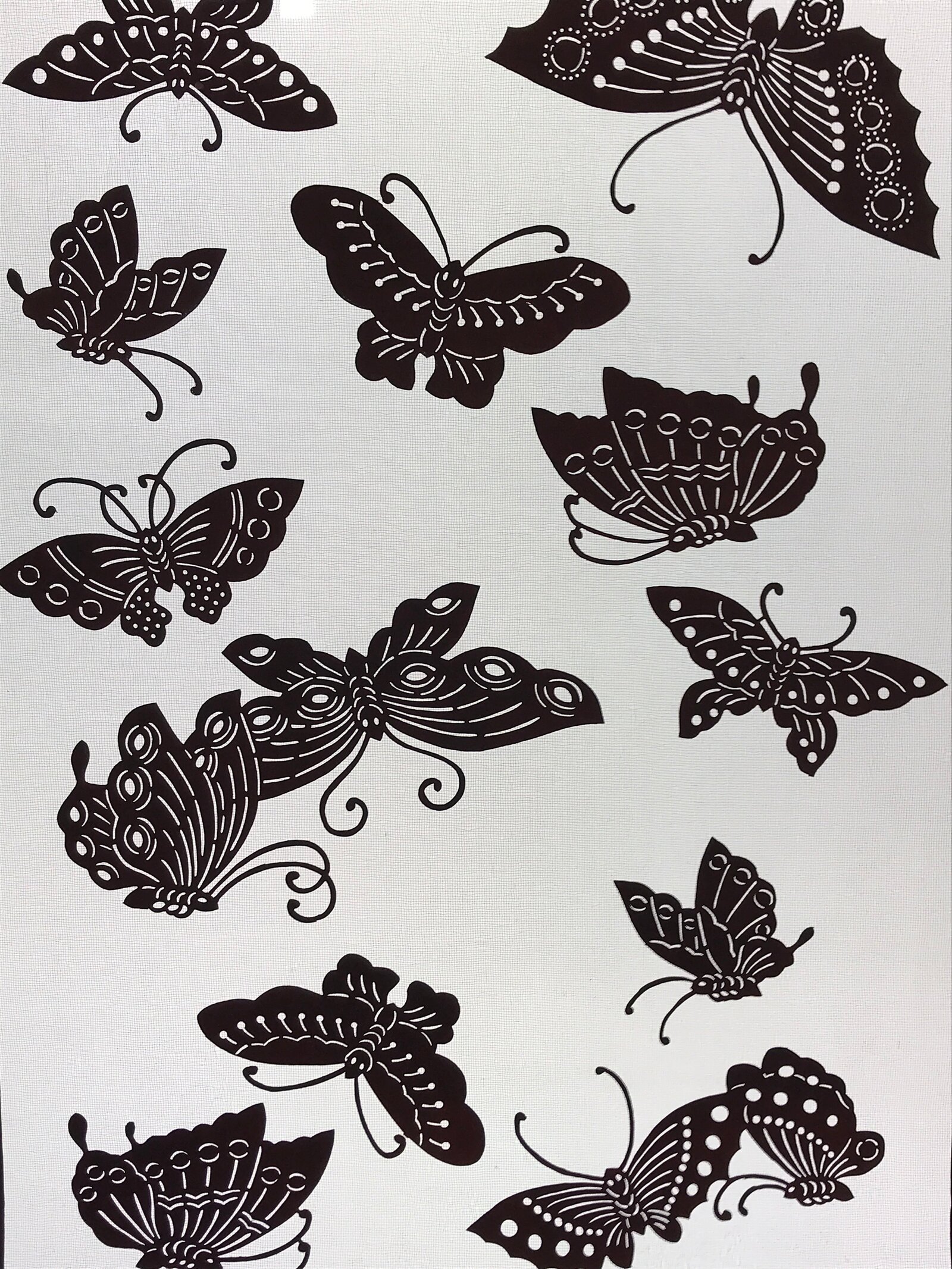 Using traditional mulberry paper, this katagami stencil with silk mesh backing is decorated with a kaleidoscope of fluttering butterflies.