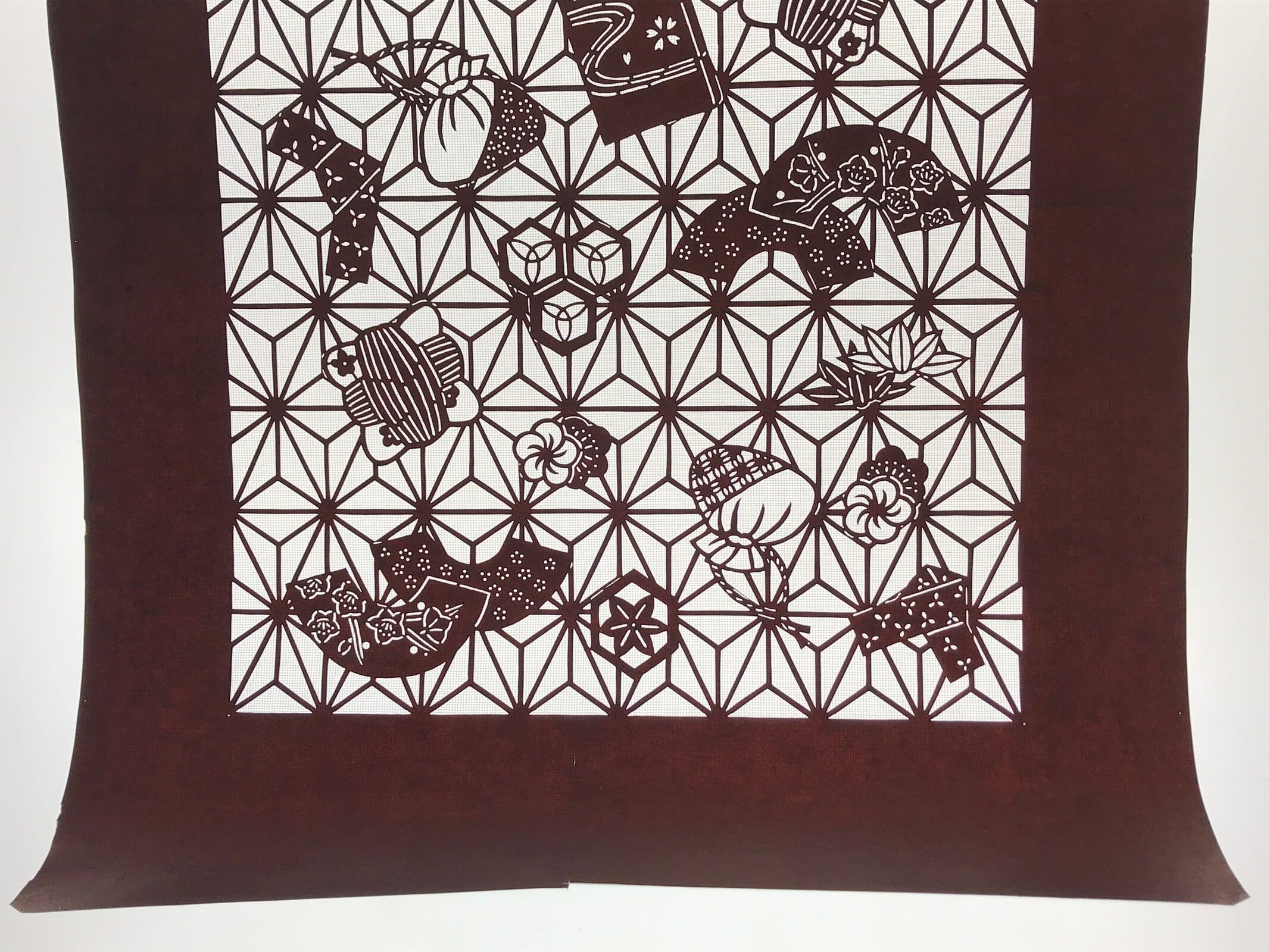 Using traditional mulberry paper, this katagami stencil with silk mesh backing is decorated with folding fans, cherry blossoms, plum blossoms, textile crafts, and a book. The background uses the traditional asanoha (hemp leaf) pattern.