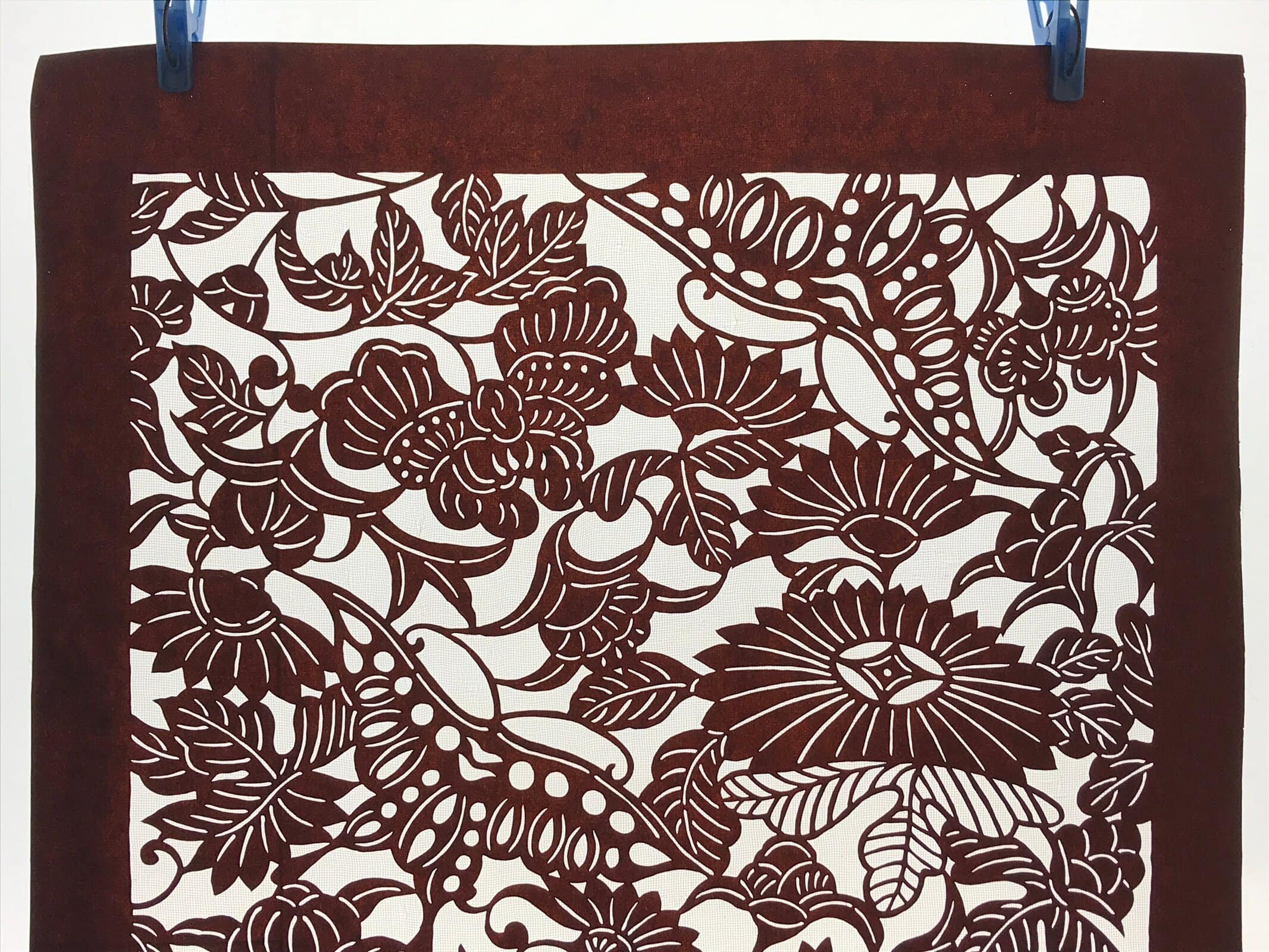 This antique Katagami was designed during the mid or late Edo period (1860) to early Meiji (1900) in Central Japan. It is made of two or more layers of handmade mulberry paper laminated together and waterproofed with persimmon tannin. Katagami printing uses a technique called resist dye where a paste is applied to the fabric with the katagami before dipping in ink. The open space on the katagami will be a negative space in the printed design.
