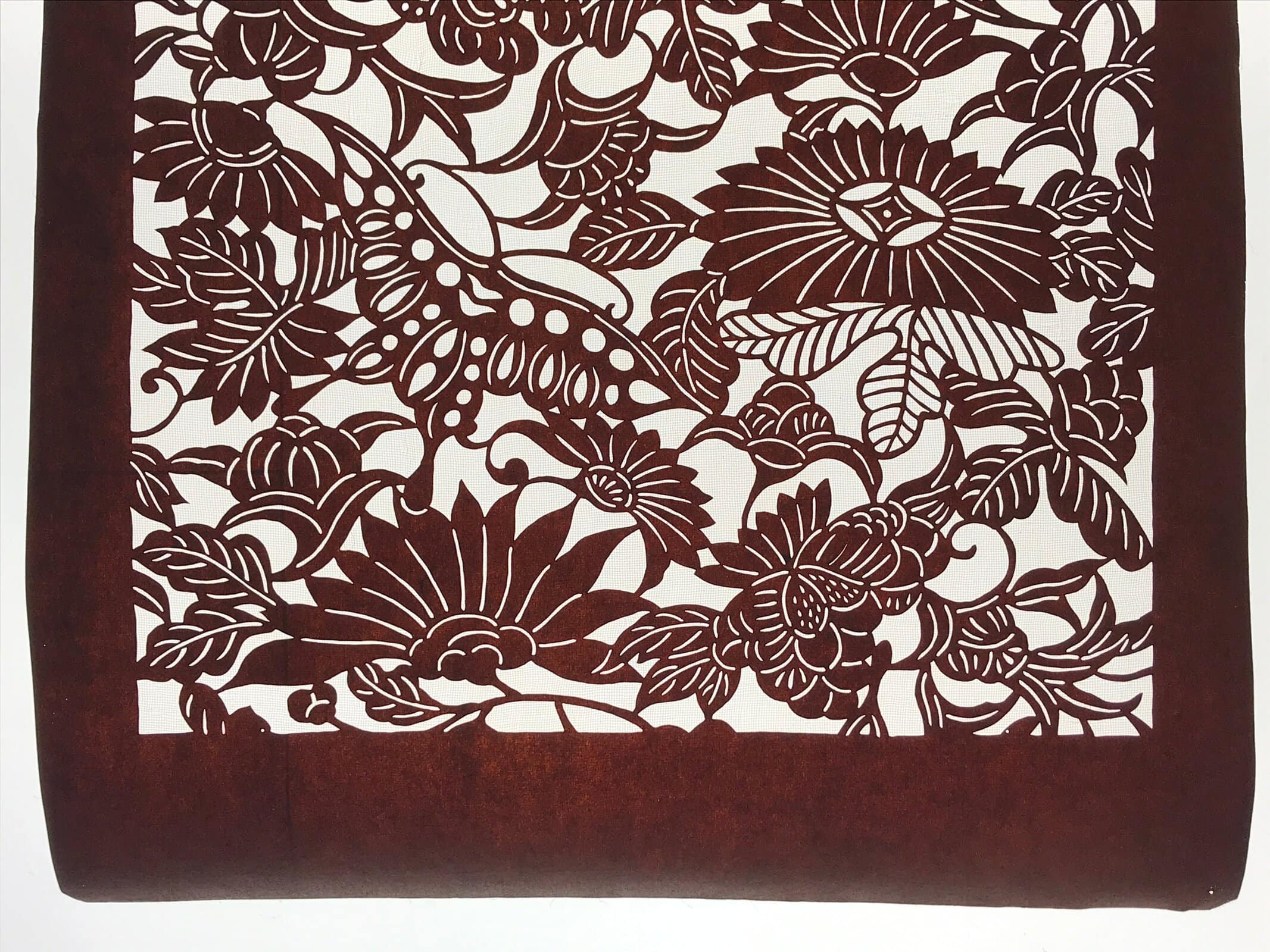 Using traditional mulberry paper, this katagami stencil with silk mesh backing is decorated with wide-winged butterflies and an assortment of flowers.