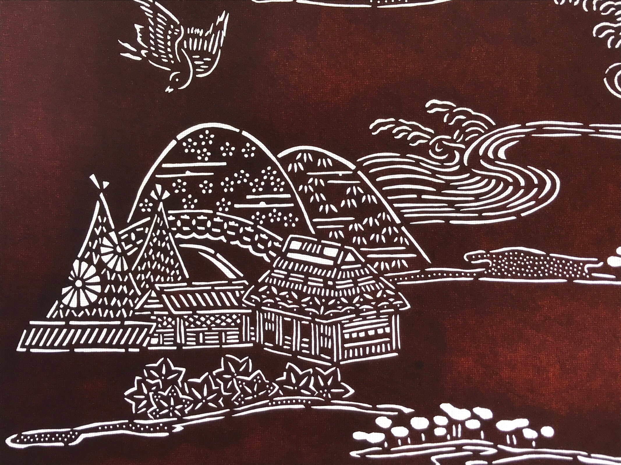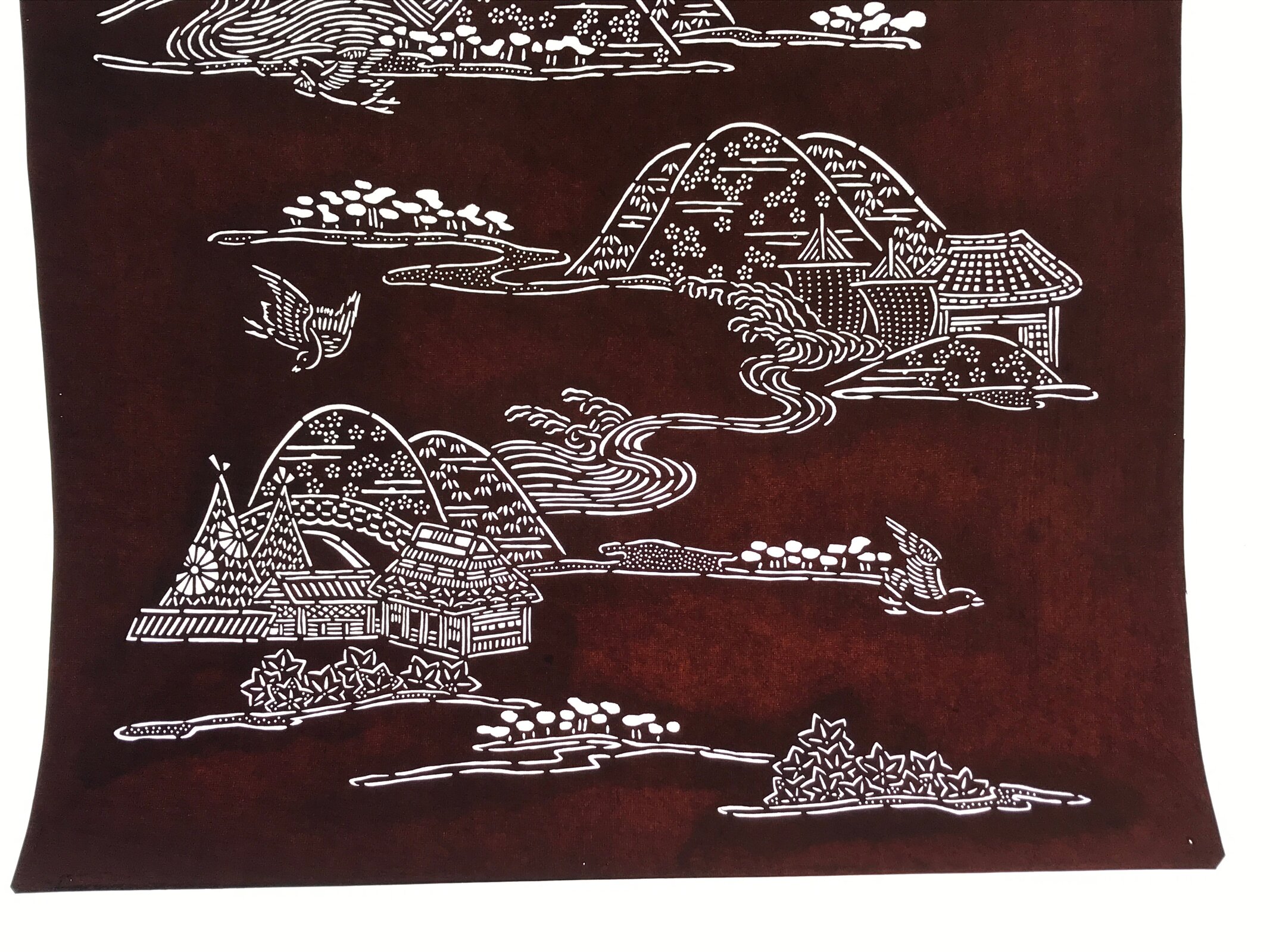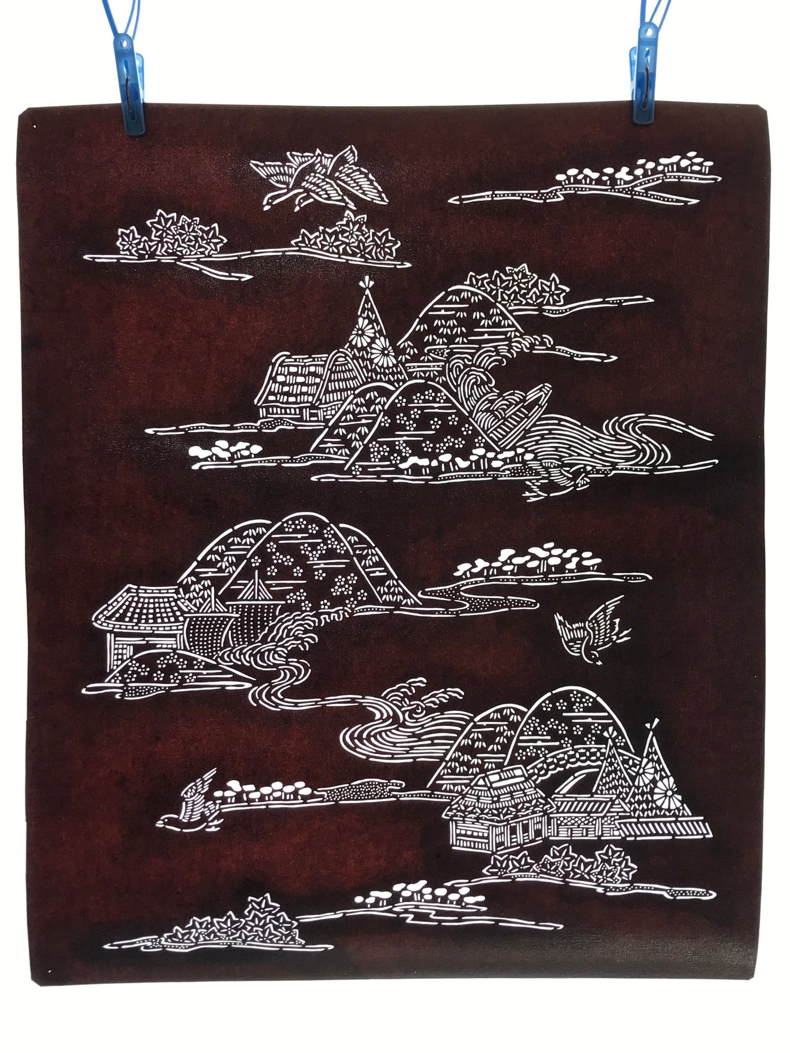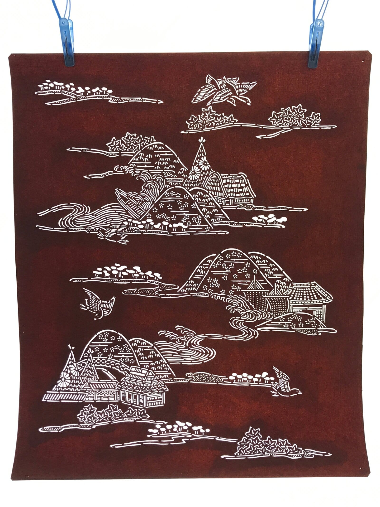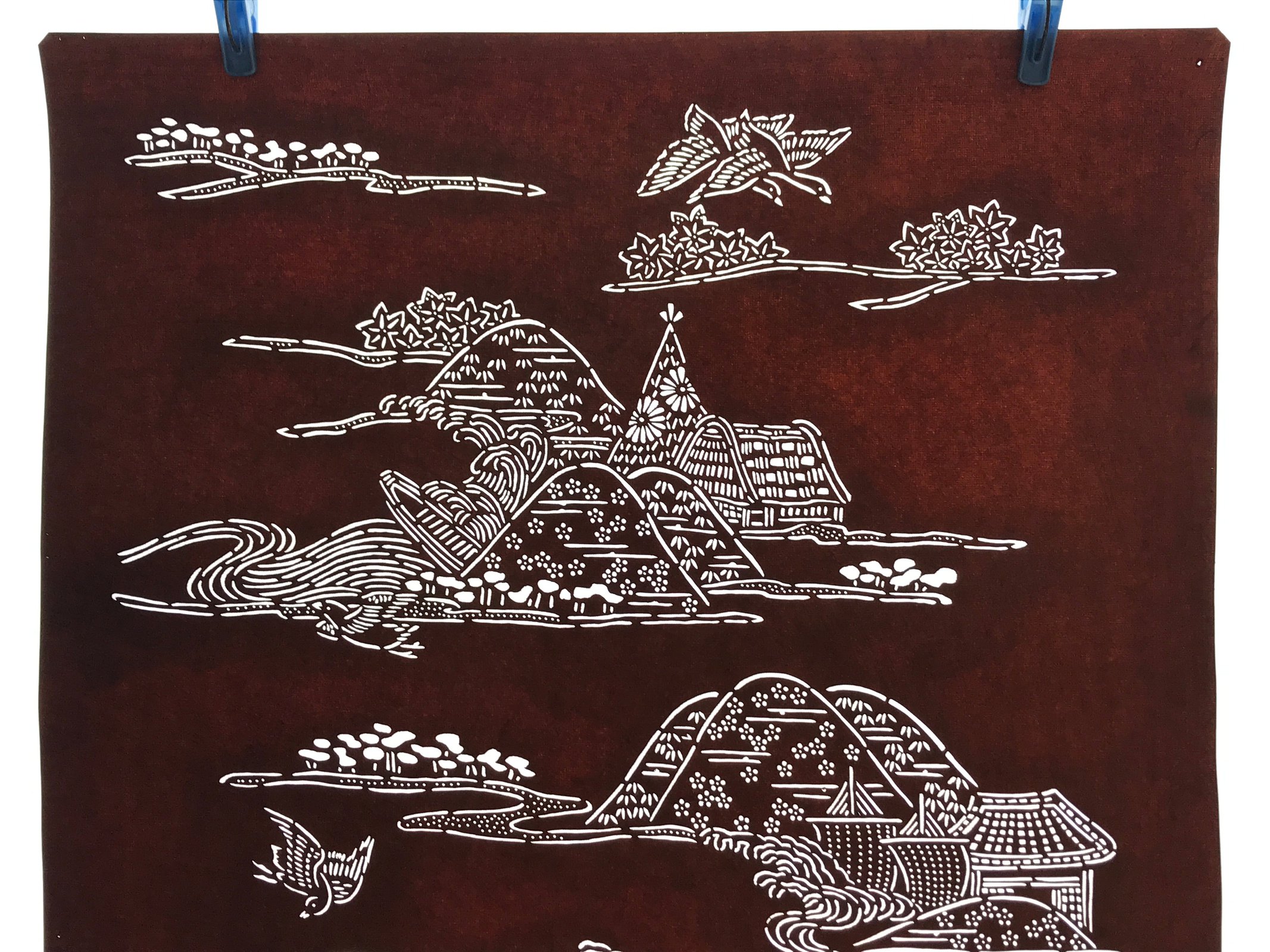 Using traditional mulberry paper, this katagami stencil with silk mesh backing is decorated with a mountainous village scene that includes flowing rivers and soaring birds.