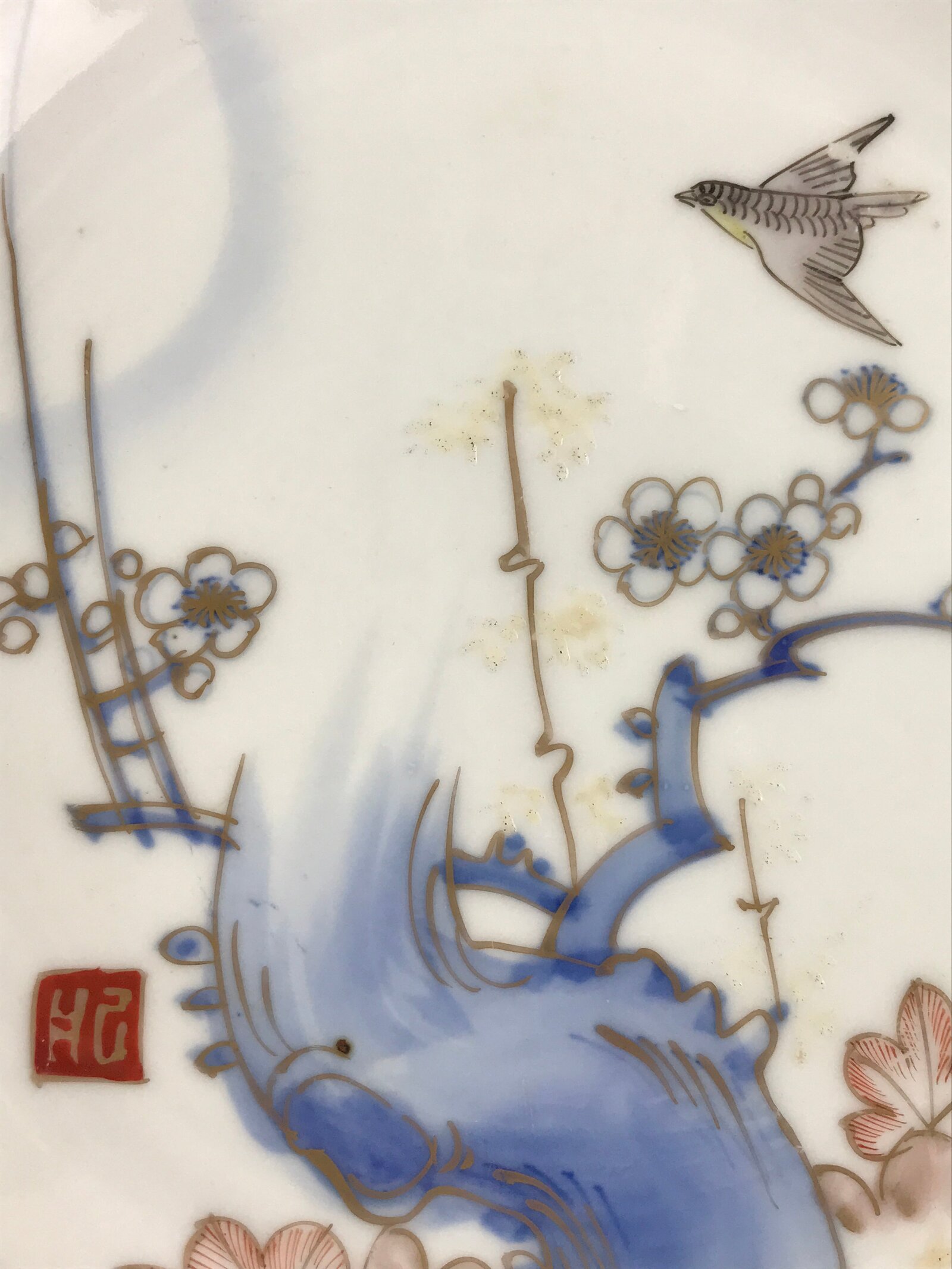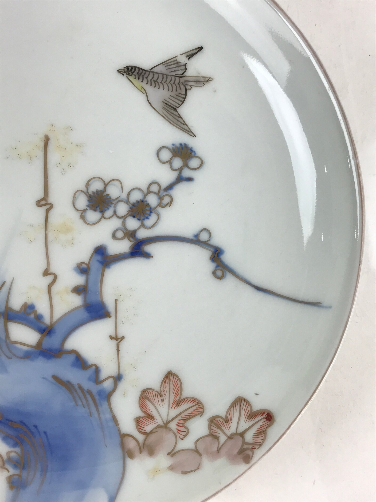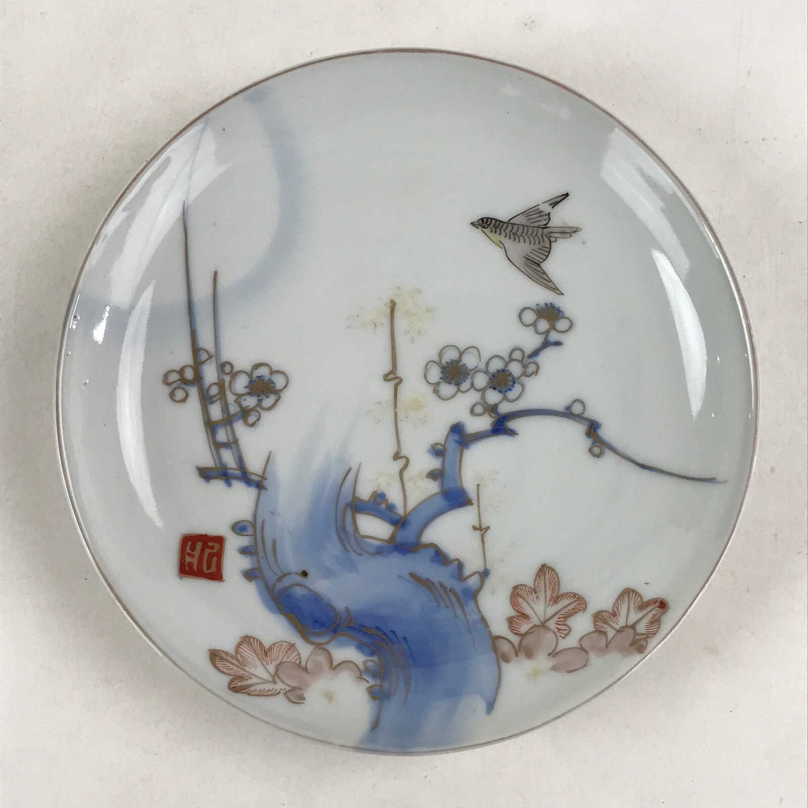 This is an antique side plate (small plate) made in Japan. Plum blossoms and a nightingale (Uguisu) are drawn on the plate, and they are traced in gold. This design is called Imari-Ume. Some distortion is seen in the plate. Because it used firewood instead of gas or electricity like today, the temperature was unstable and it was easy to warp. There are little spots and dust marks (goma) you can see on the plate. This is where the ash fell when it was fired in the kiln. There is a piece of white porcelain (Me-Ato mark) on the bottom.