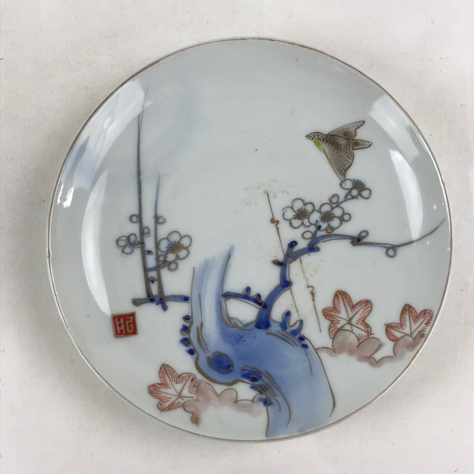 This is an antique side plate (small plate) made in Japan. Plum blossoms and a nightingale (Uguisu) are drawn on the plate, and they are traced in gold. This design is called Imari-Ume. Some distortion is seen in the plate. Because it used firewood instead of gas or electricity like today, the temperature was unstable and it was easy to warp. There are little spots and dust marks (goma) you can see on the plate. This is where the ash fell when it was fired in the kiln. There is a piece of white porcelain (Me-Ato mark) on the bottom.