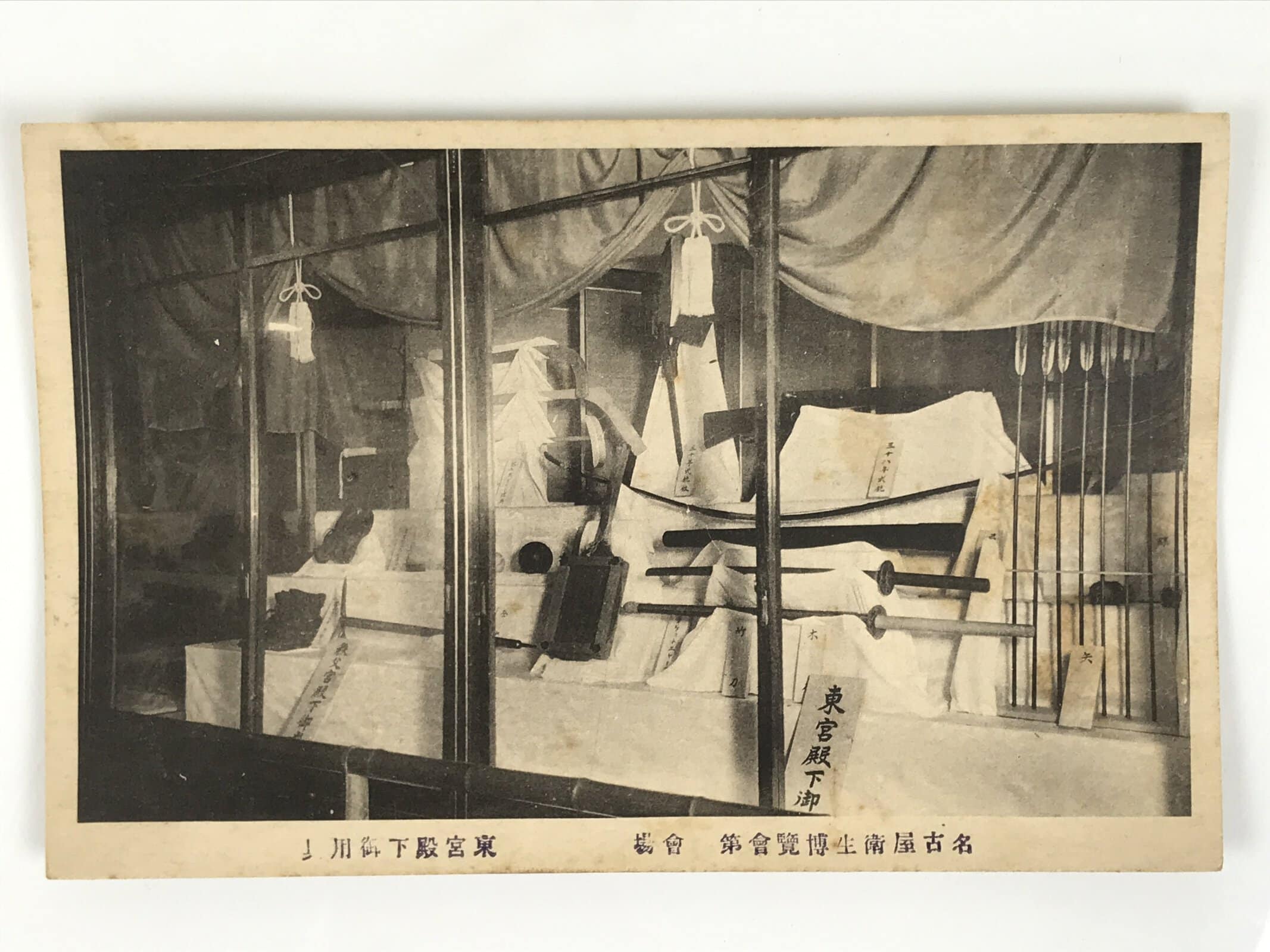 This antique Japanese postcard features a black-and-white photograph from the 1926 Nagoya Public Health Exhibition. This postcard features a showcase with Japanese swords (katana) and arrows. Based on the caption, these items belong to ‘His Imperial Highness’, likely the to-become Showa Emperor.