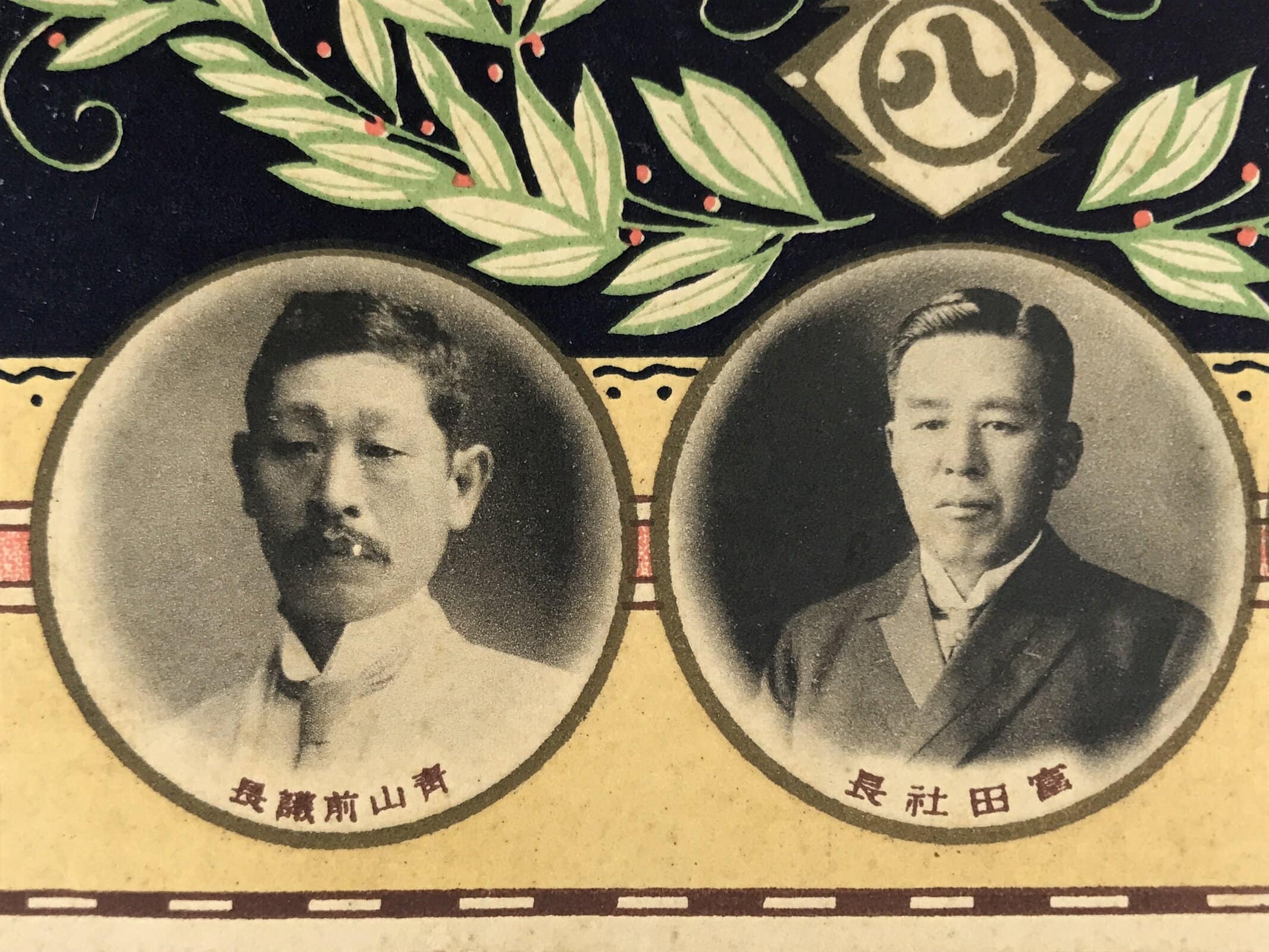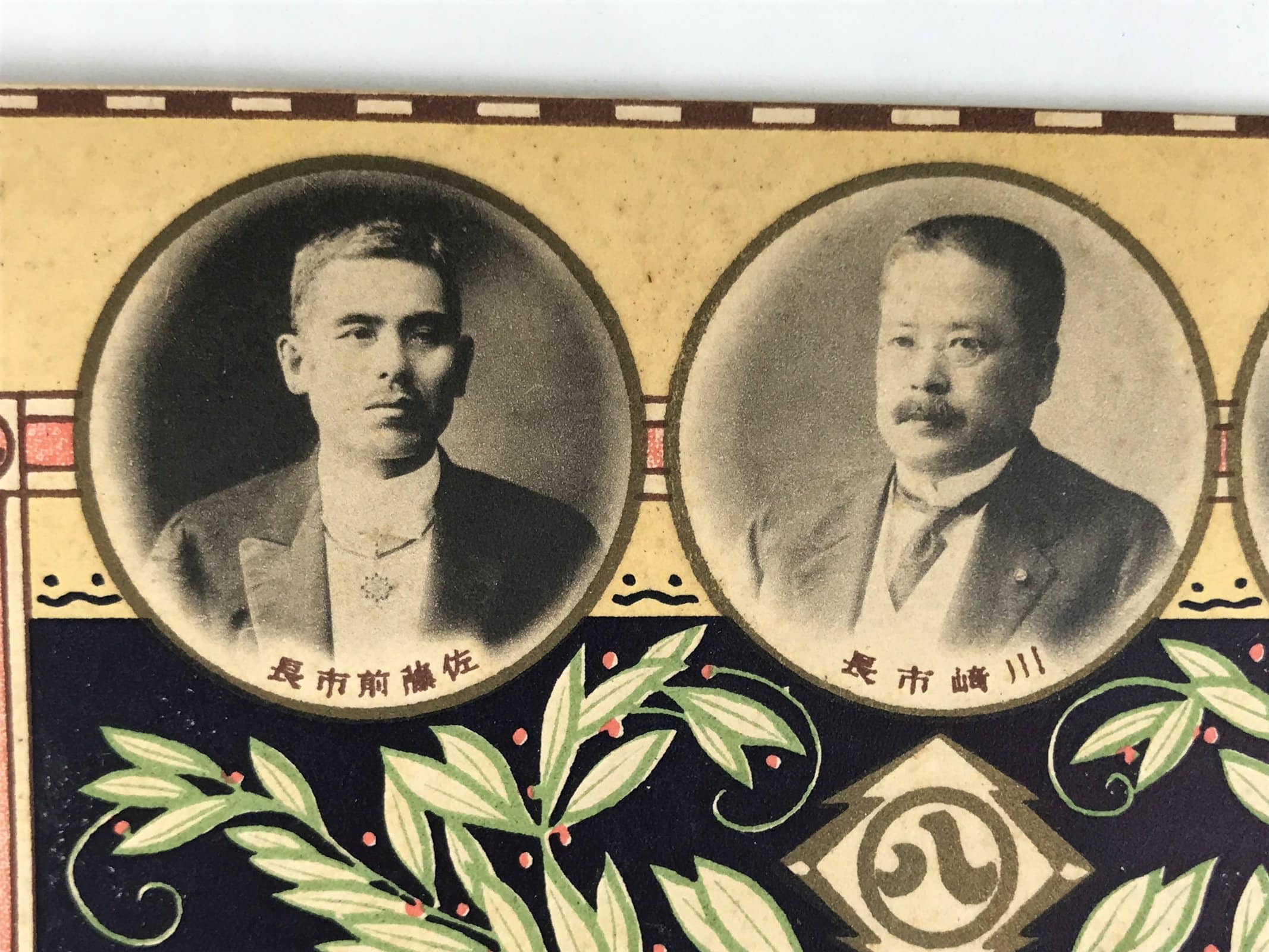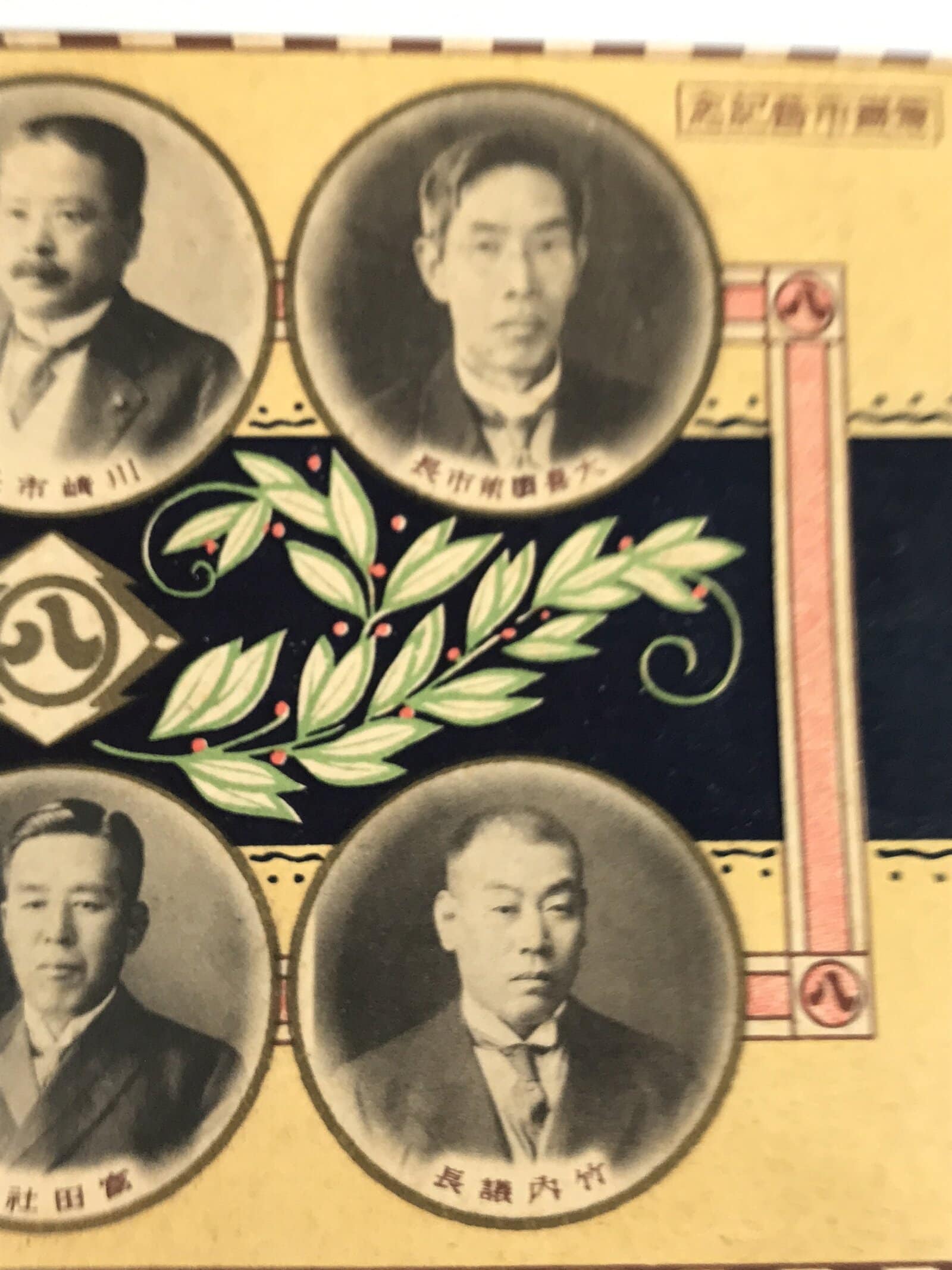 This antique Japanese postcard features black-and-white portraits of former and (at the time) current mayors of Nagoya and other important people. It is a commemorative postcard for the municipalization of the railway. The background features foliage and the Nagoya City symbol.