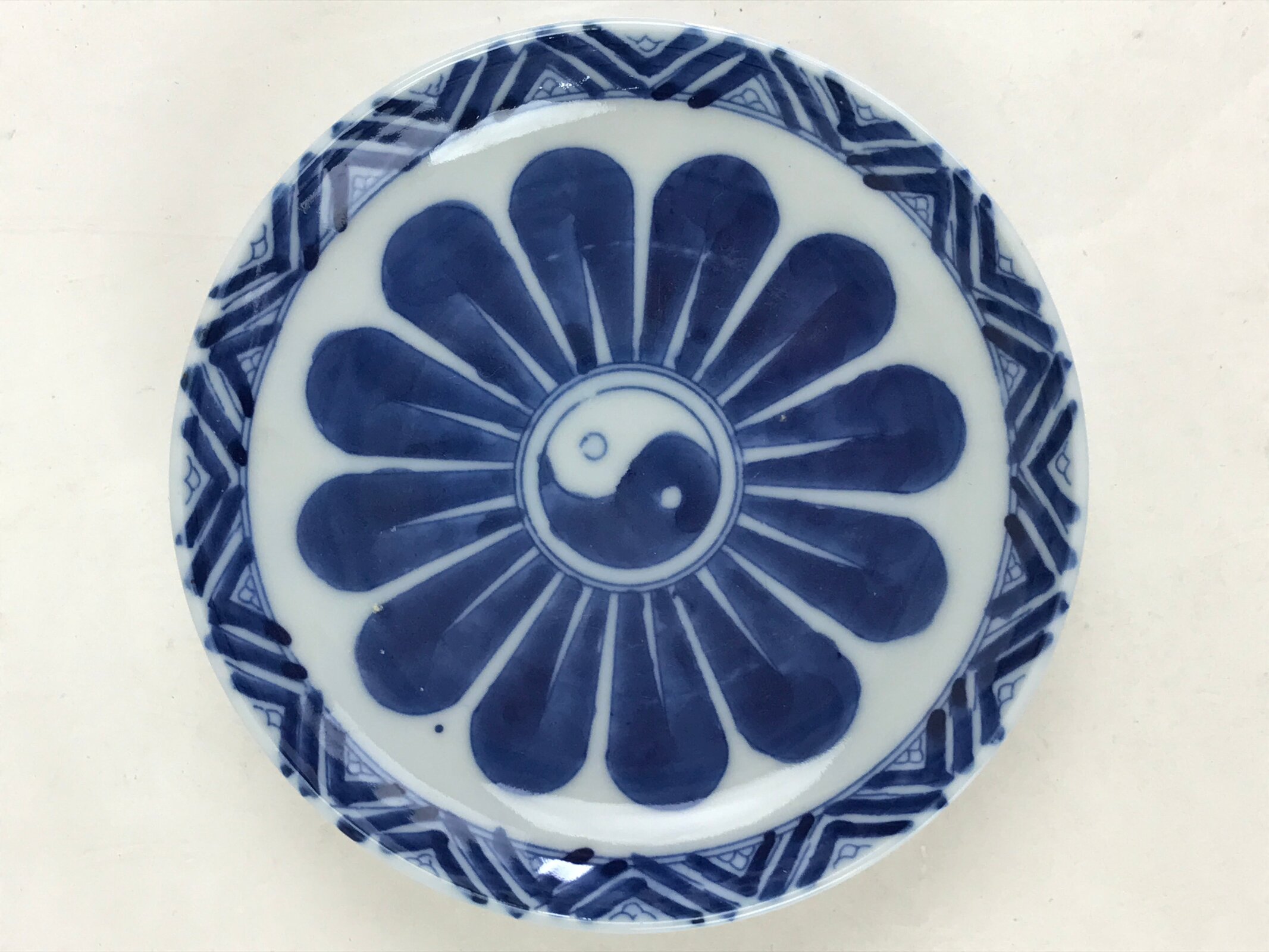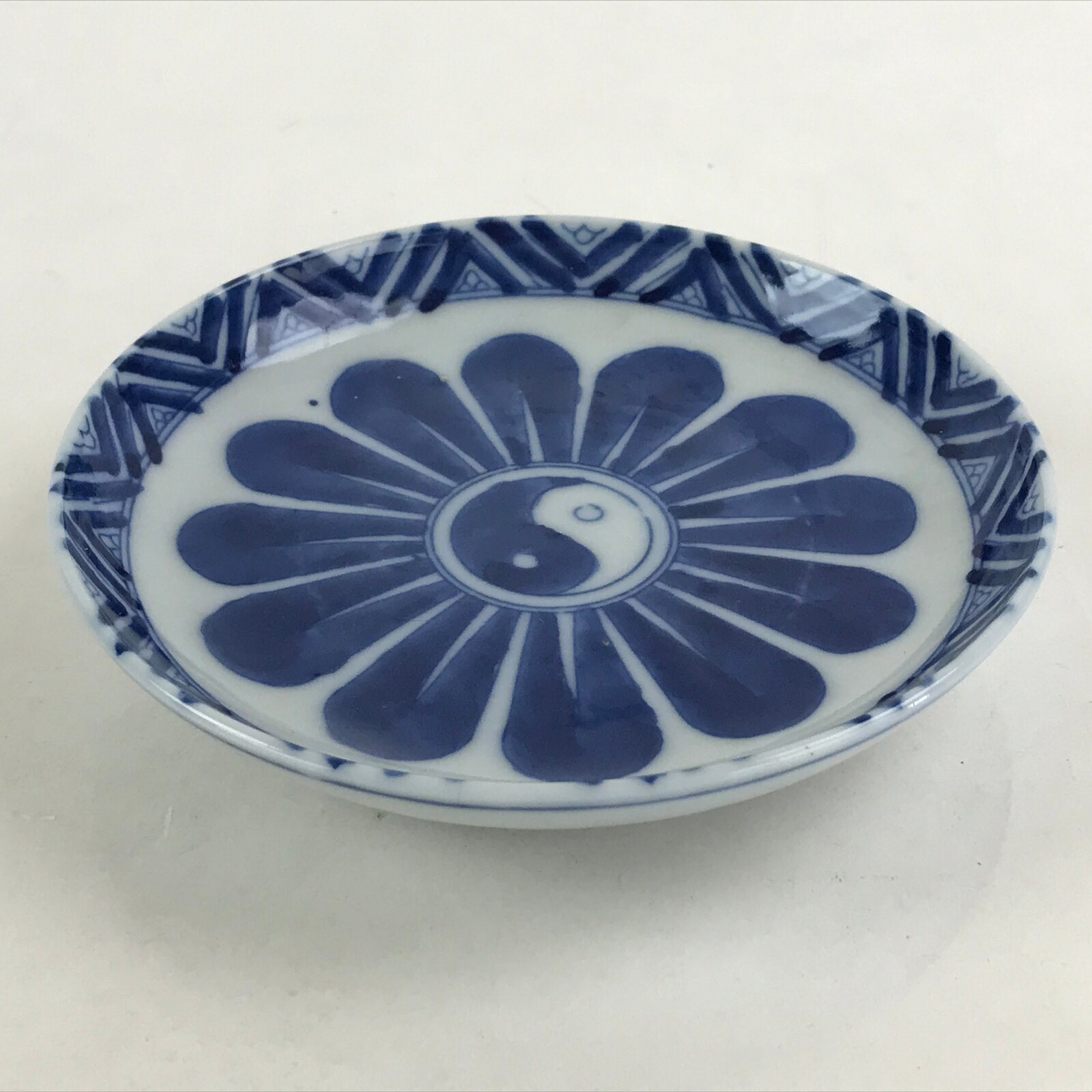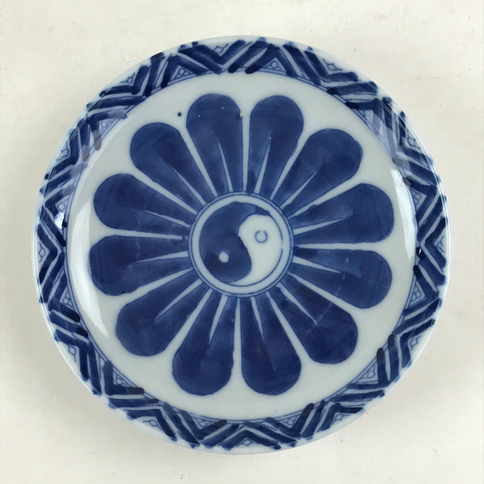 This is an antique Japanese small bowl or side plate (Kozara). There is a blue Sometsuke of flower design in the middle of the plate. The center of the flower has a mark that looks like yin and yang. Little distortion is seen in the plate. Because it was fired with firewood instead of gas or electricity as it is today, the temperature was not stable and easy to warp. It’s a good plate to put small food or sweets such as cakes.