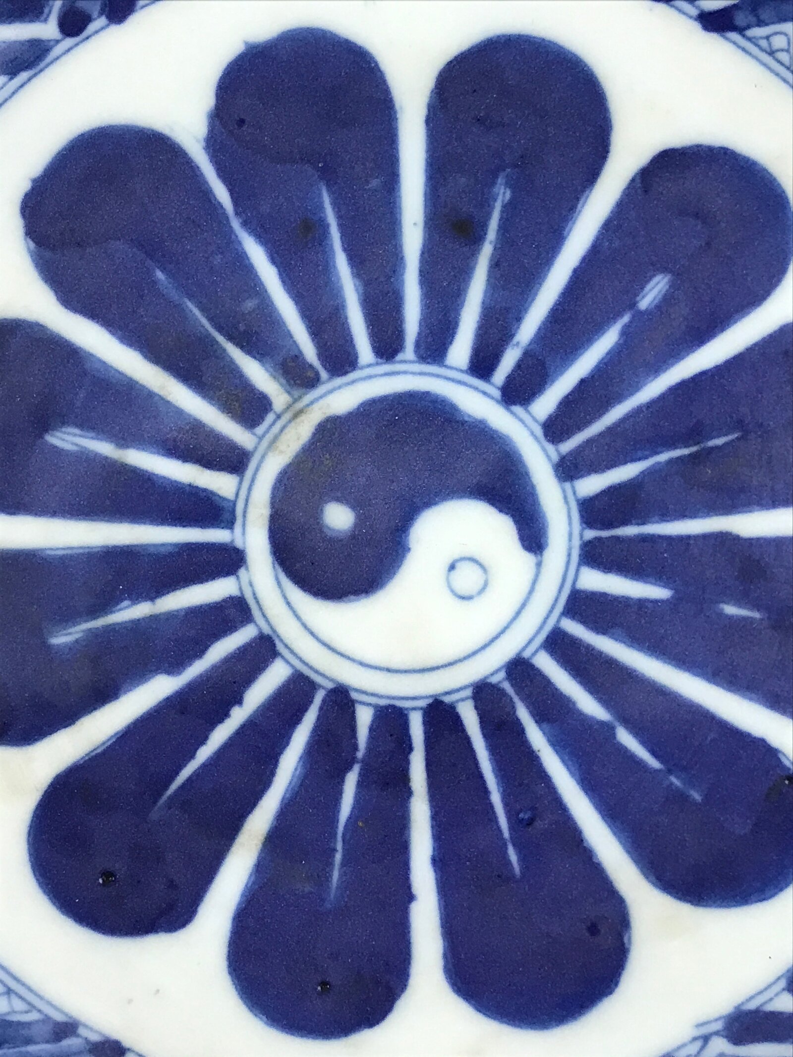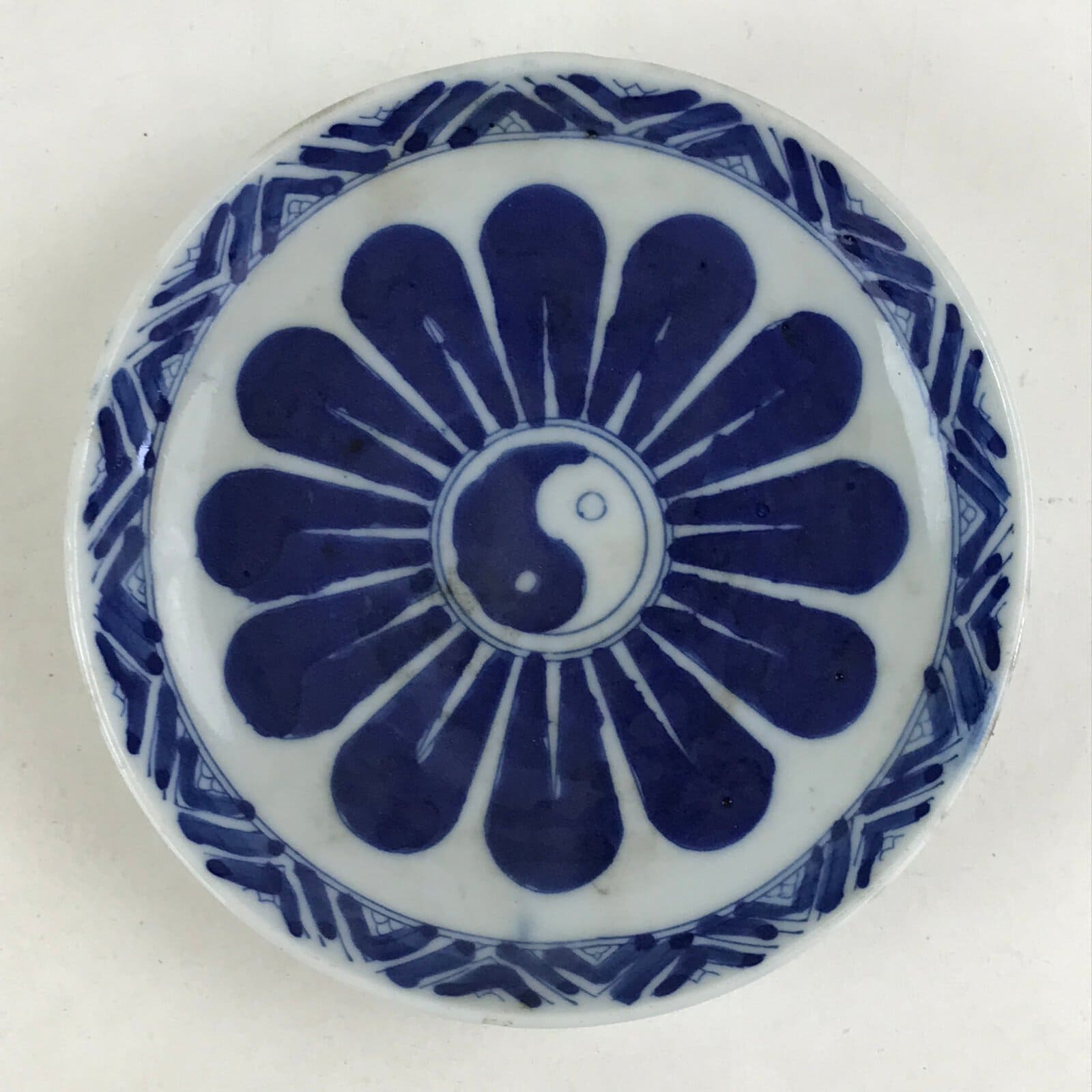 This is an antique Japanese small bowl or side plate (Kozara). There is a blue Sometsuke of flower design in the middle of the plate. The center of the flower has a mark that looks like yin and yang. Little distortion is seen in the plate. Because it was fired with firewood instead of gas or electricity as it is today, the temperature was not stable and easy to warp. It’s a good plate to put small food or sweets such as cakes. There are Goma (sesame) spots and dust marks. The traces of sesame and dust are the places where the ash fell when it was fired in the kiln.