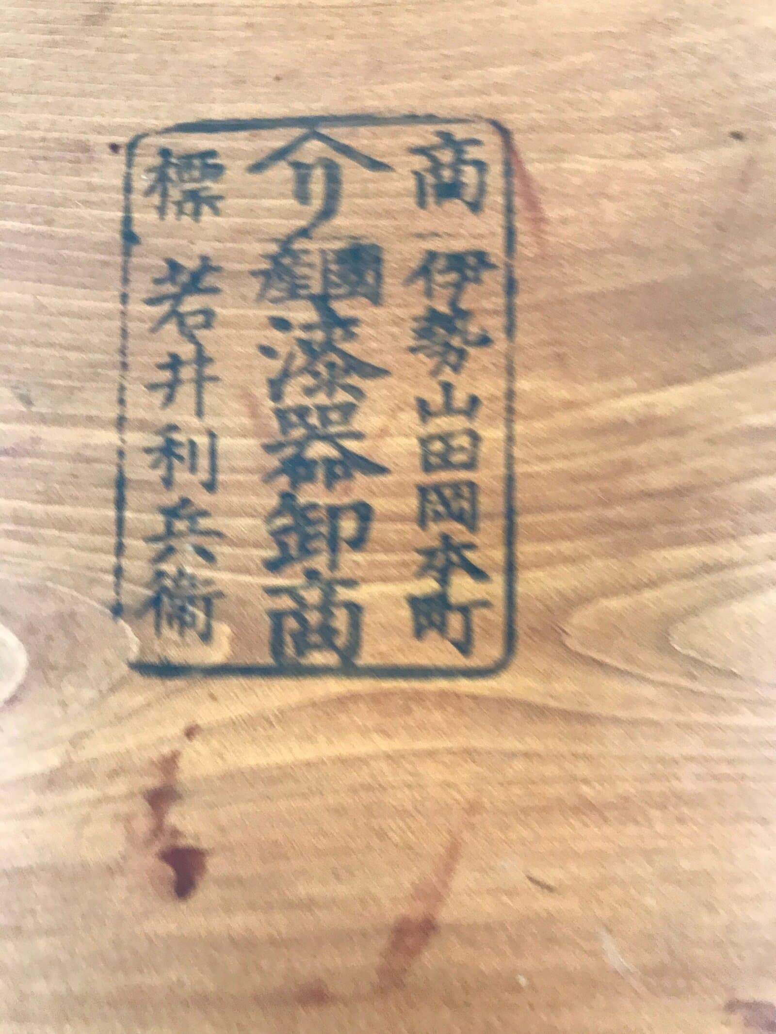 - Characters on the bottom: 商標 伊勢山田岡本町 ise yamada okamotomachi placename, 國産 kokusan domestic, 漆器卸商 lacquerware distributor, 若井 利兵衛 wakai rihee male name