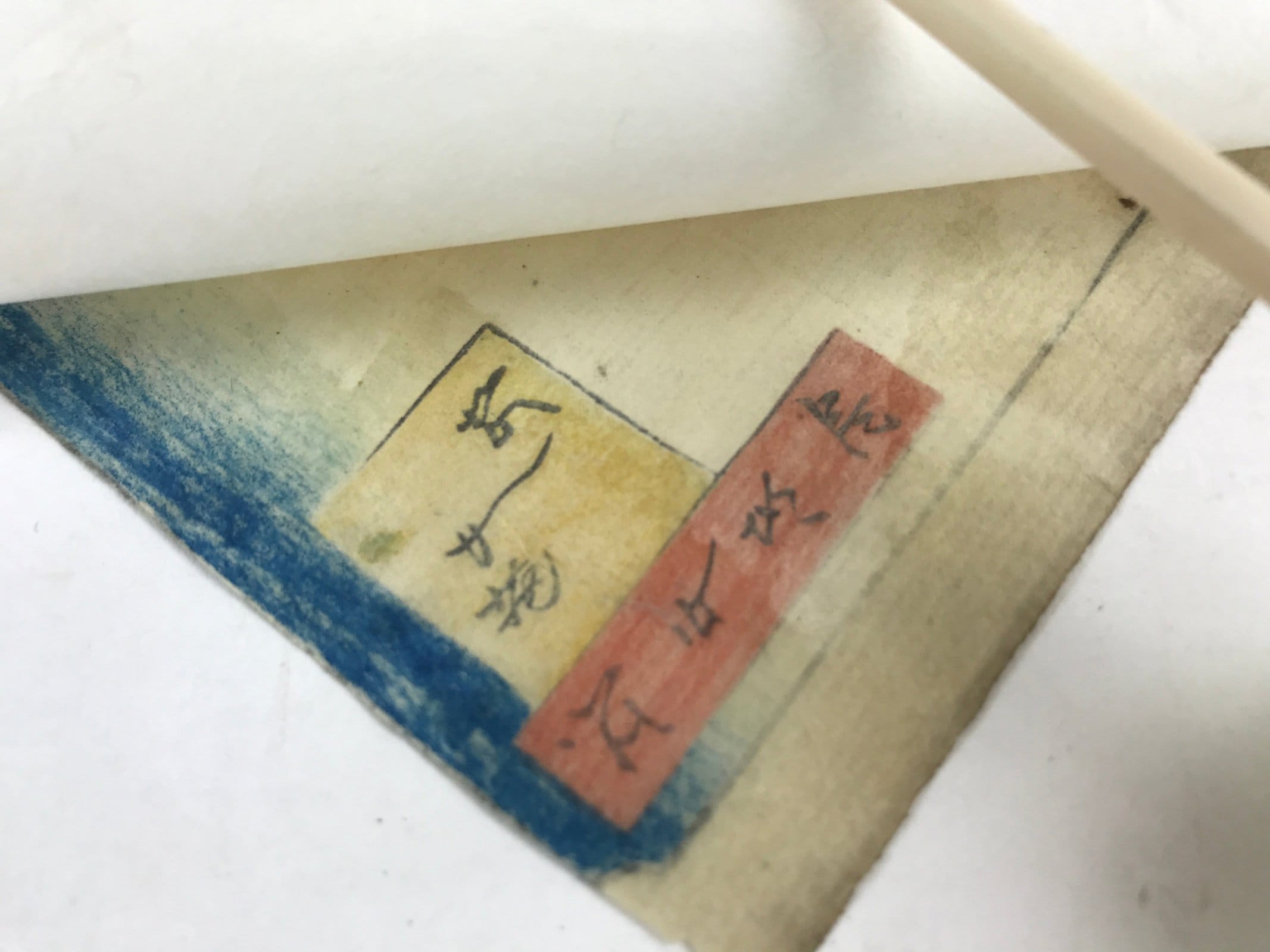 - Good condition considering its age. Stains and color bleeding. Paper discoloration. Bottom left and right corners are damaged. Wear and tear due to age. It appears that this print had been vertically cut in two halves before being adhered to a thin piece of paper. Please see the photos.