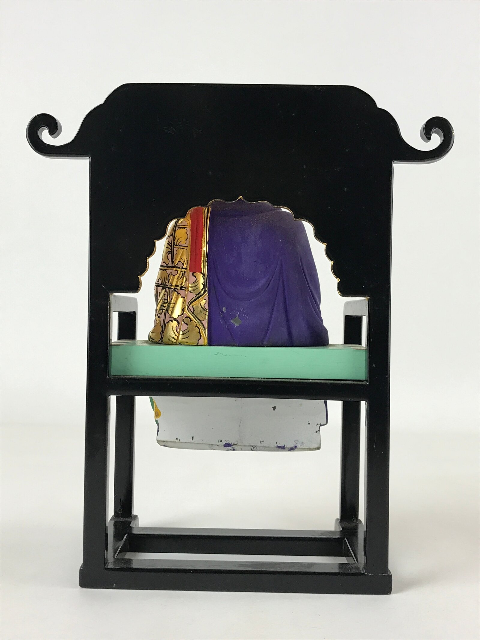 This is a Japanese vintage carved wood figurine of Keizan (or Taiso Josai Daishi), founder of the Soto school of Zen in Japan. This wooden figurine is painted in purple and green, and has embellishments in gold color. The figurine is sitting on a lacquered wood stand in a classic Buddhist black and gold style.