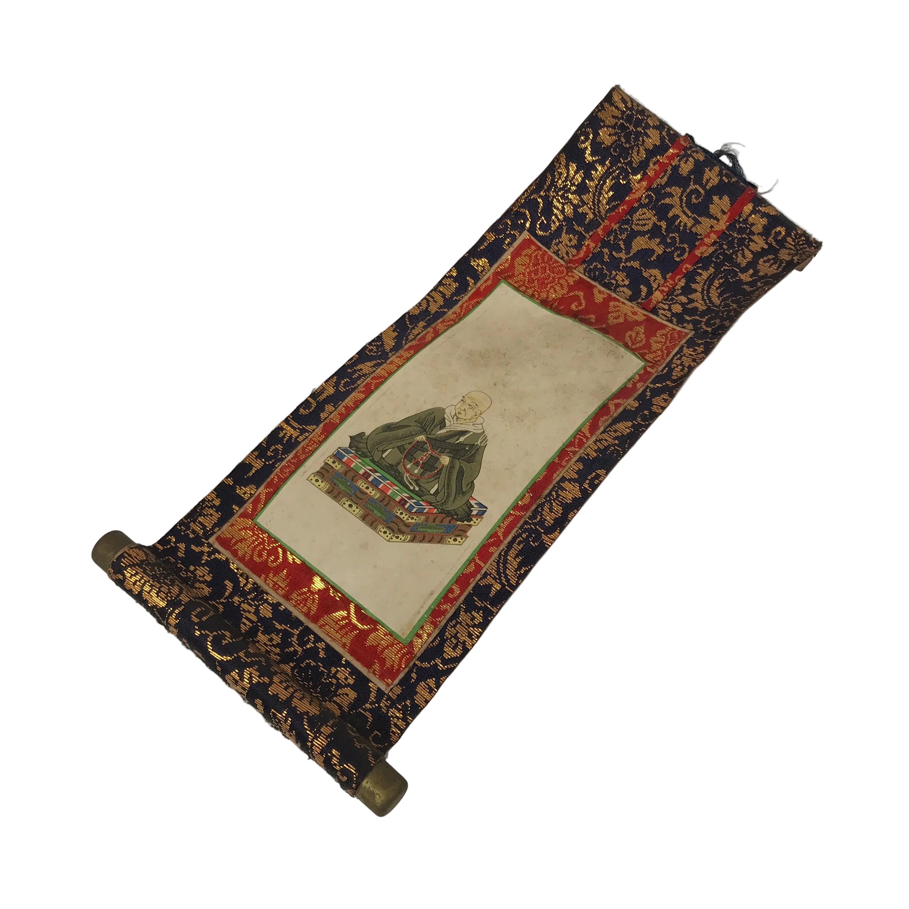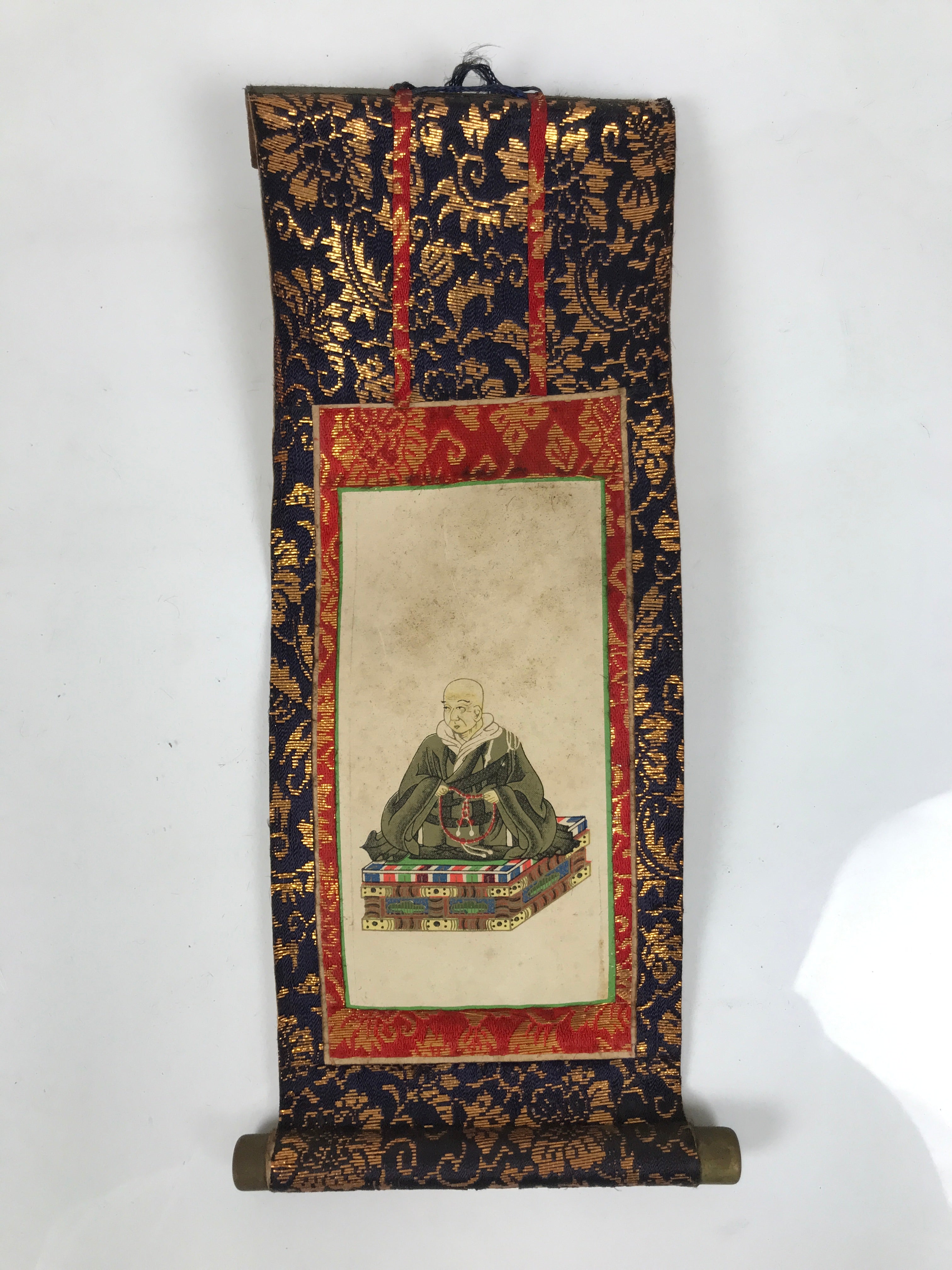 This Japanese vintage paper hanging scroll (kakejiku) features an image of Shinran, a Buddhist monk founder of the Jodo Shinshu sect. It is a side scroll, or wakigake, part of a pair of scrolls to be displayed on each side of a central scroll or a statue. It is a powerful religious image, aimed to be at the center of an altar. This kakejiku is dark blue and red with a gold floral pattern. The image is black, gray, green, blue, and red.