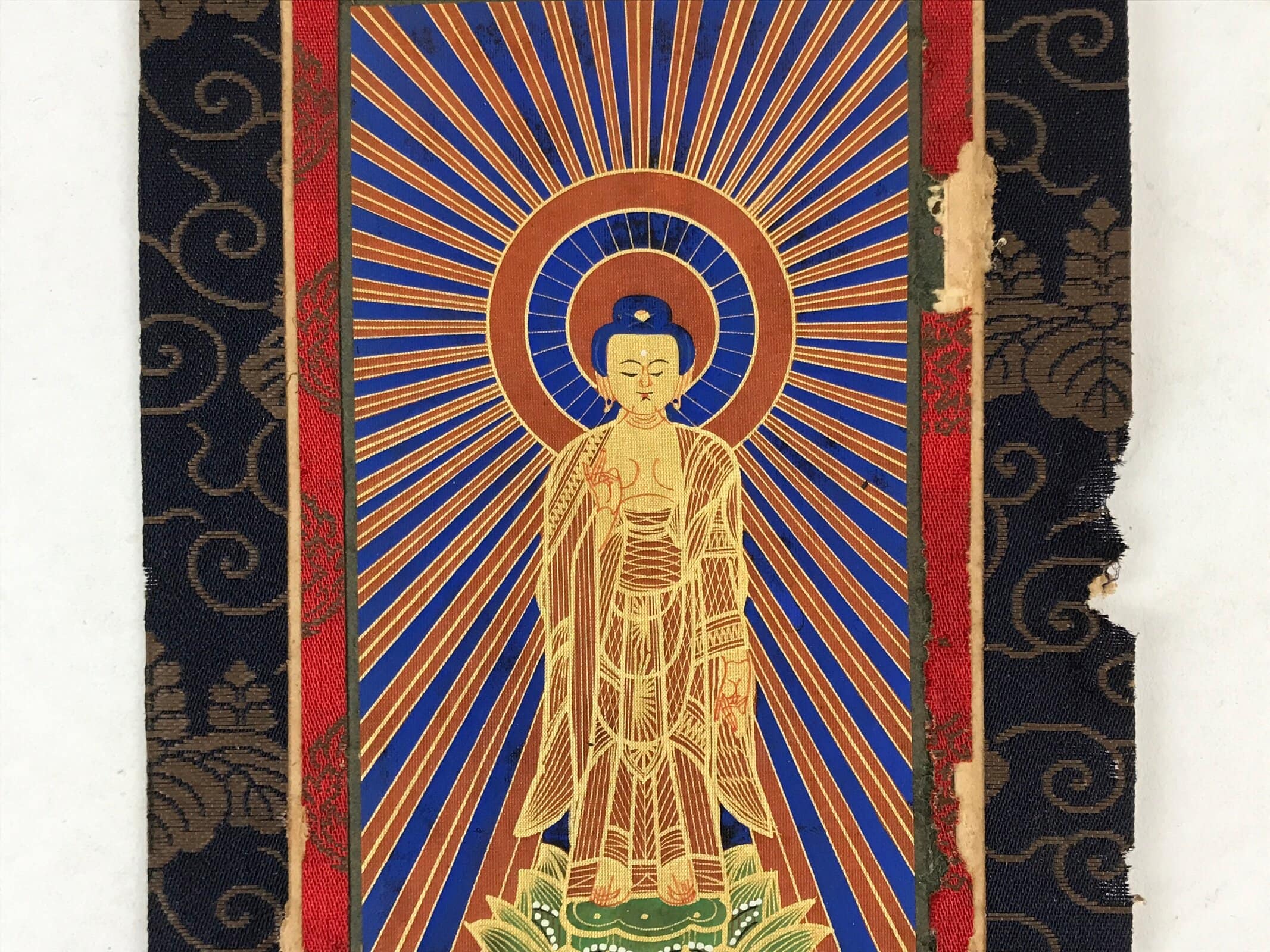 This is a Japanese vintage fabric and paper hanging scroll representing Amida Butsu in its Hoben Hoshin form. It is an icon displayed in Japanese Buddhist home altars, Butsudan. It is a powerful religious image, aimed to be at the center of an altar. The scroll is gold and dark blue with red accents. It is embellished with metal parts on the top and bottom and has inscriptions on the back.