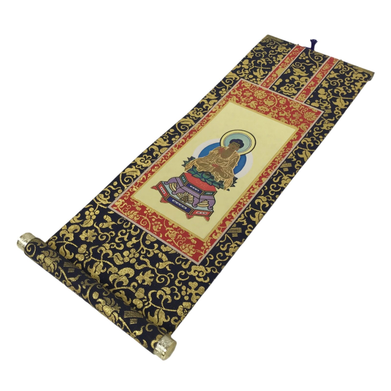 This Japanese vintage paper hanging scroll (kakejiku) features an image of the Buddha, Shaka Nyorai in Japanese. It is a central scroll, or gohonzon, a powerful religious image, aimed to be at the center of an altar. This kakejiku is for the Soto and Rinzai schools, two Zen Buddhist schools. It is dark blue and red with a gold floral pattern. The image is yellow, brown, blue, green, red, and purple.