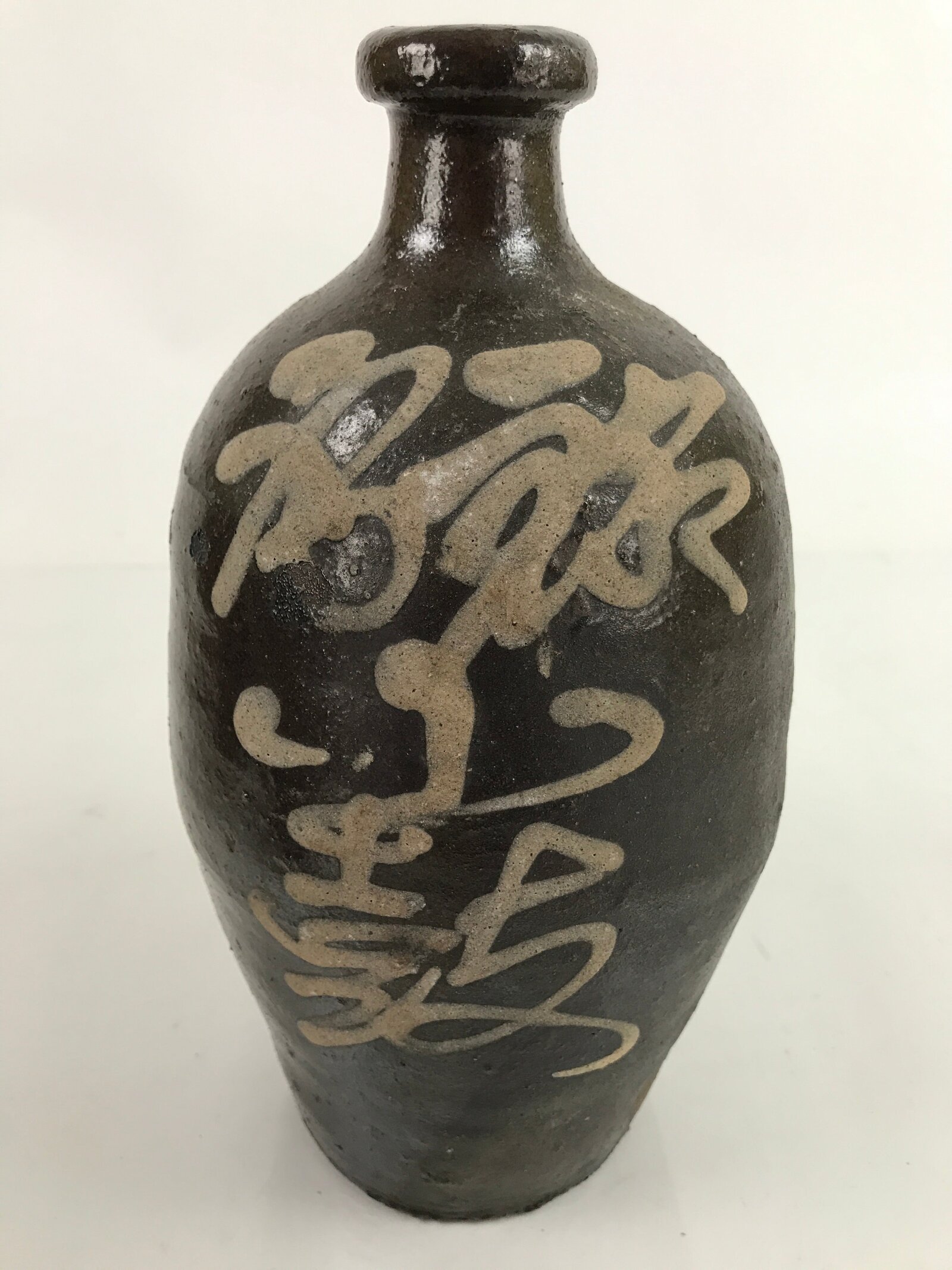 This is an antique Japanese ceramic sake bottle. It is called a Kayoi-Tokkuri and is used to pour sake. The commuting sake bottle became popular as a rental container for liquor stores in the Edo period when sake began to be consumed on a daily basis. This period bottle is brown with some beige Japanese kanji characters on the outside.