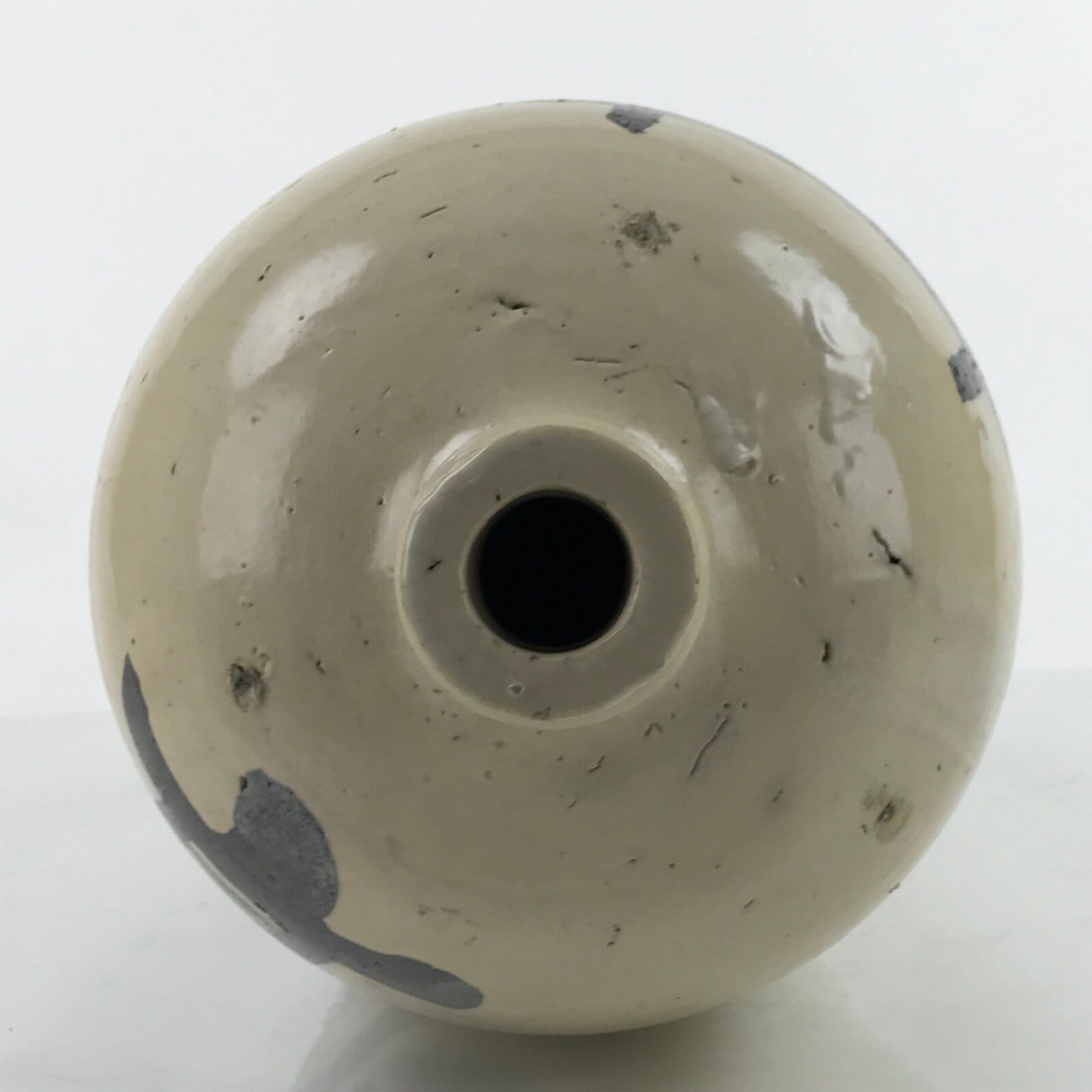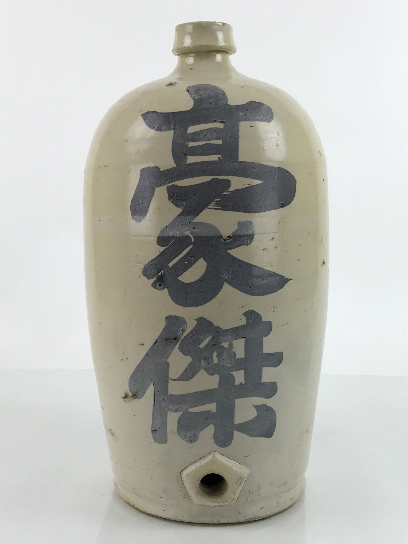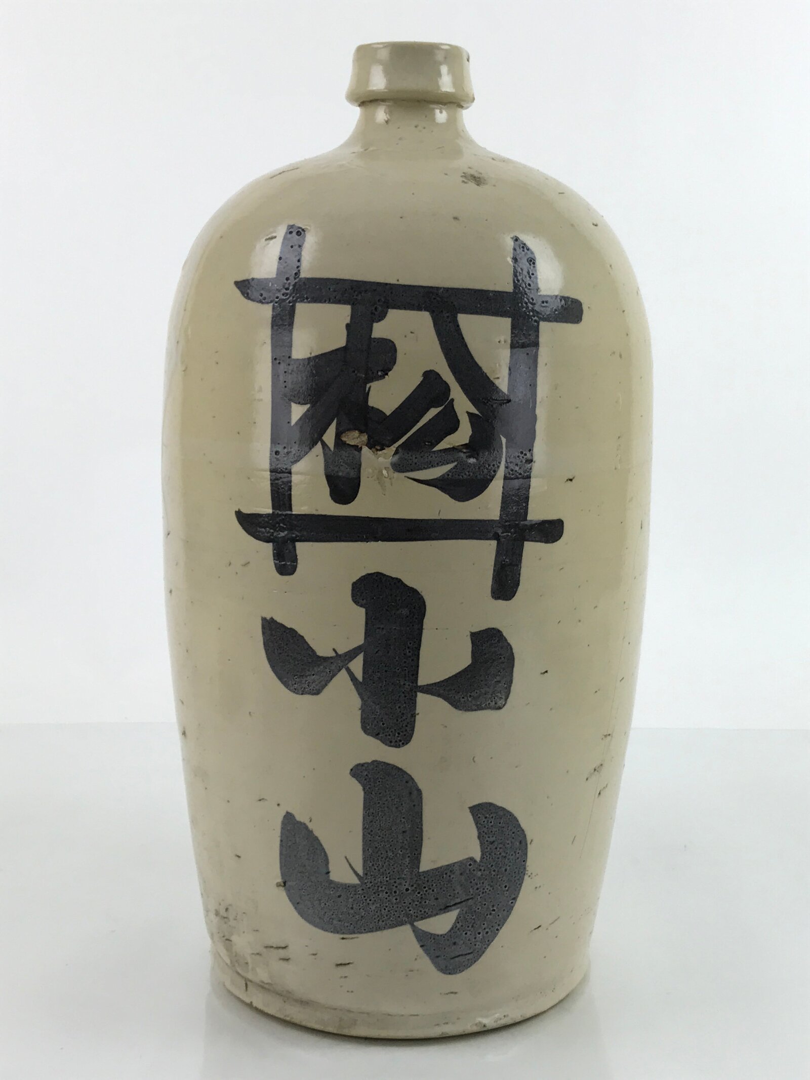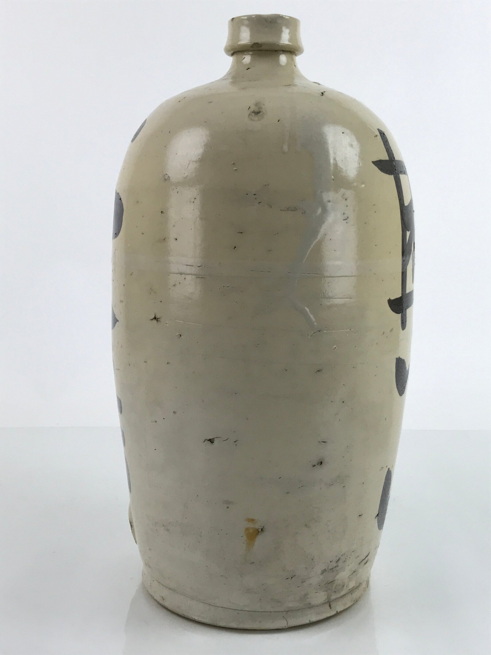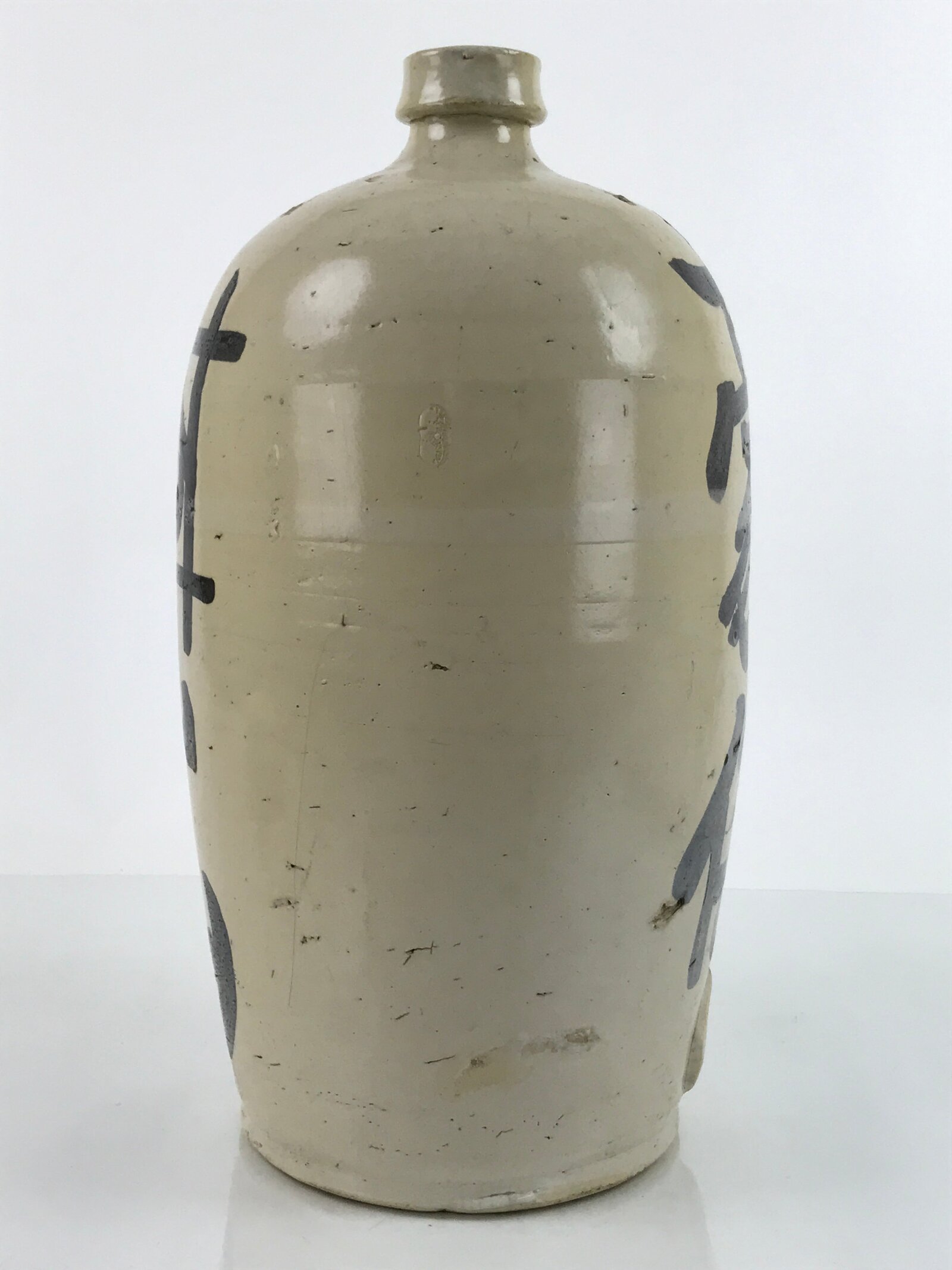 This is an antique Japanese ceramic sake bottle. It is called a Kayoi-Tokkuri and is used to pour sake. The commuting sake bottle became popular as a rental container for liquor stores in the Edo period when sake began to be consumed on a daily basis. This period bottle is grayish beige with some black Japanese kanji characters on the outside. There is a spout hole on the bottom to facilitate the pouring of sake.