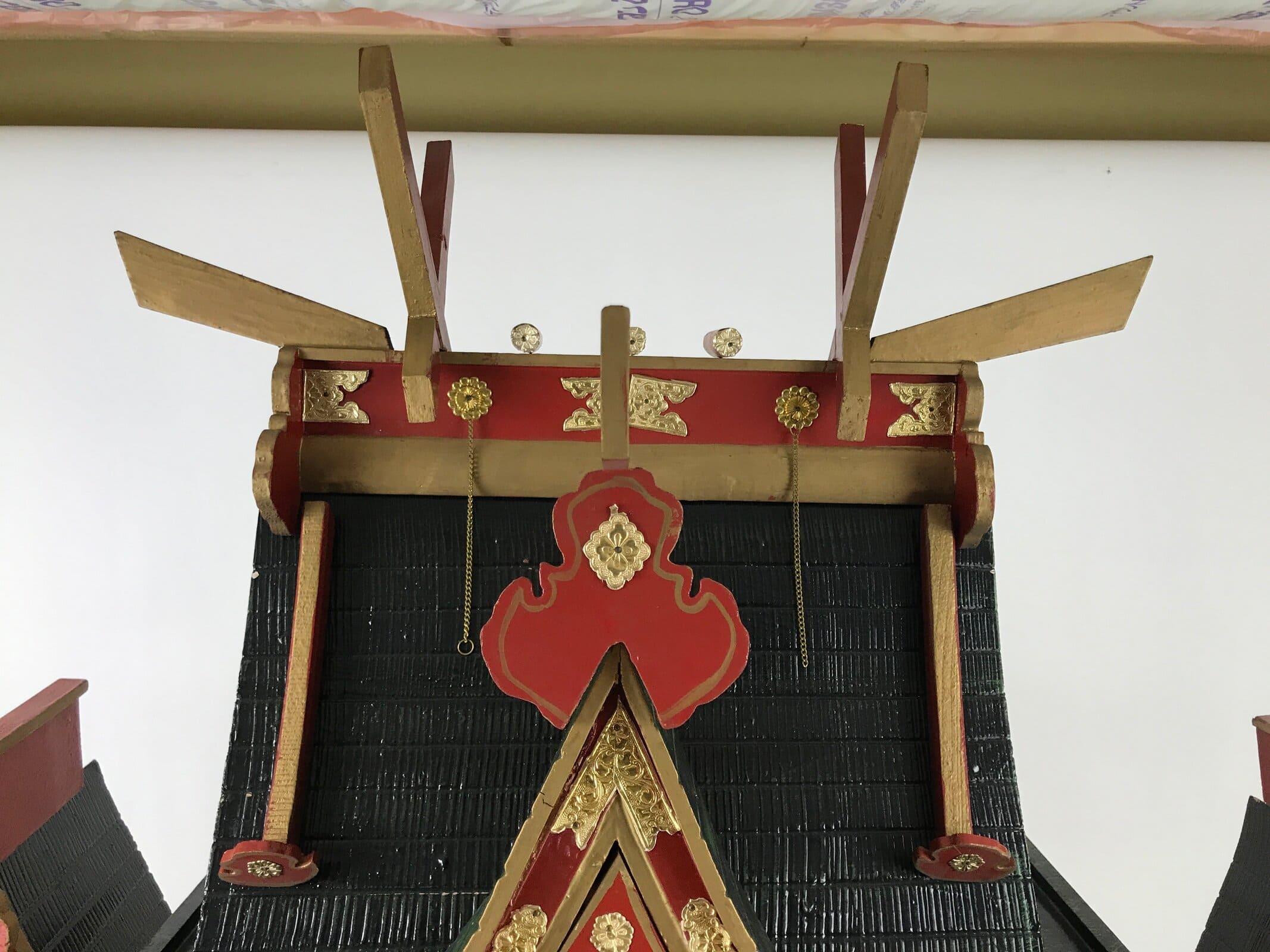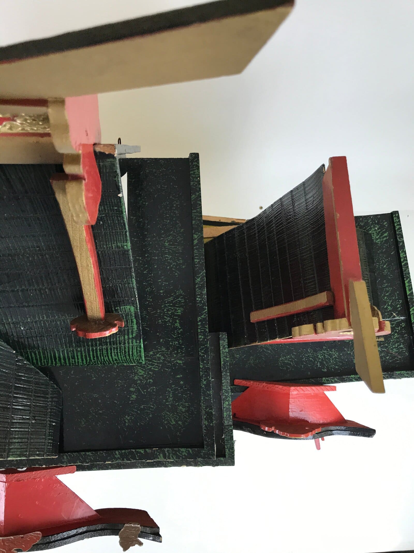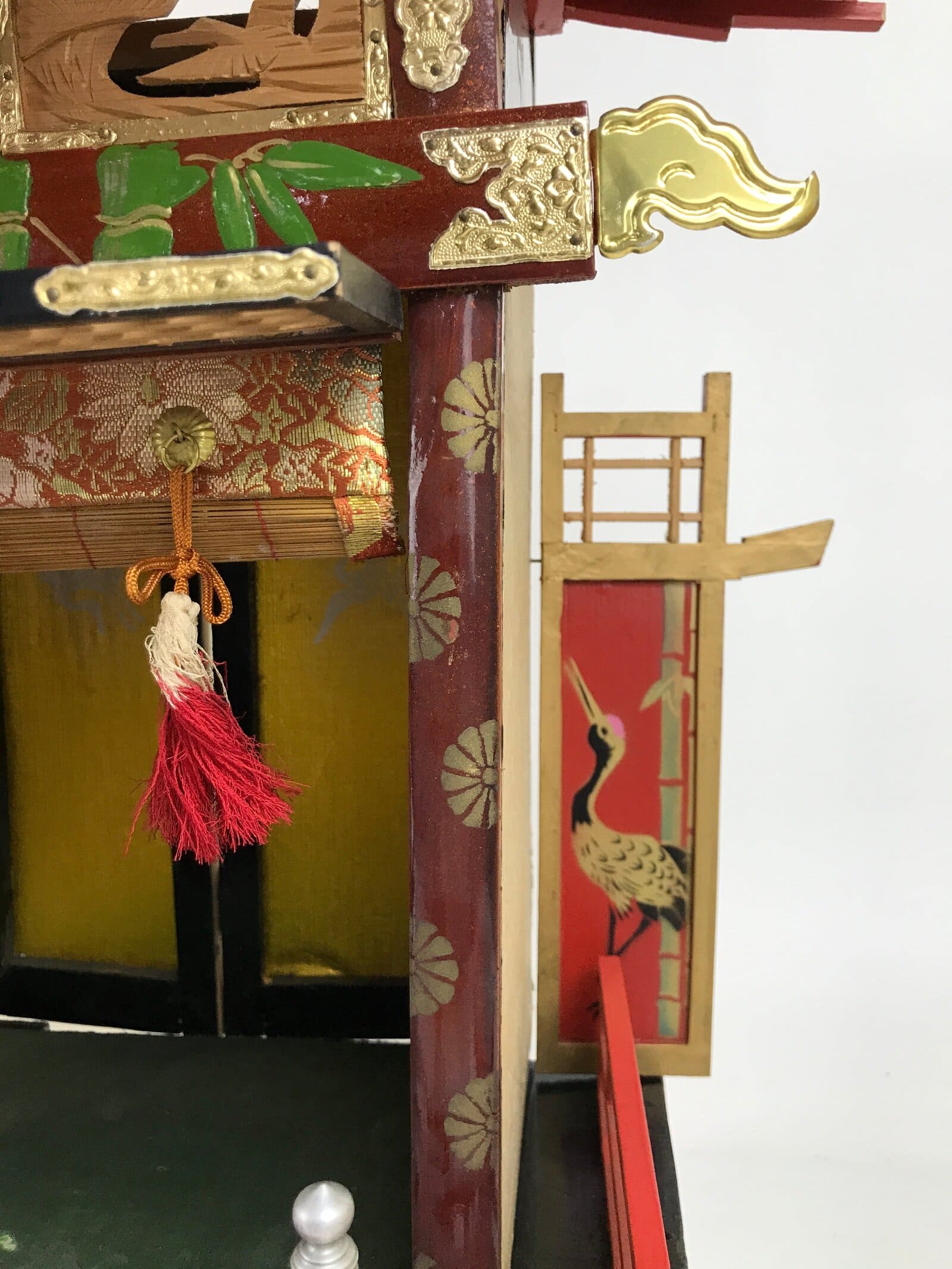 - Good condition considering age. Some pieces of the underside of roof have broken off (collected in plastic bag), byobu screens on back wall have a couple holes on back side, scratches and wear on lacquer paint from use. Wooden box has some damage around edges. Wear and tear due to age.
