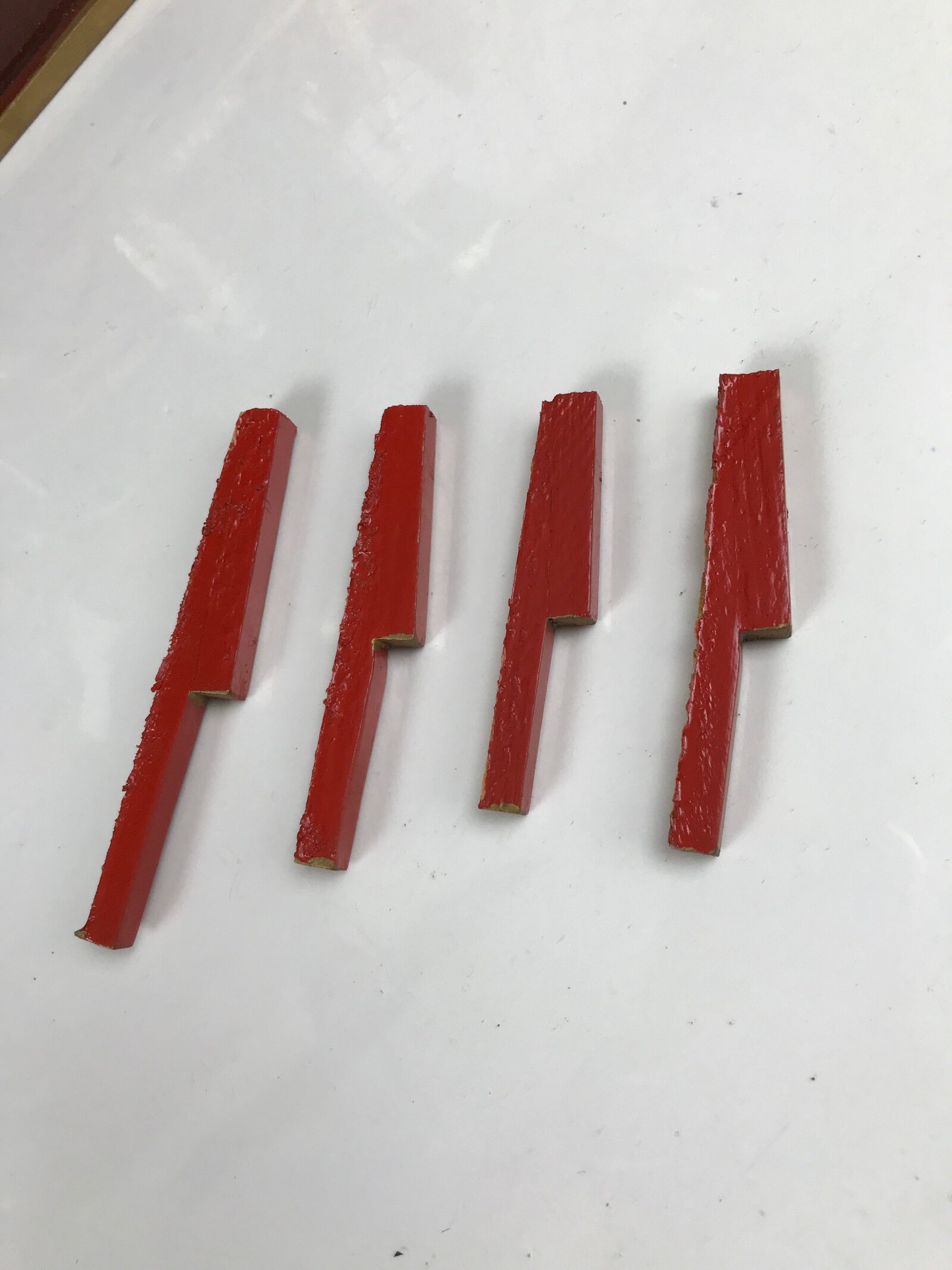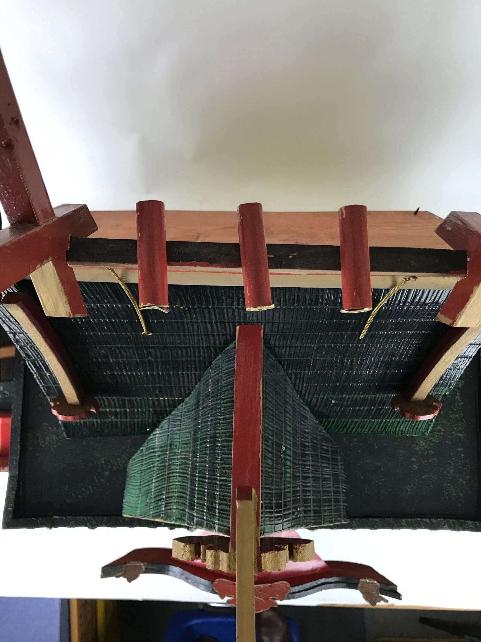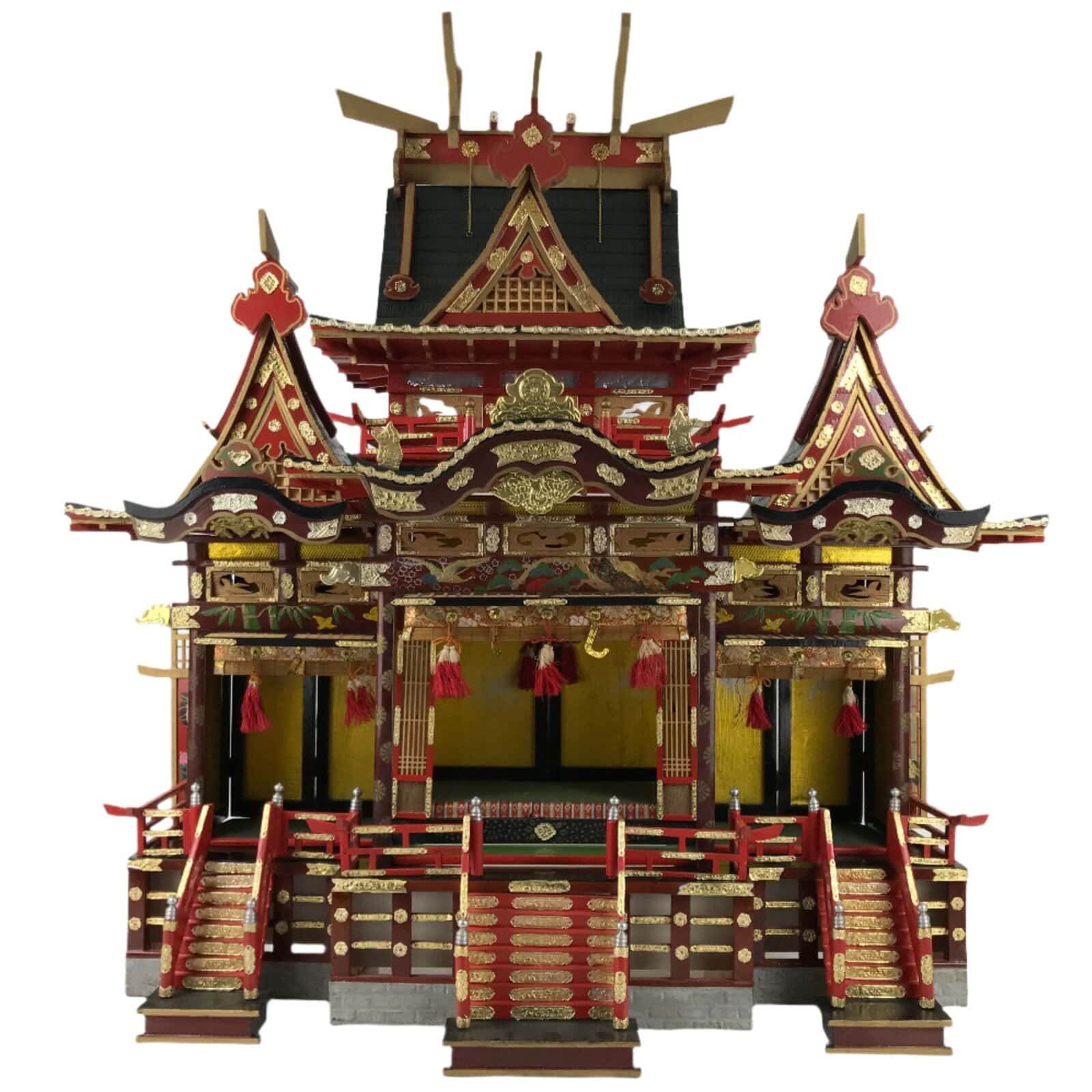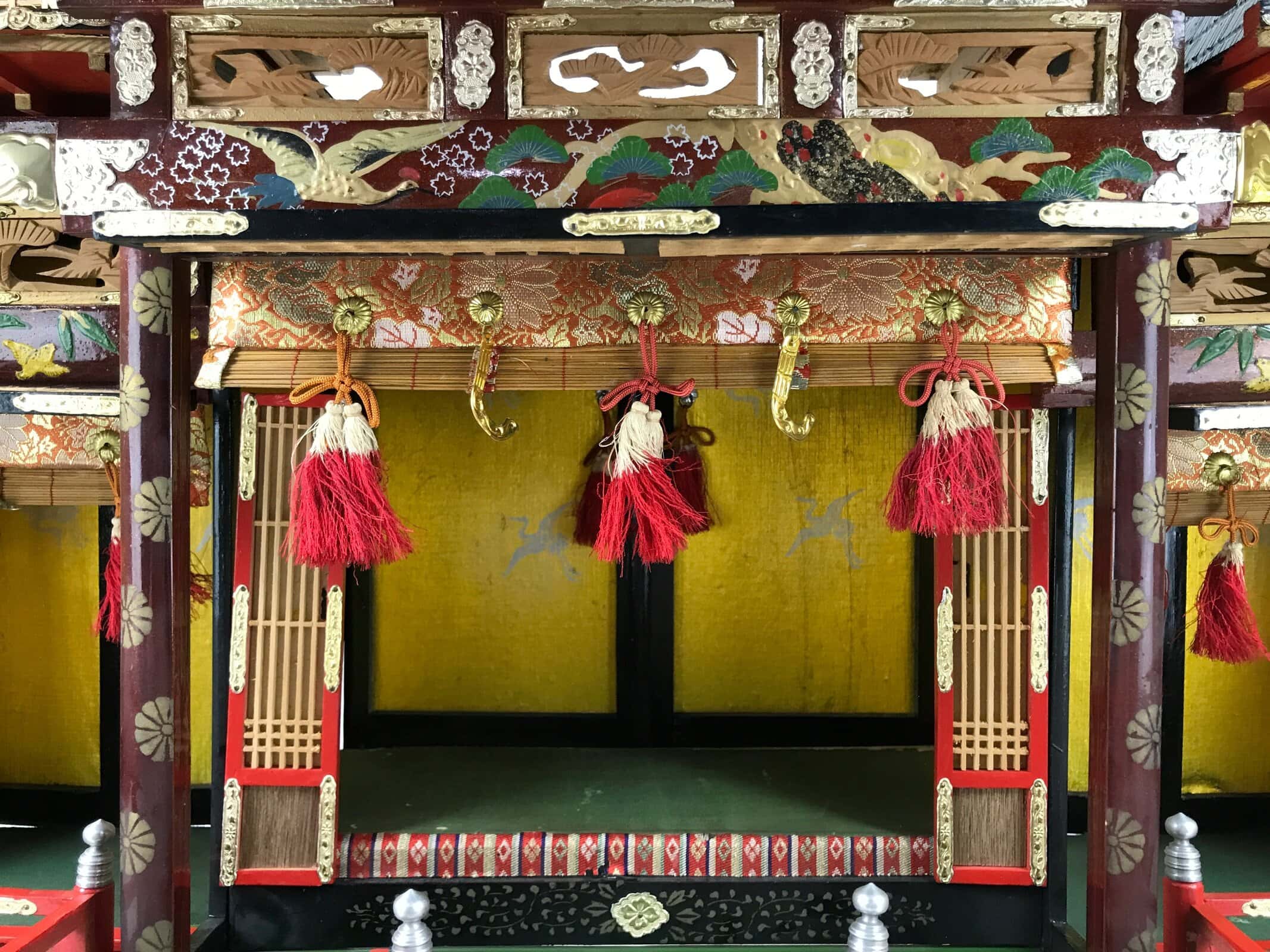 - Good condition considering age. Some pieces of the underside of roof have broken off (collected in plastic bag), byobu screens on back wall have a couple holes on back side, scratches and wear on lacquer paint from use. Wooden box has some damage around edges. Wear and tear due to age.
