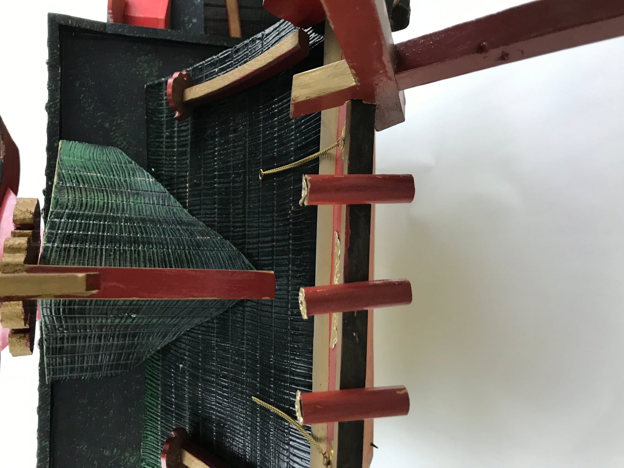 This stunning and rare antique Japanese piece is a goten palace used to display a royal court of traditional Hina dolls for the Girl’s Day holiday. It is made of wood and lacquered with an array of vibrant colors. With handcrafted wooden structural pieces and hand-painted panels, this gorgeous dollhouse is assembled almost like a puzzle. All the pieces sit naturally upon one another or attach via wire pegs. It comes disassembled in the original wooden box, and all pieces, minus the dolls, appear to be included.
