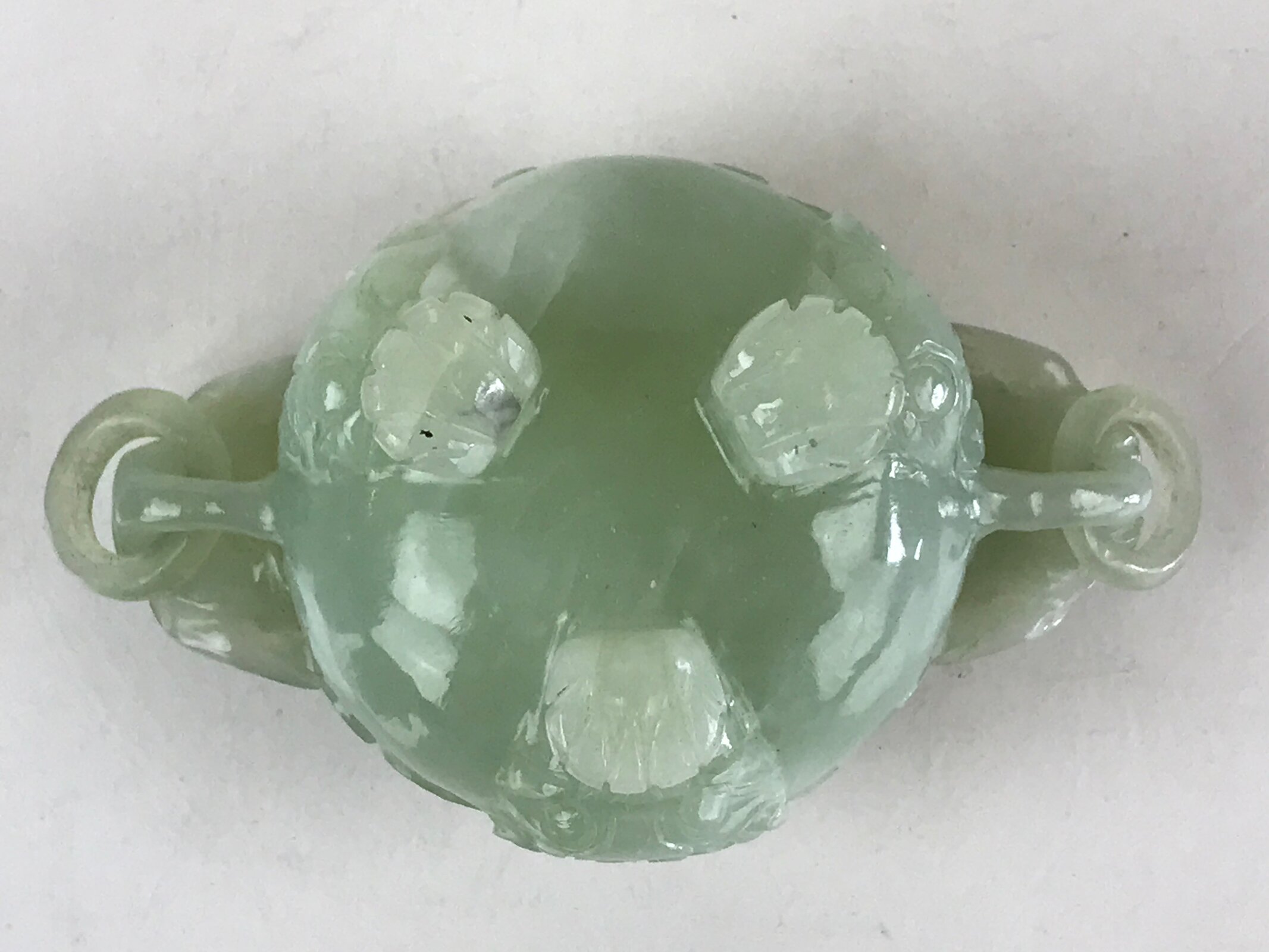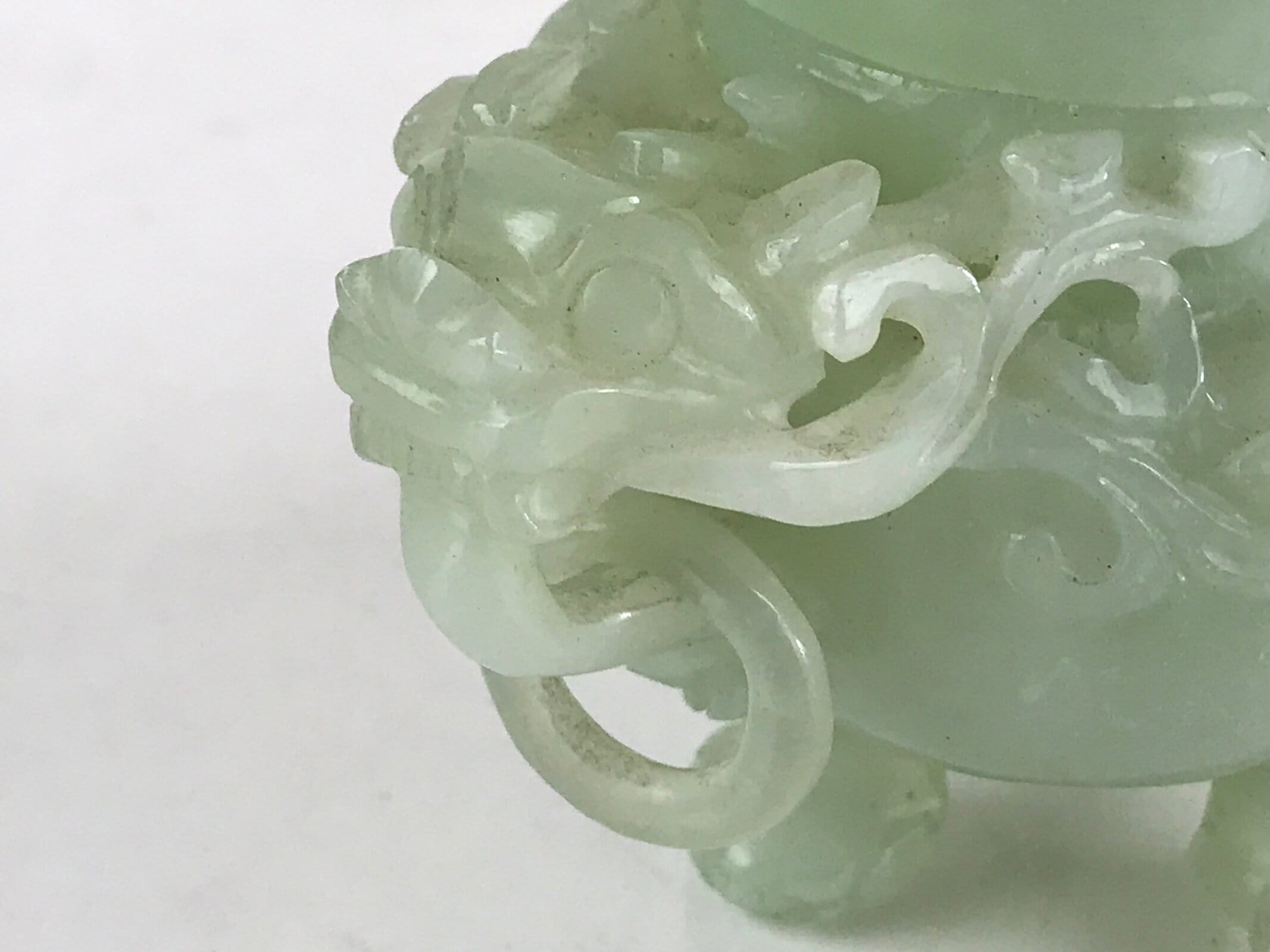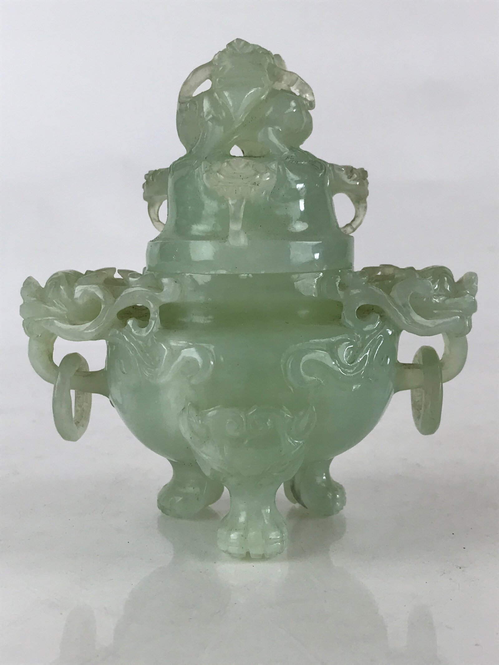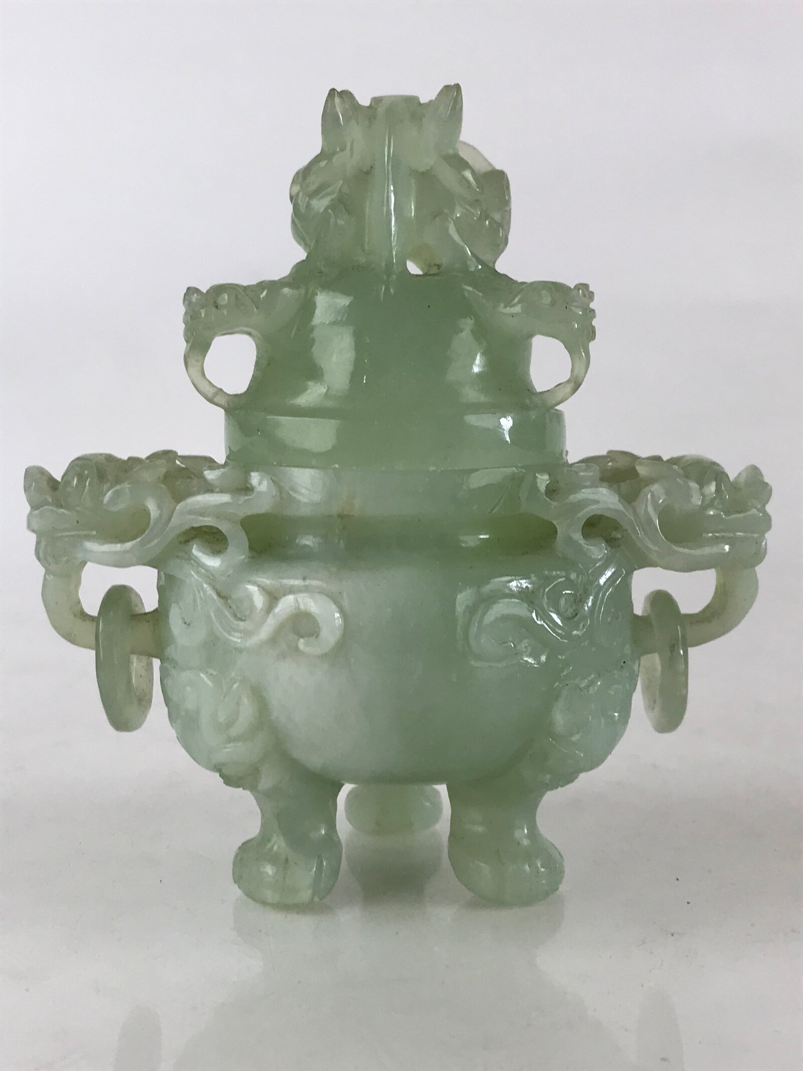 This is a vintage Chinese art jade sculpture lidded incense burner Koro. It can be used container for small items. There are two rings on the left and right, and three legs on the bottom. There are many animal’s faces like dragons or lions.