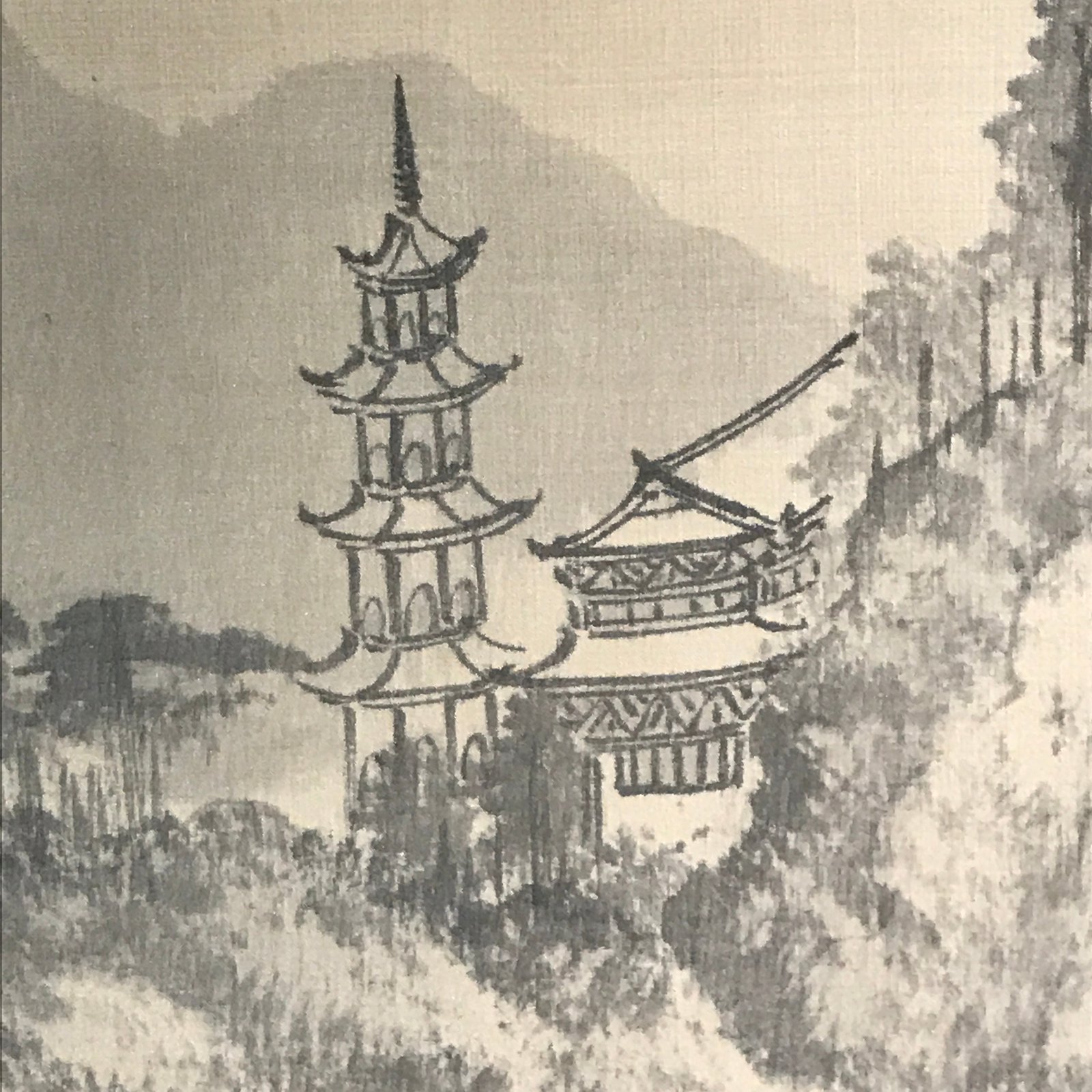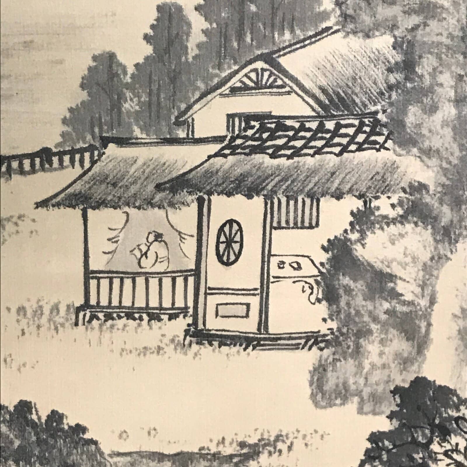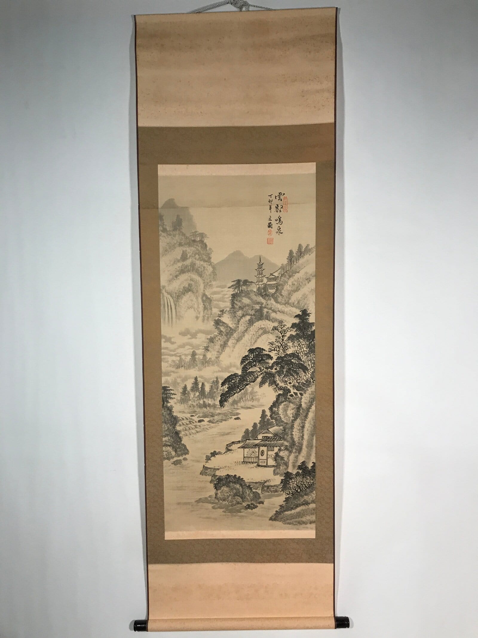 This vintage hanging scroll (kakejiku or makimono) by Taiwanese artist Bunkan Cho features a black-and-white landscape with mountains, a river, clouds and house. This style is called sansui, literally mountains and water. This piece is titled, dated and it is signed with a name and red seals. There’s a label on the outside of the scroll.