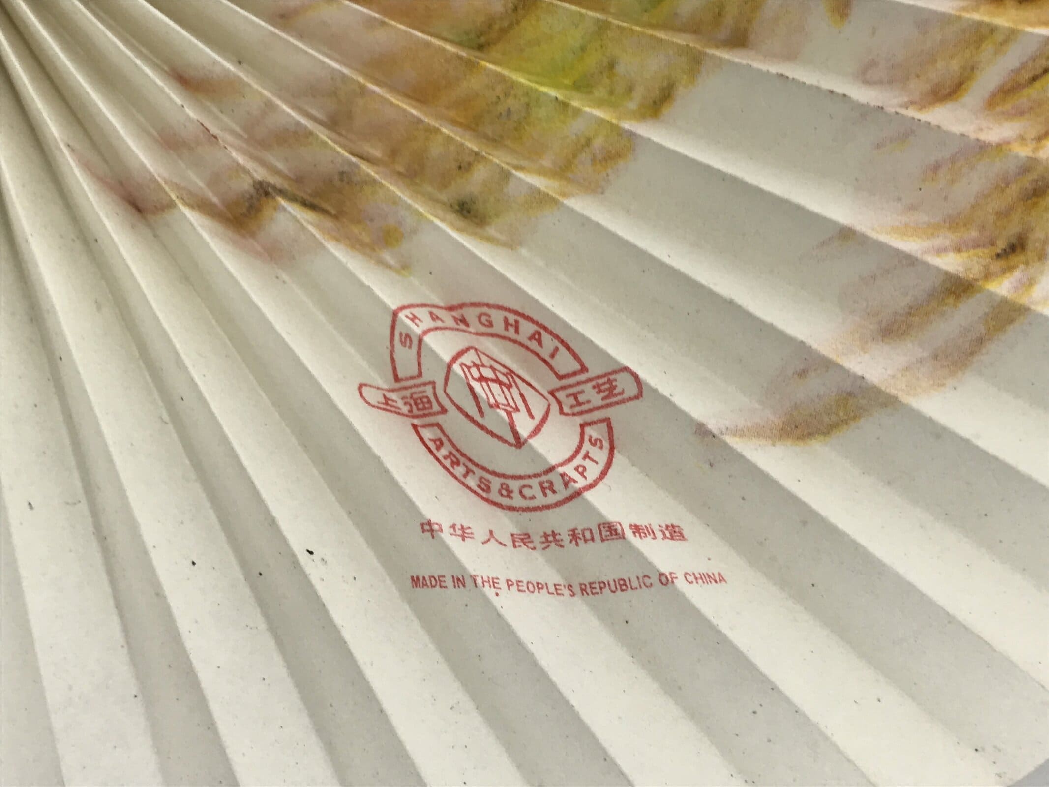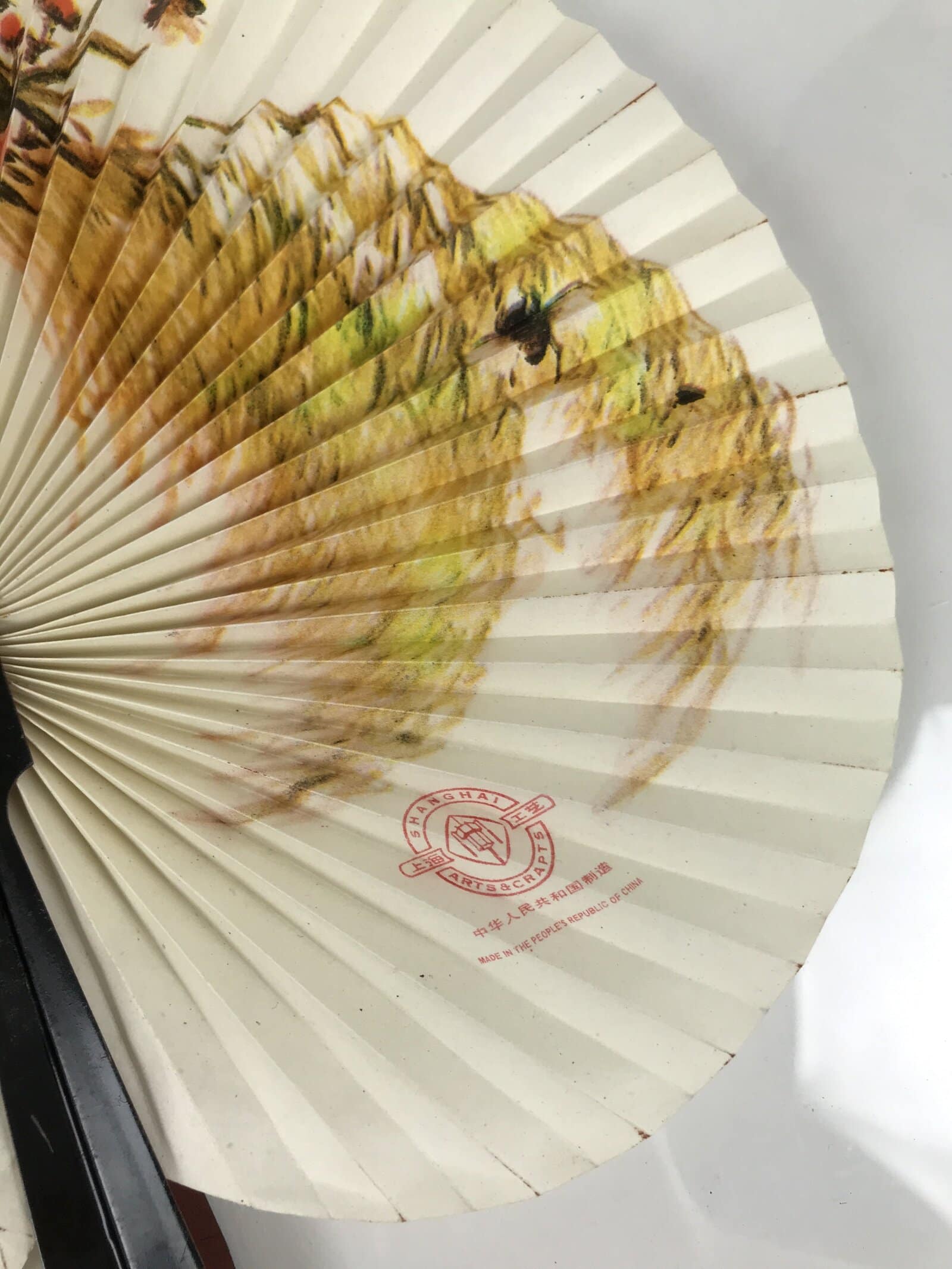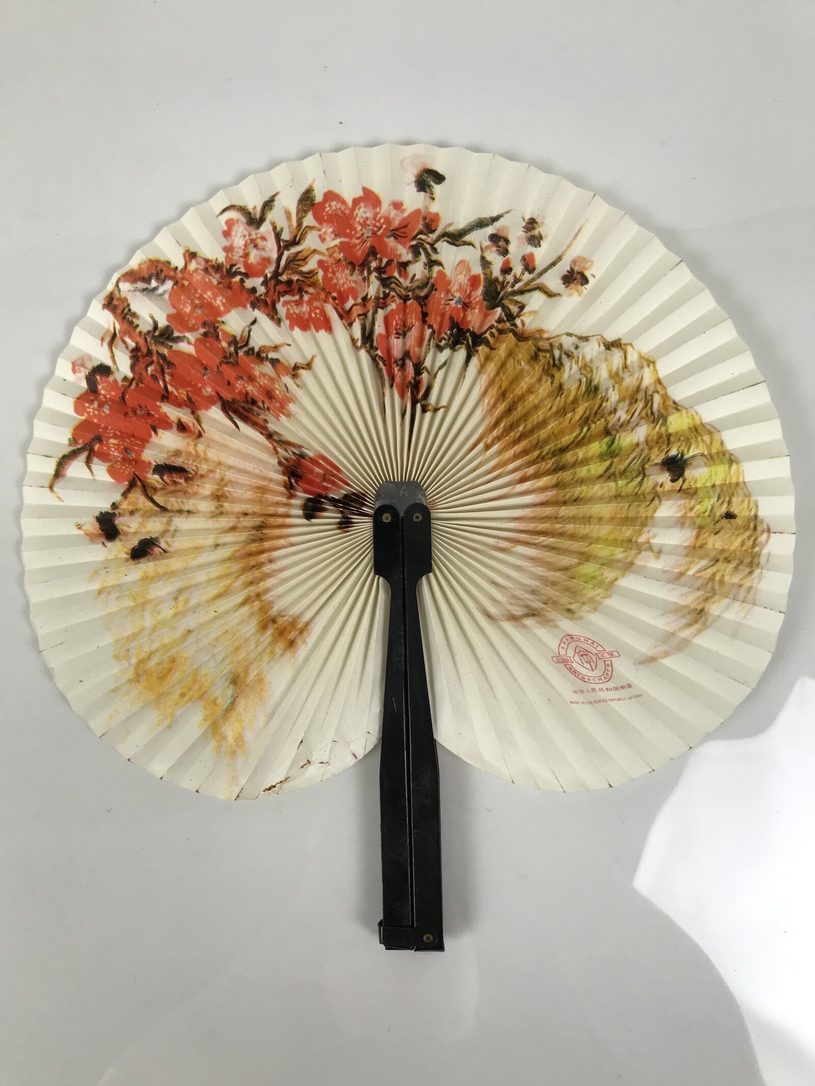 This is a vintage Chinese paper folding fan. Made with a metal handle and a loop to keep it closed, this fan opens in a radial way. The design is of what appears to be cherry blossoms. There is a red seal on the inside bottom that says “Shanghai Arts & Crafts” and “Made in The People’s Republic of China”.