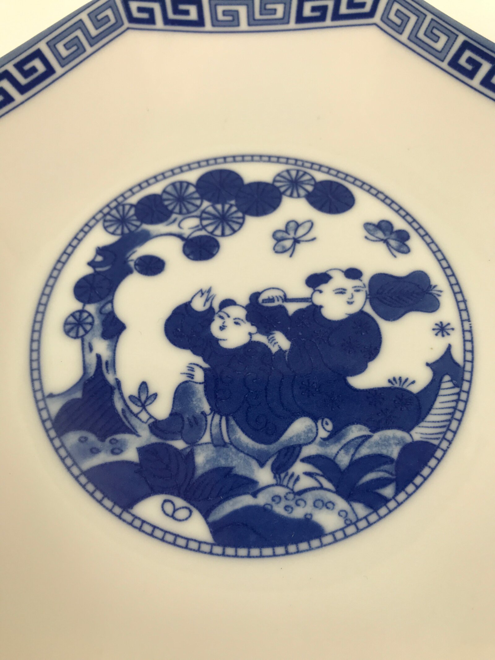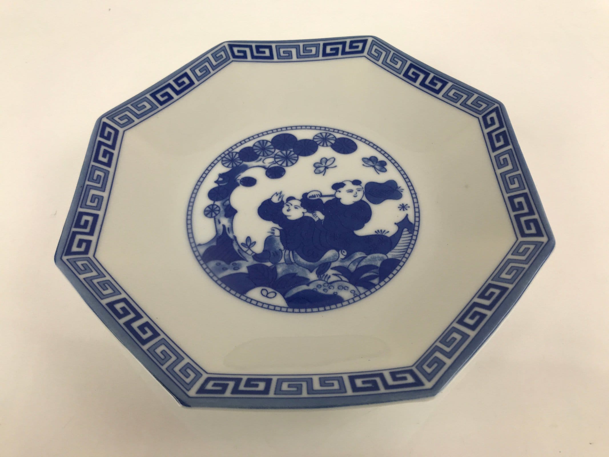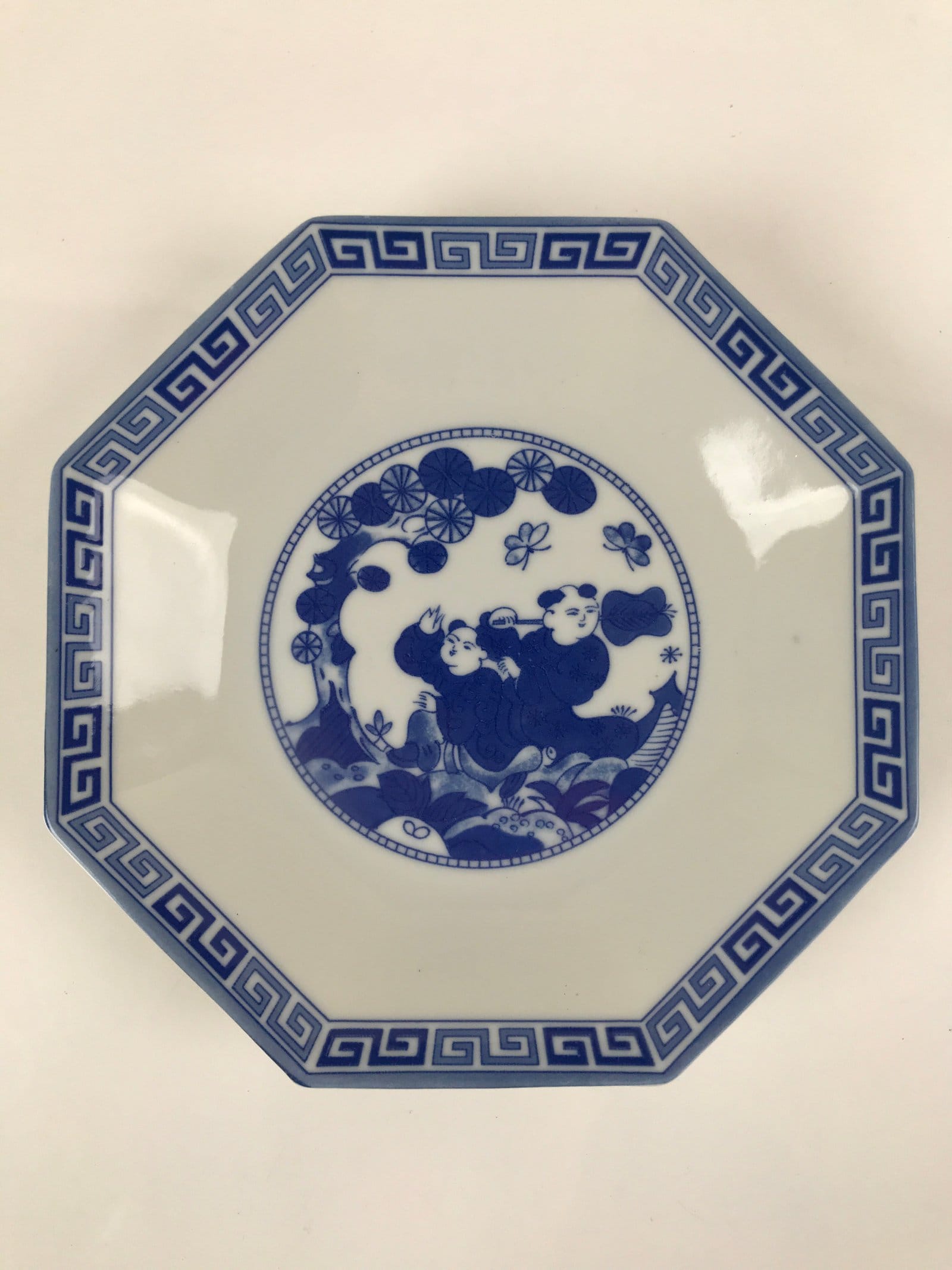 This is a vintage Chinese porcelain plate. This octagonal plate is white and blue. There is a two-tone blue border and the main feature is two Tang-style children playing under a tree with butterflies. This plate is deep enough that it can be used for a shallow bowl as well.