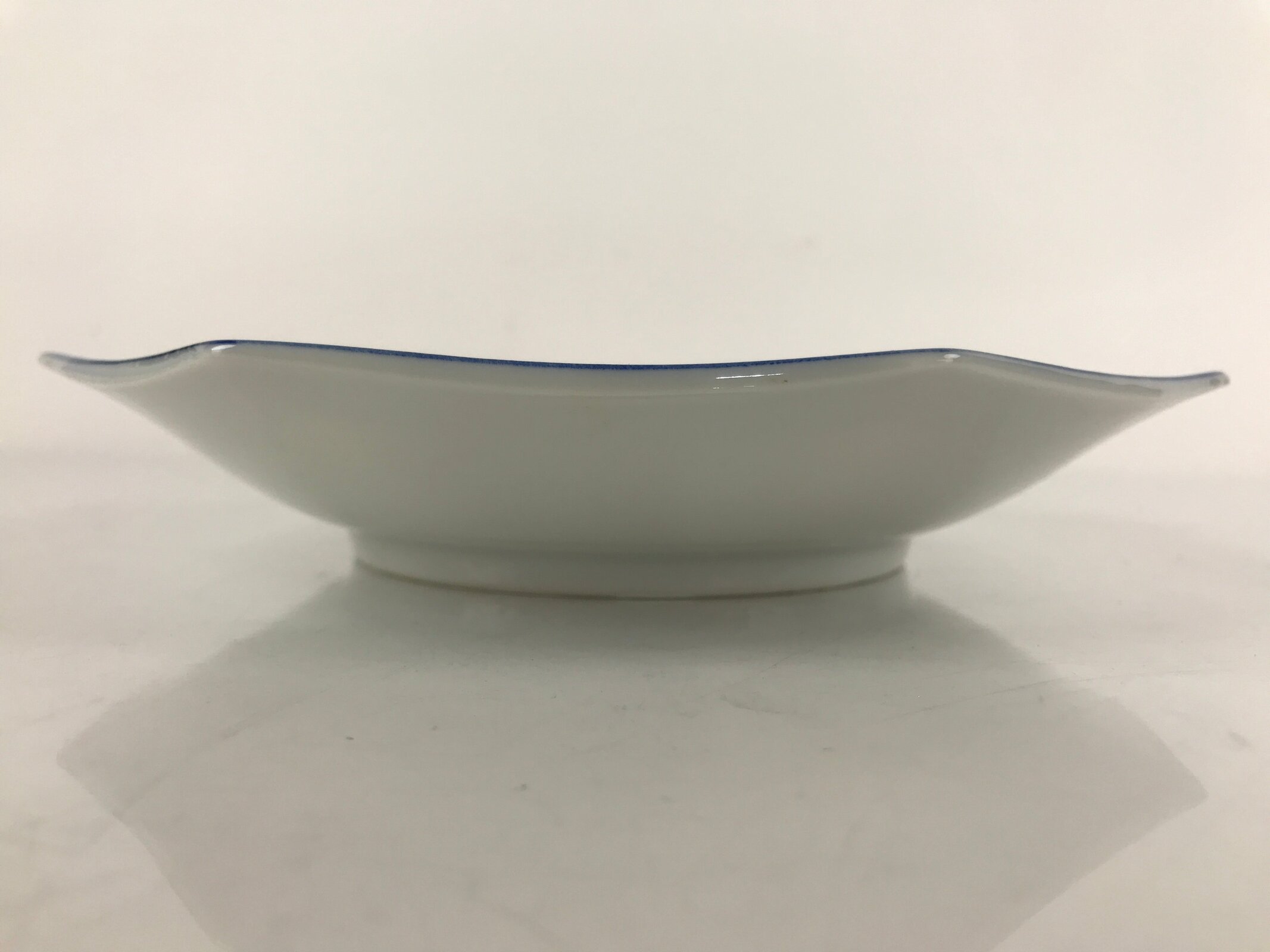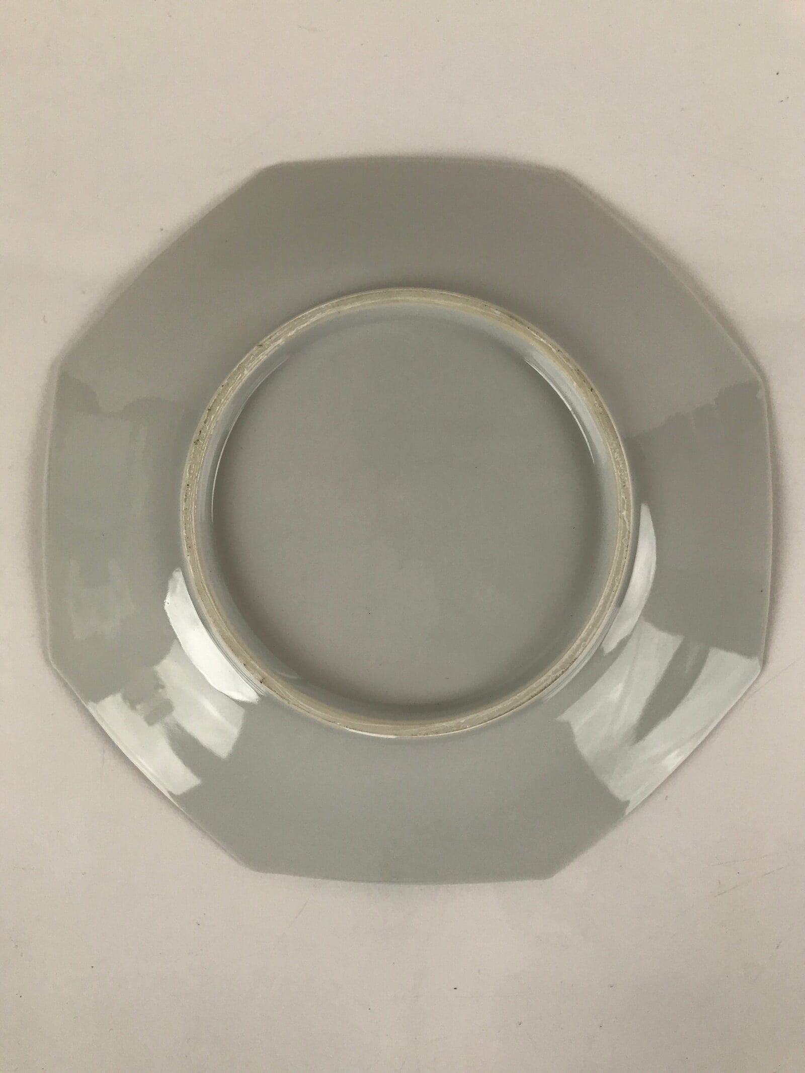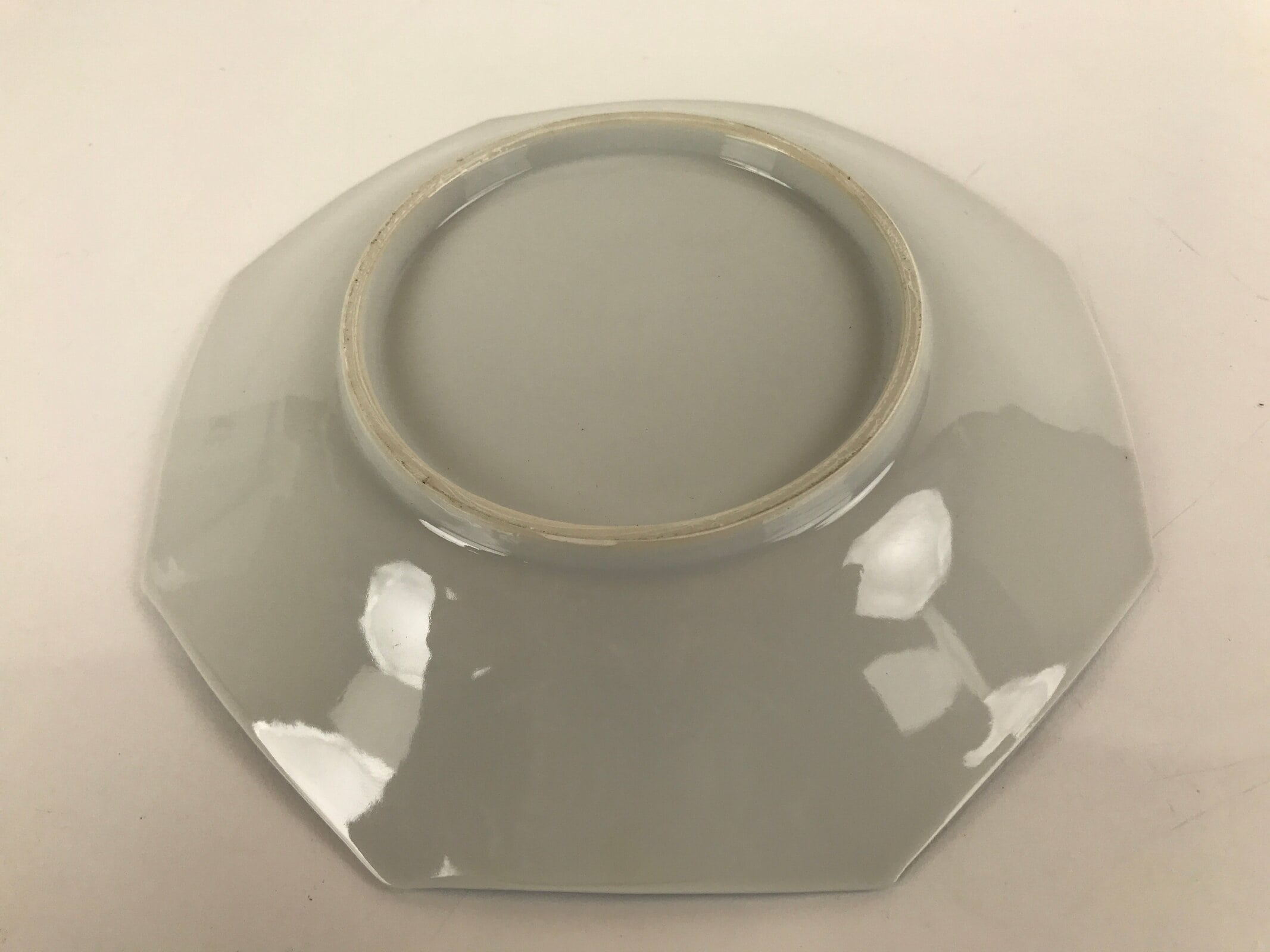 This is a vintage Chinese porcelain plate. This octagonal plate is white and blue. There is a two-tone blue border and the main feature is two Tang-style children playing under a tree with butterflies. This plate is deep enough that it can be used for a shallow bowl as well.
