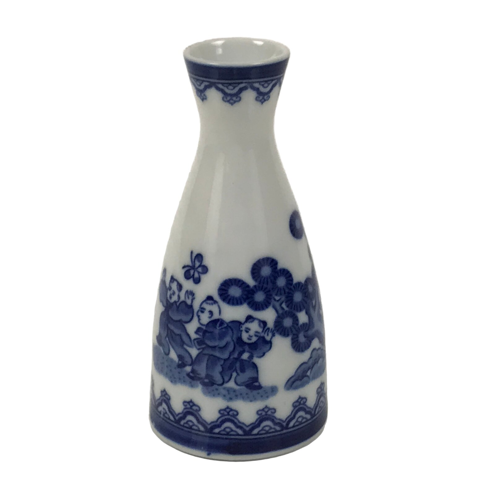 This is a vintage Chinese porcelain sake bottle or Tokkuri. This small bottle features children playing in Tang-style clothing (also called karako in Japanese). The bottle is mostly white with blue designs and borders. It is approximately an ichi-go size sake bottle or a little larger. It can also be used for water, other drinks, as a vase, or as a decorative item. There is a blue signature on the bottom.