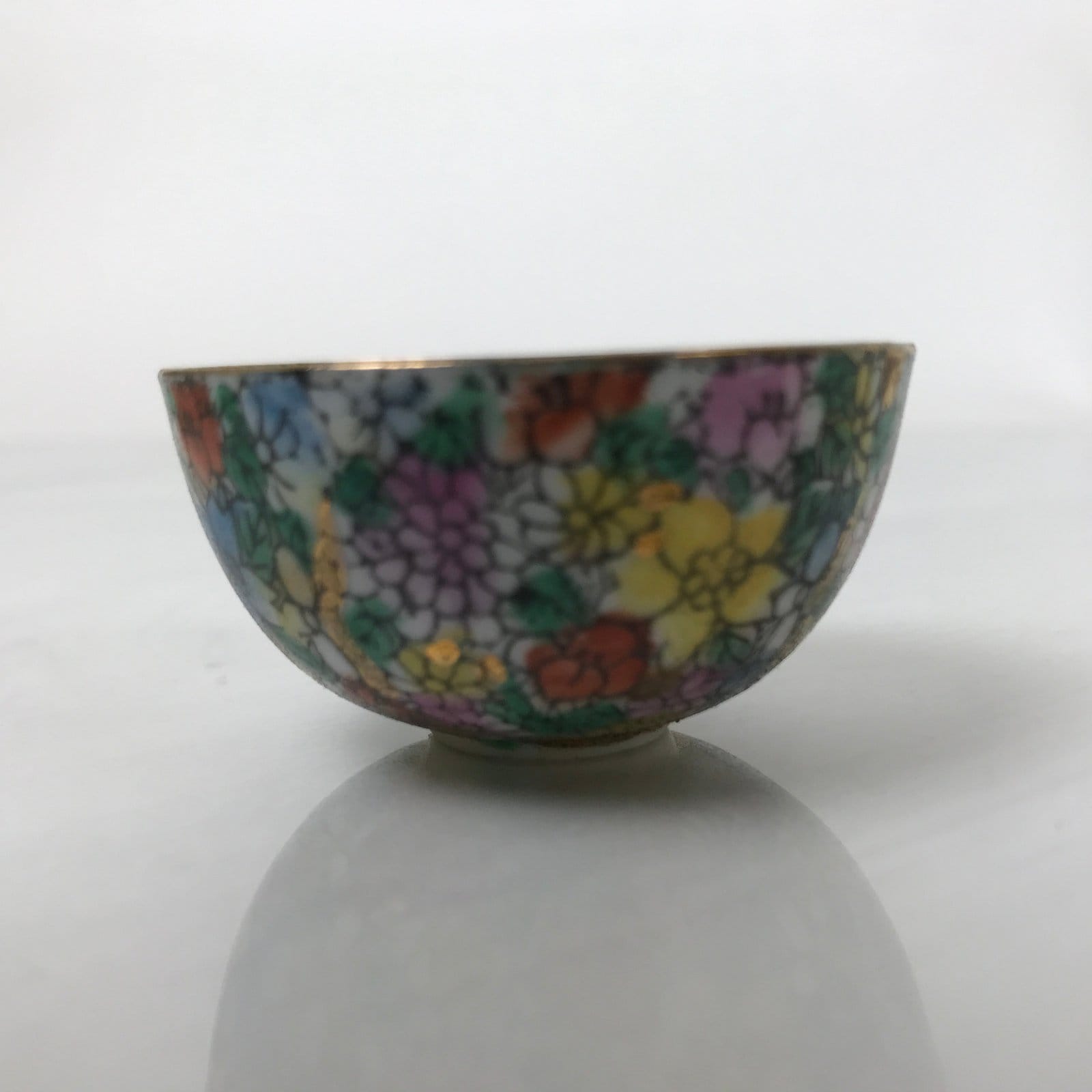 This is a vintage Chinese porcelain sake cup. This thin cup has a colorful floral pattern outside and inside, with a gold accent. On the inside bottom is a design of a God named Jurojin holding a peach and a stick. In terms of size, it is also called ochoko.