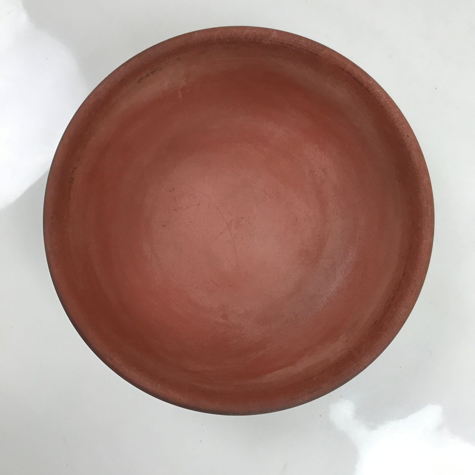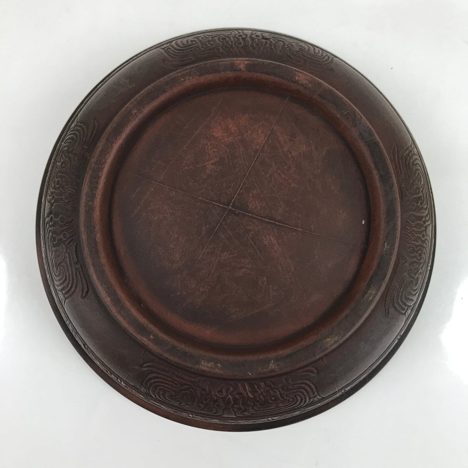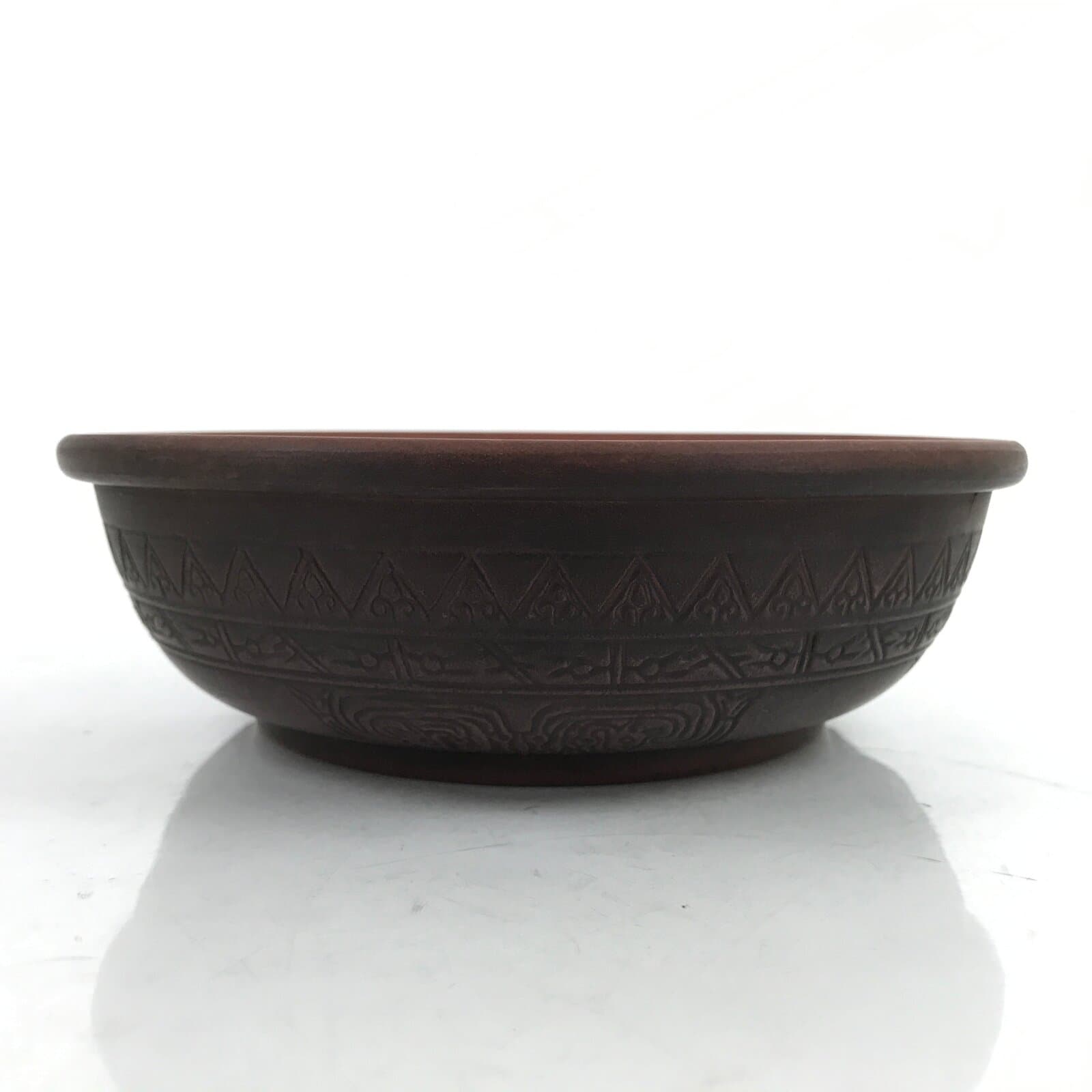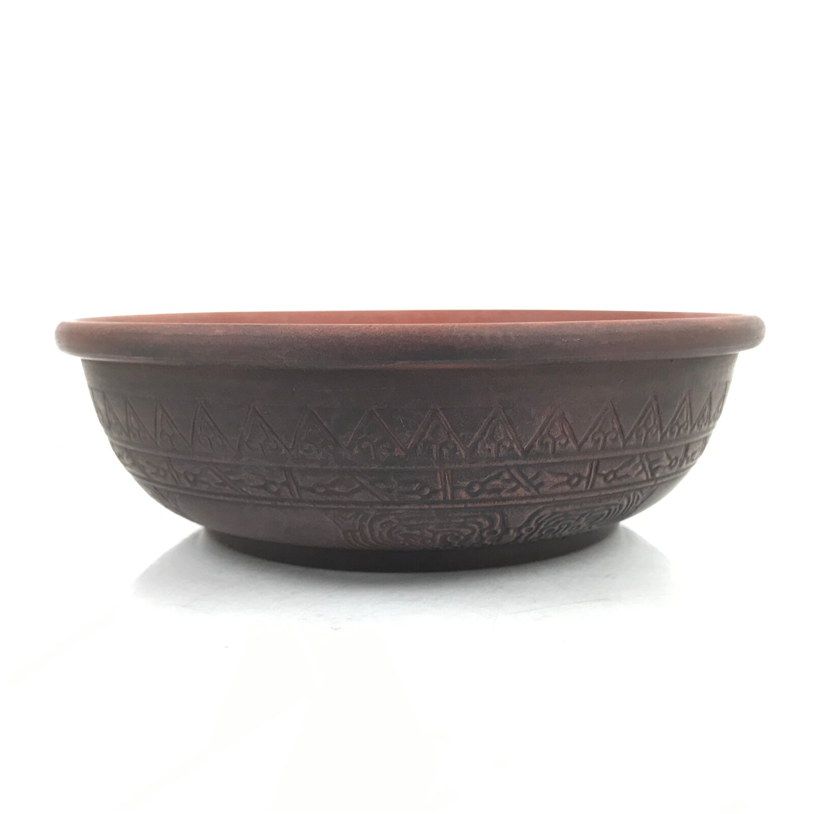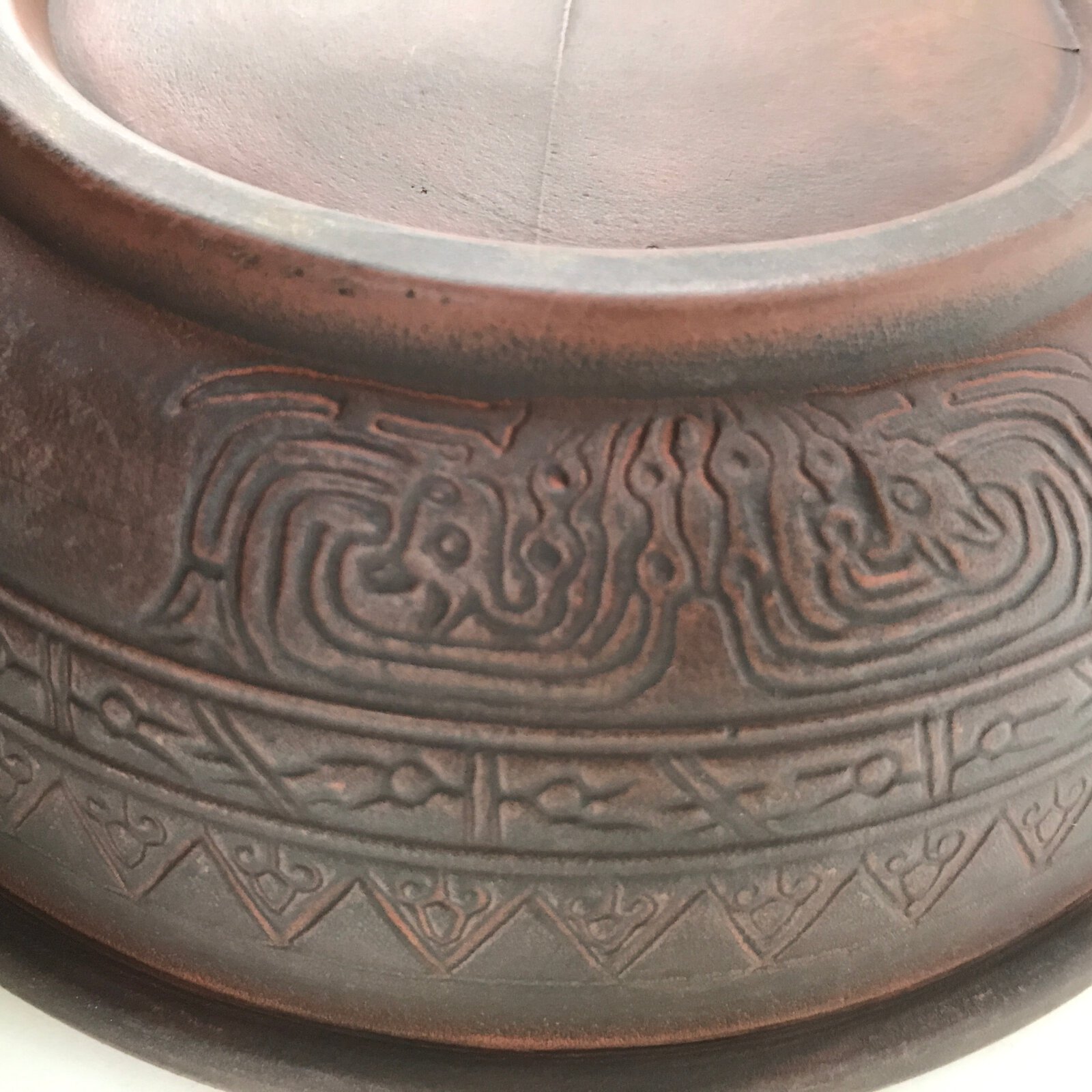 This vintage Chinese (possibly Taiwanese) clay wide bowl is a chaban, a tea tray, used during tea ceremony as a tray or to keep the teapot warm. This bowl is brown with beautiful abstract carvings on the outside.