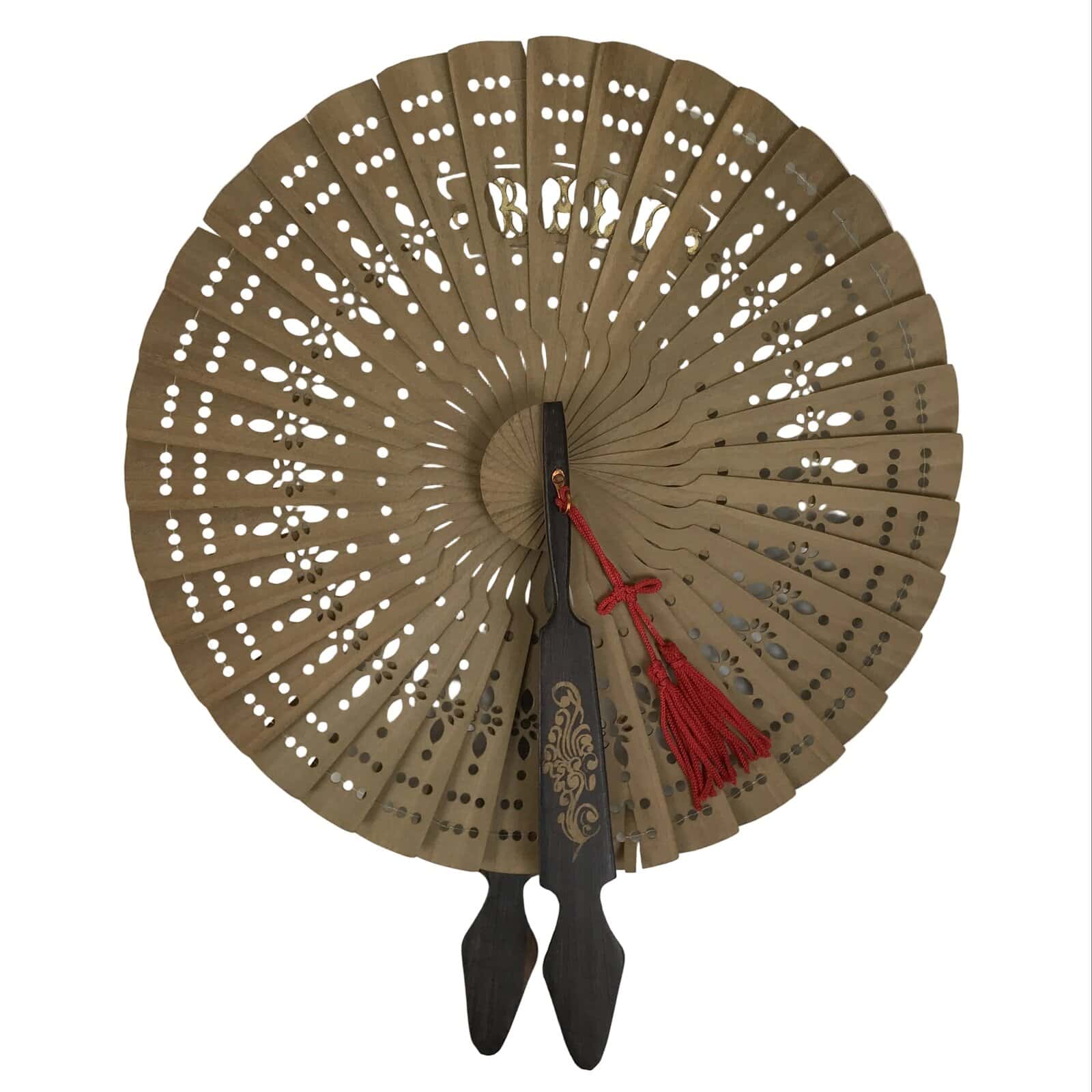 This is a traditional Chinese carved radial sandalwood fan. This uniquely-shaped fan folds small, then opens in a round shape. It has a cutout floral design throughout. It is well-made and has a medium brown color with gold accents. The pieces of this fan are attached with a strong clear plastic string, and at the very bottom is a metal loop with a red string with two tassels attached.