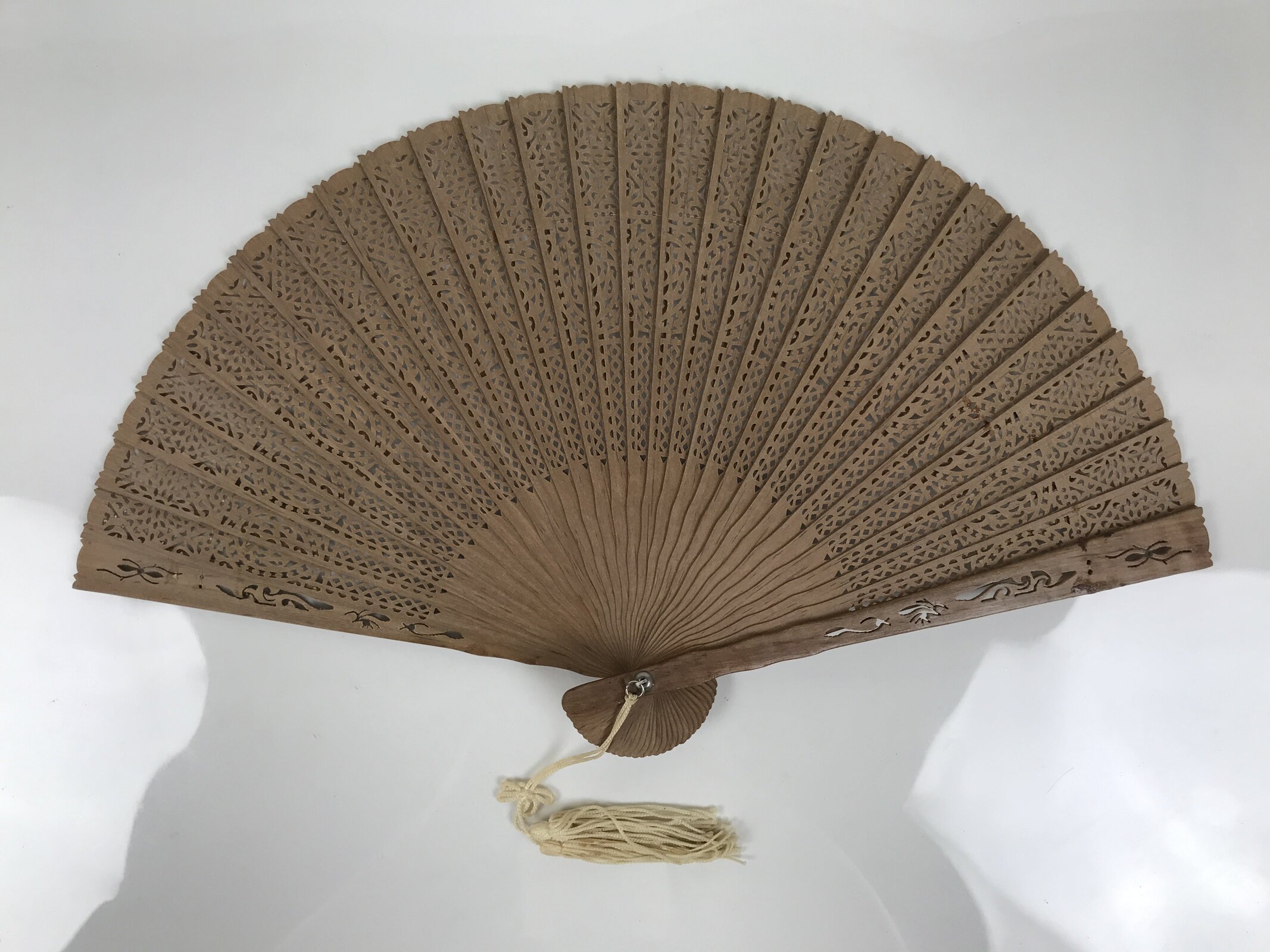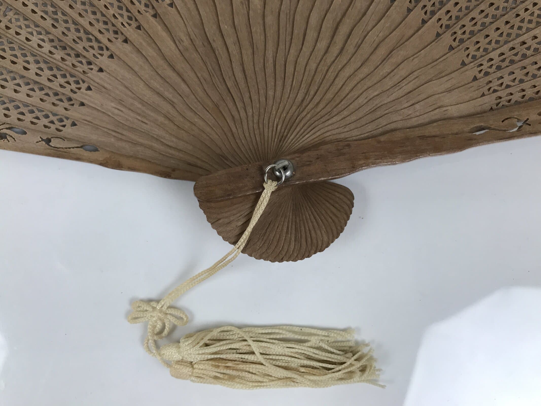 This is a traditional Chinese carved sandalwood fan. It has a round cutout floral design throughout. It is well-made and has a medium brown color. The pieces of this fan are attached with a strong clear plastic string, and at the very bottom is a metal loop with a white string with two tassels attached.