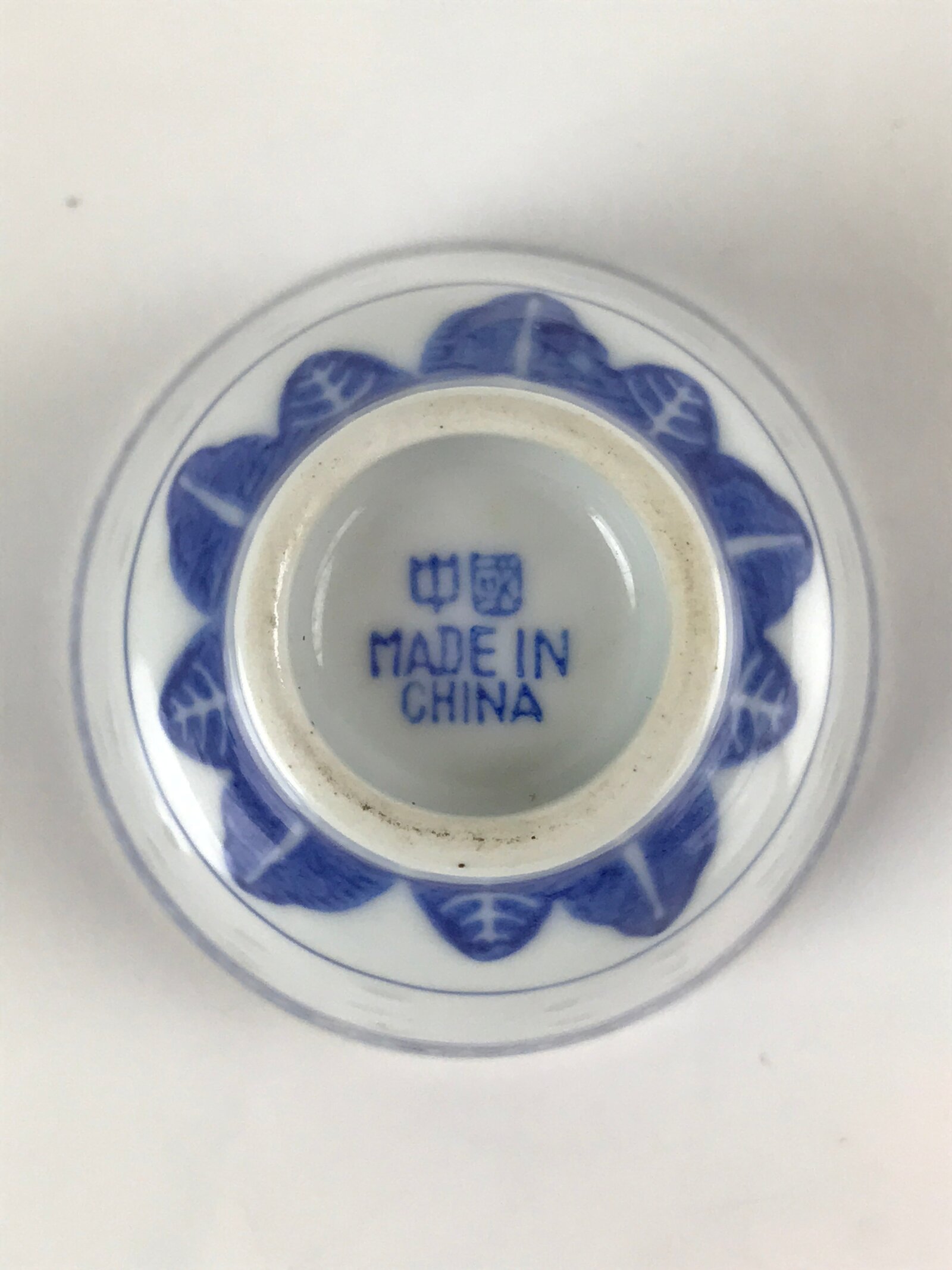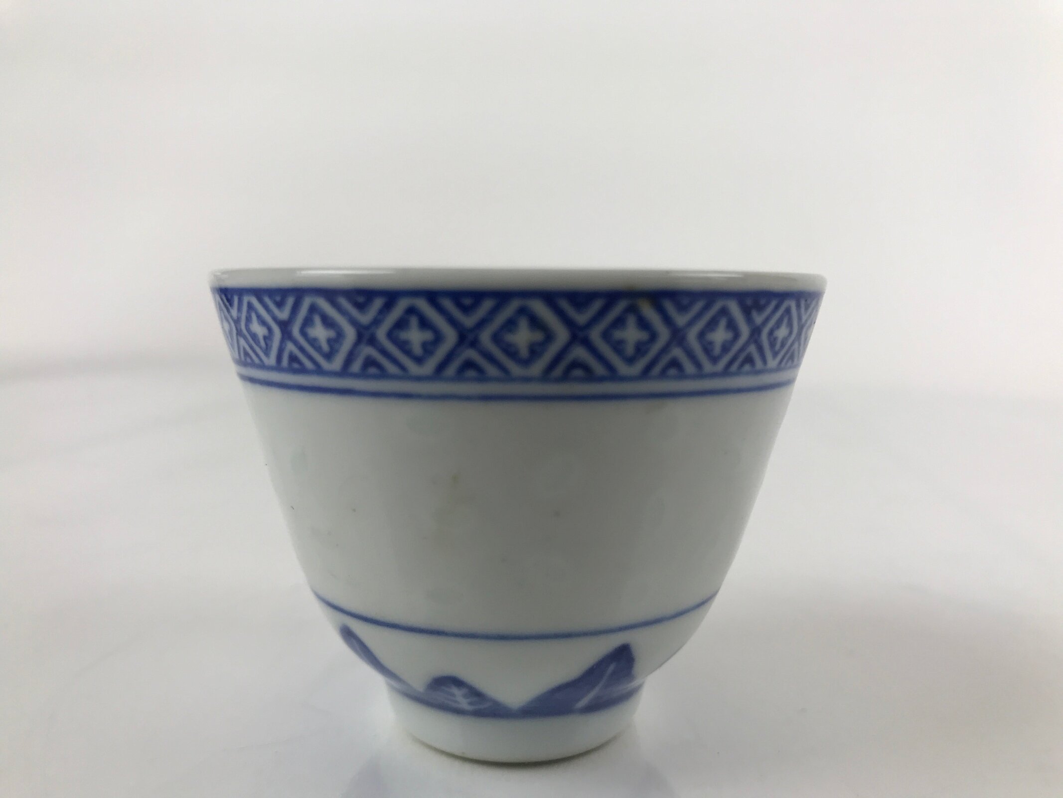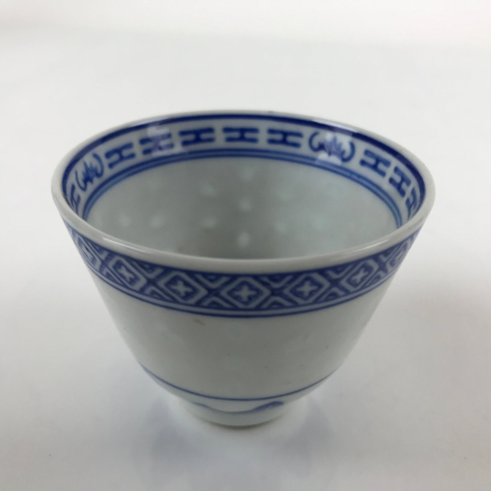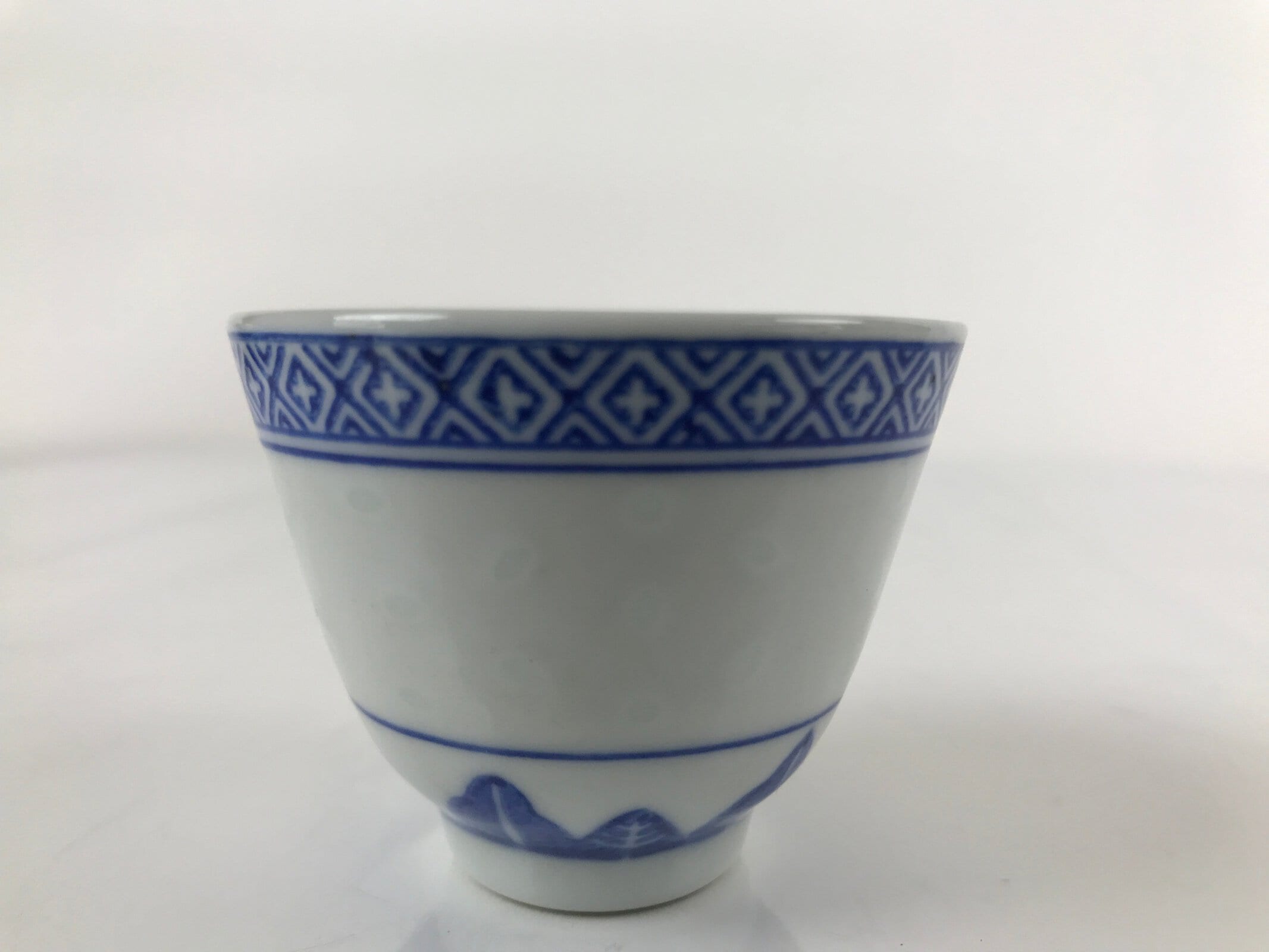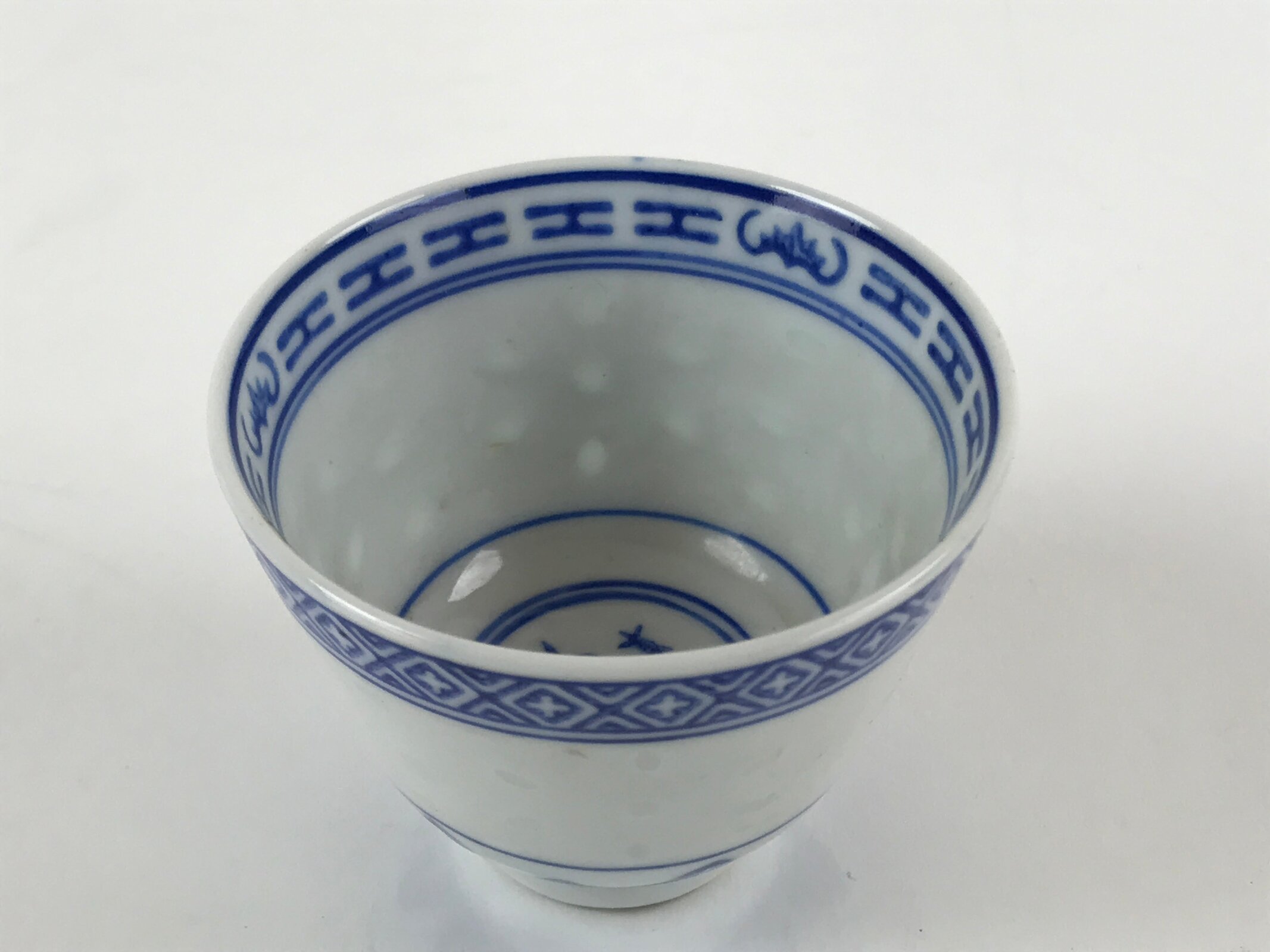 This is a vintage Chinese porcelain sake cup. This particular type of cup is called guinomi due to its larger size. This cup is white with various blue border patterns. At the bottom center is a flower with leaves. Resembling flower petals, this cup has a unique translucent design and can be seen when held up to the light.