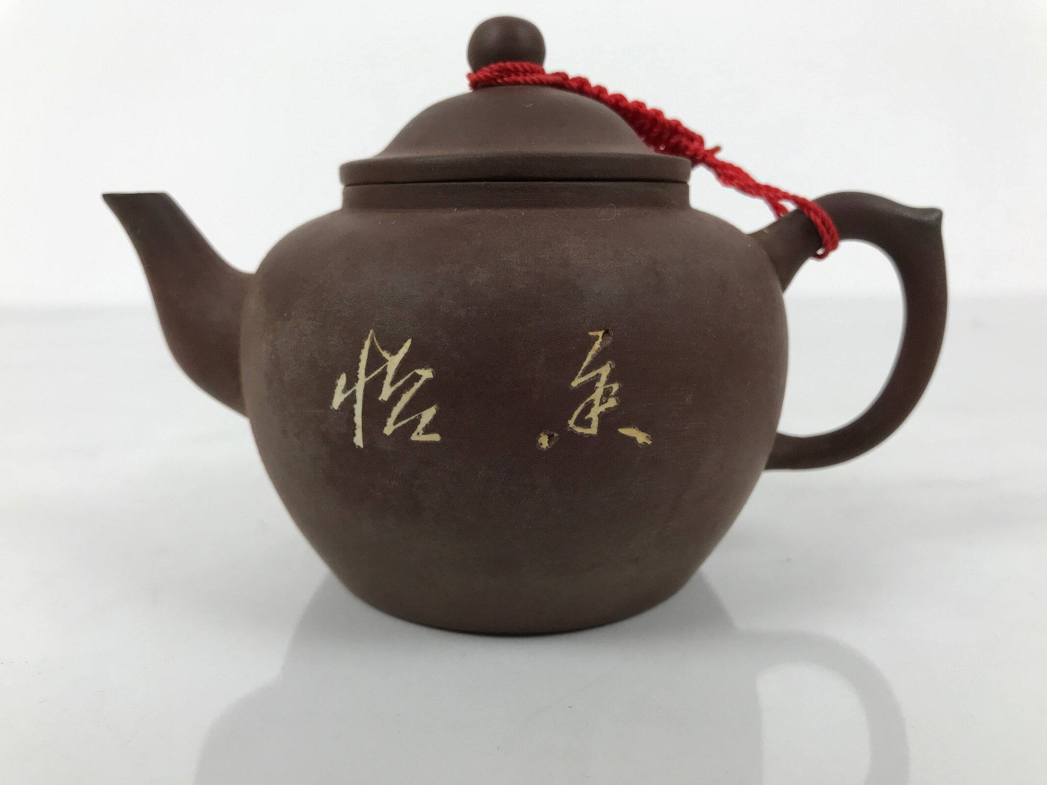 This is a vintage Chinese Yixing lidded teapot perfect for having Chinese tea. A red string connects the handle and the lid and prevents the lid from falling off. This small teapot is brown and features kanji on the side.