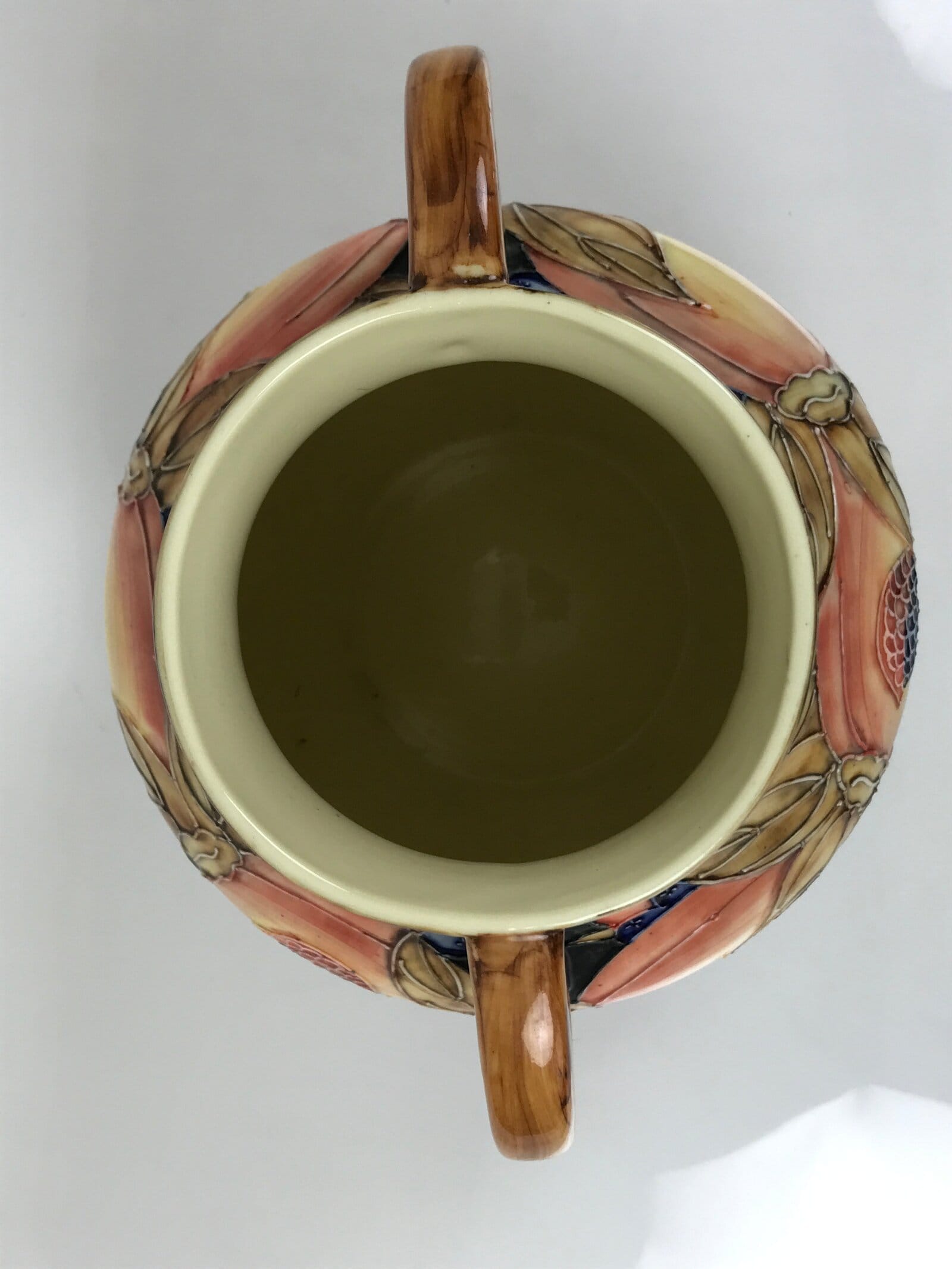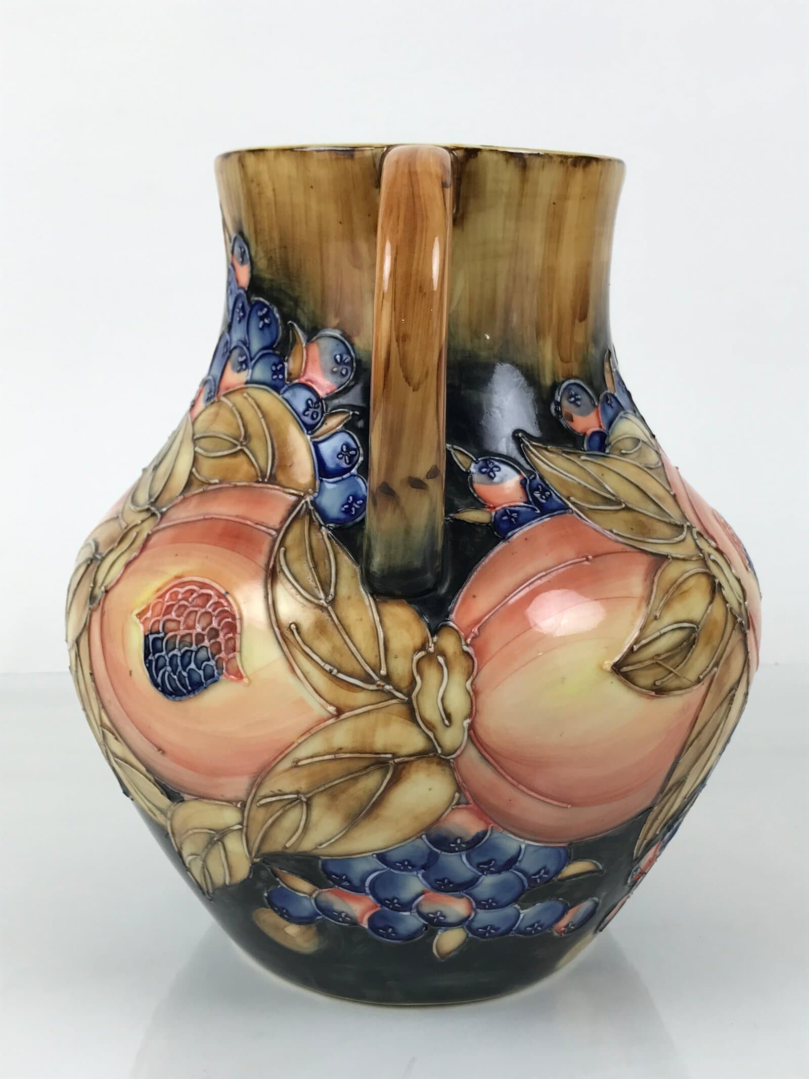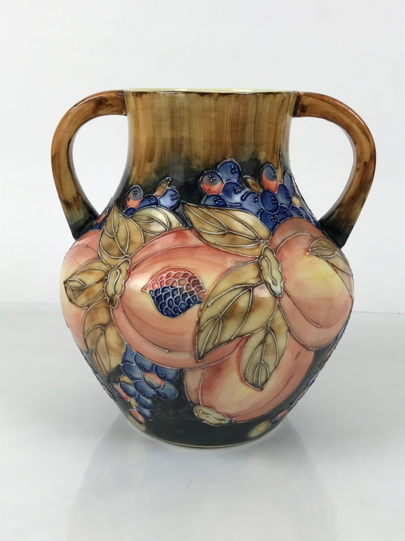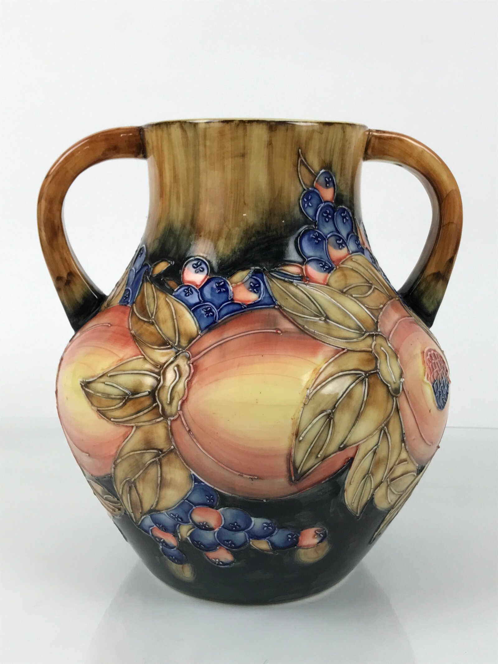 This is a vintage English ceramic flower vase, or kabin. This Old Tupton or Moorcroft-style vase features some peaches and berries with textured hand-painted lines. It has a round body and two handles from the rim to the shoulder. The base is brown, the inside is pale yellow, the peaches are pink and yellow, and the berries are dark blue. It makes a beautiful decorative item. This vase can be used for all types of flower arrangements both ikebana and casual.