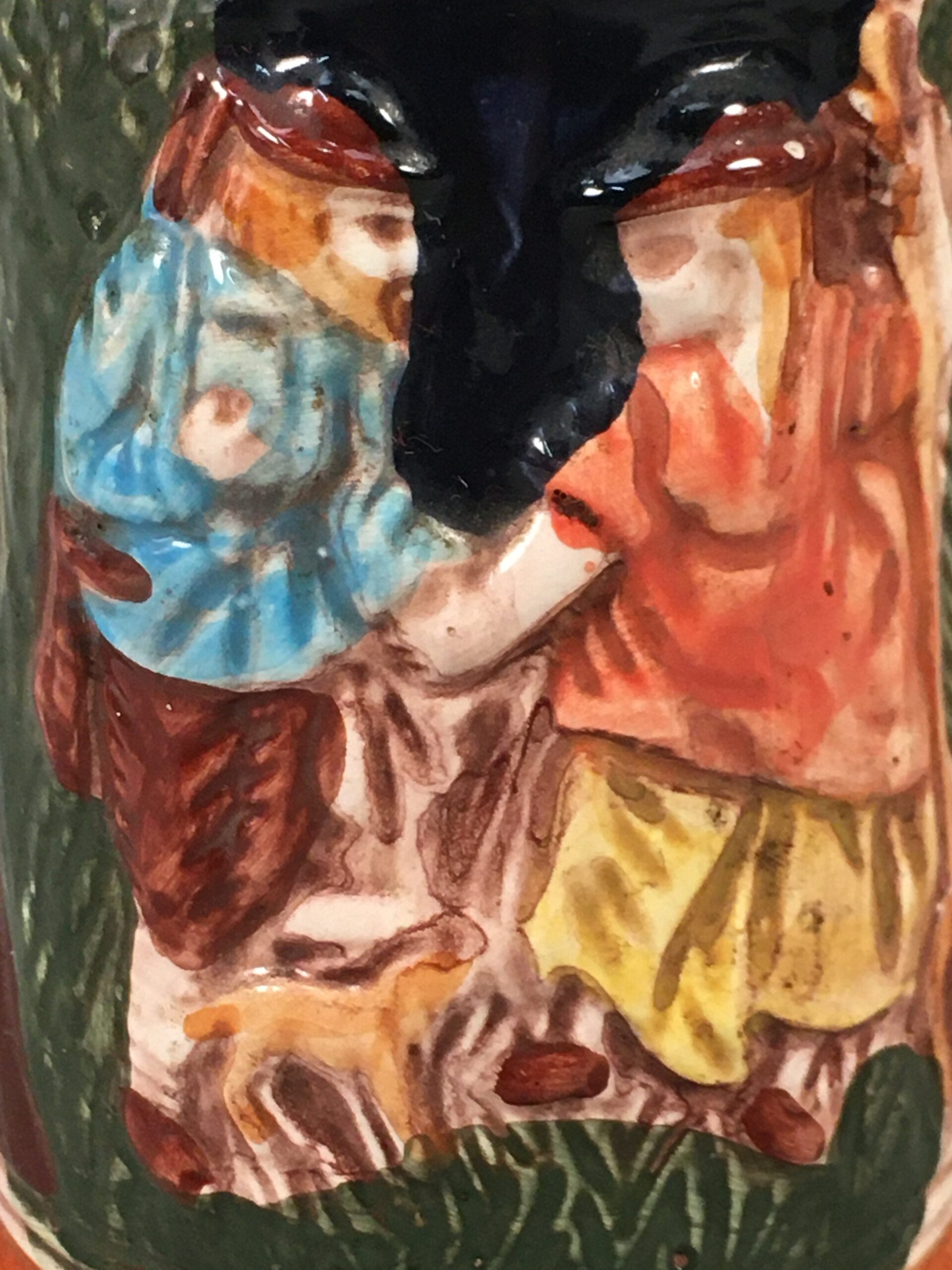 - Relief of a couple, cat, and houses in the forest