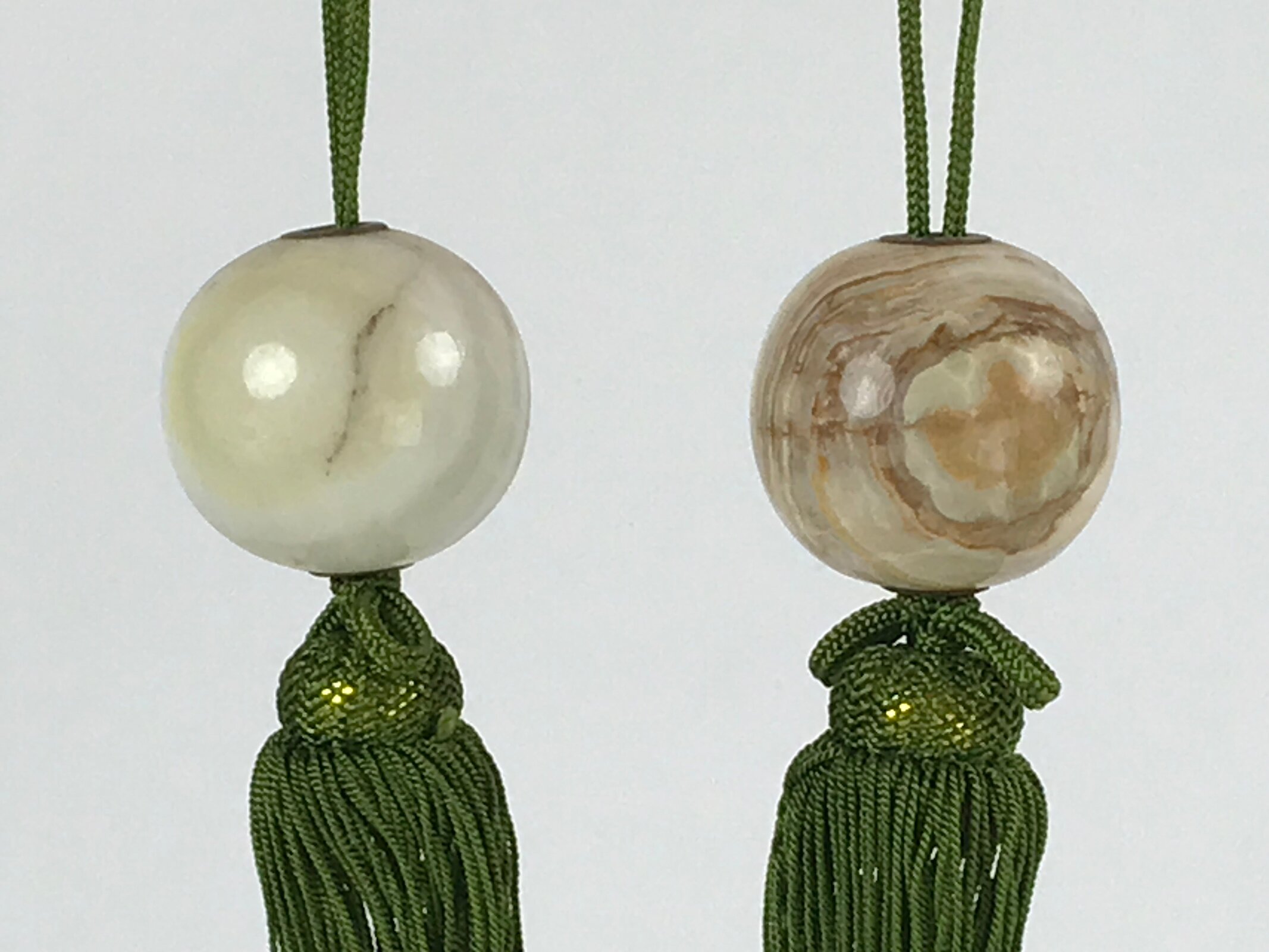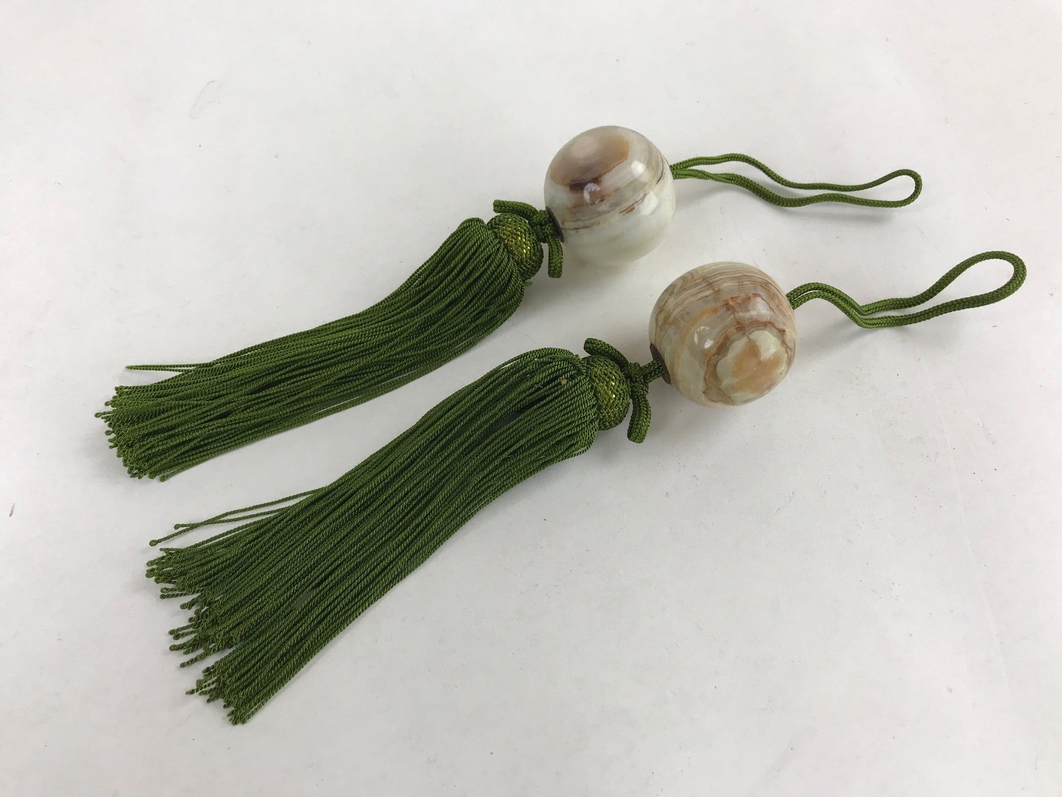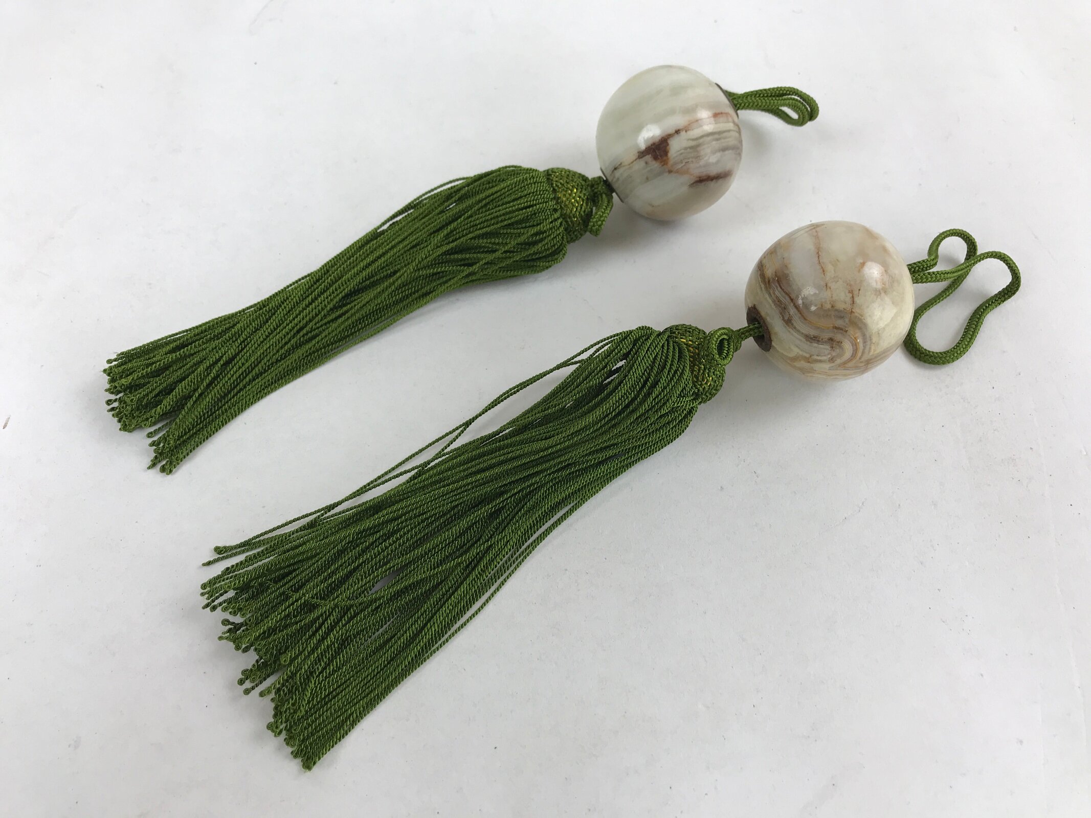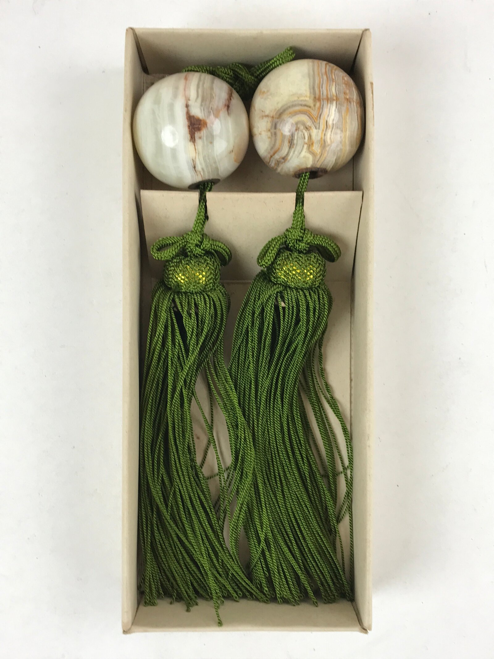 This is a pair of Japanese hanging scroll (kakejiku) weights, or fuchin. Fuchin is a decoration that hangs on both ends of the bottom of a hanging scroll. It’s a decoration as well as weighs the scroll down to keep it straight. This item features marbled agate stone spheres with a combination of white, light brown, and dark brown color in the grain. The holes on either end of the stones are capped with metal. It has green tassels with a gold accent under layer. The original box is included.