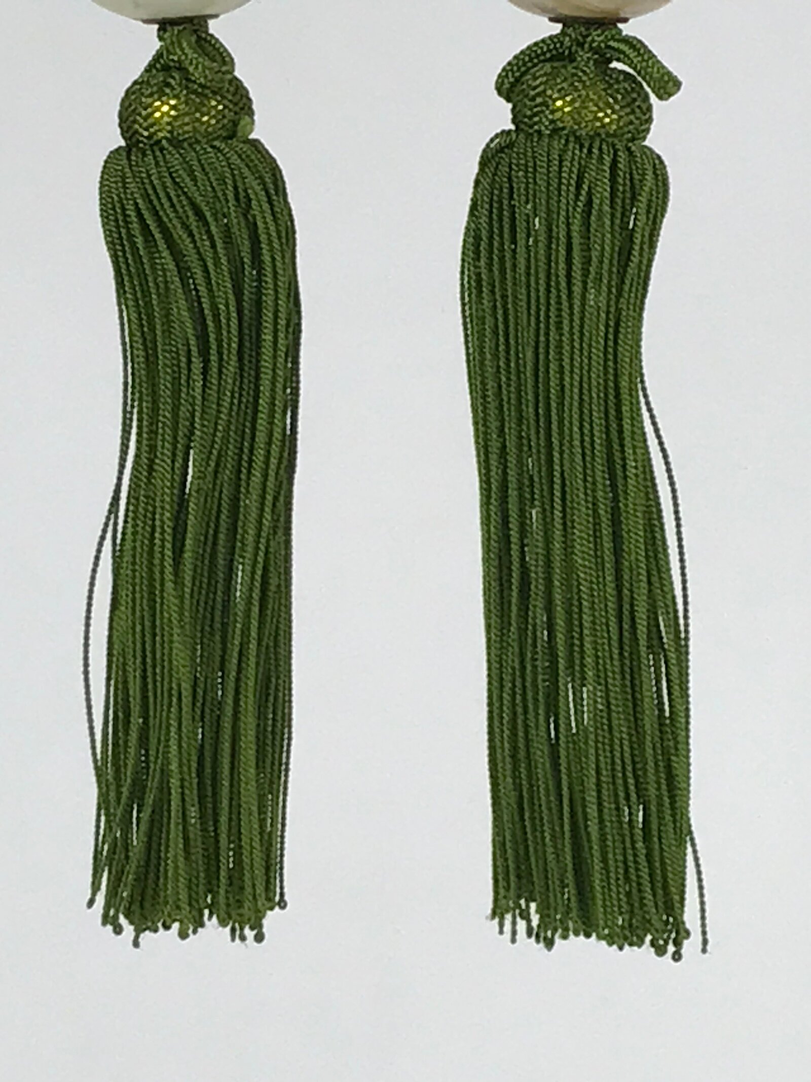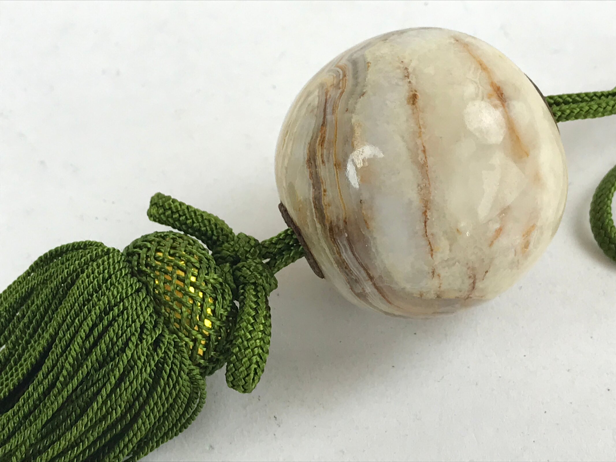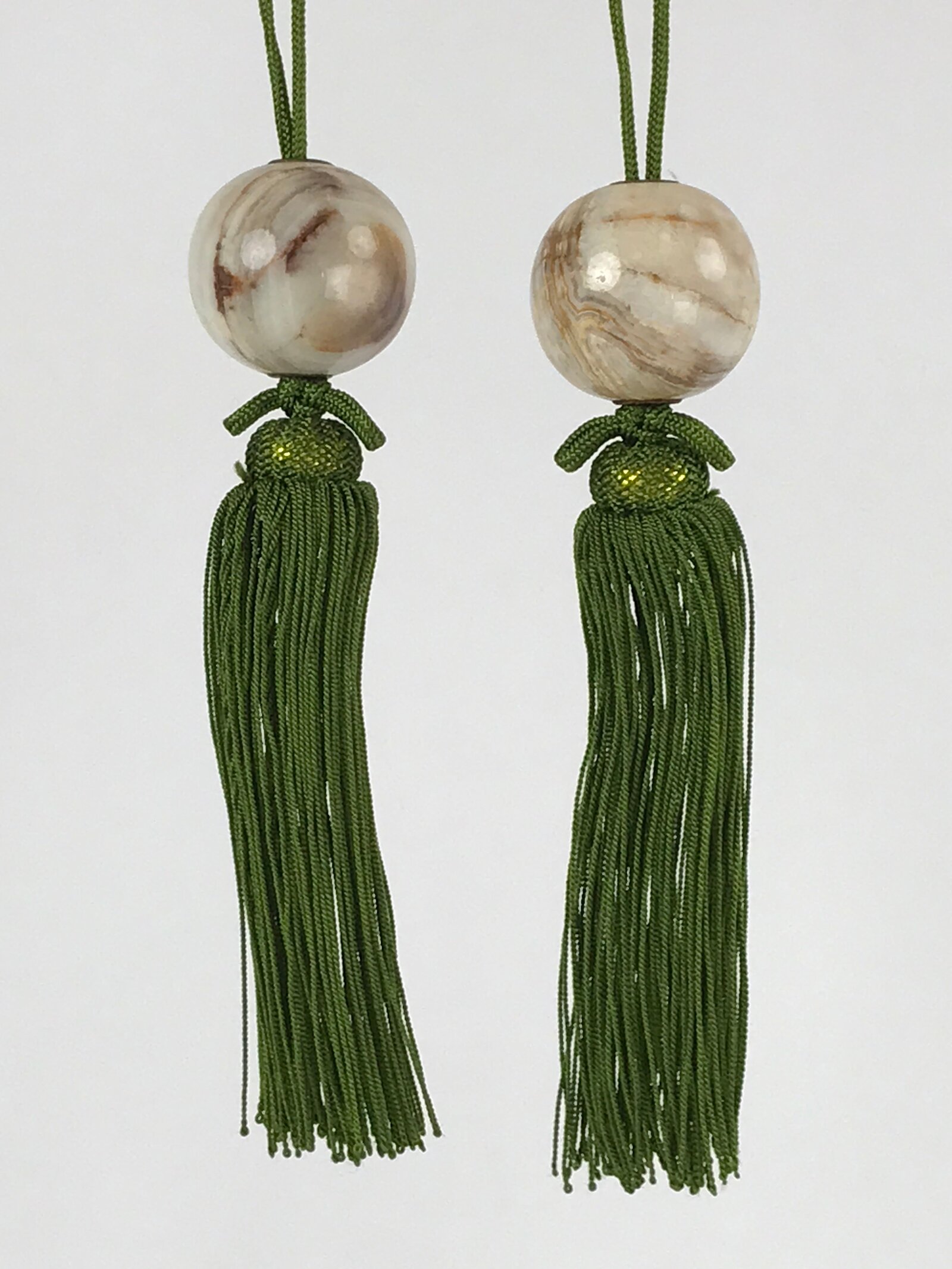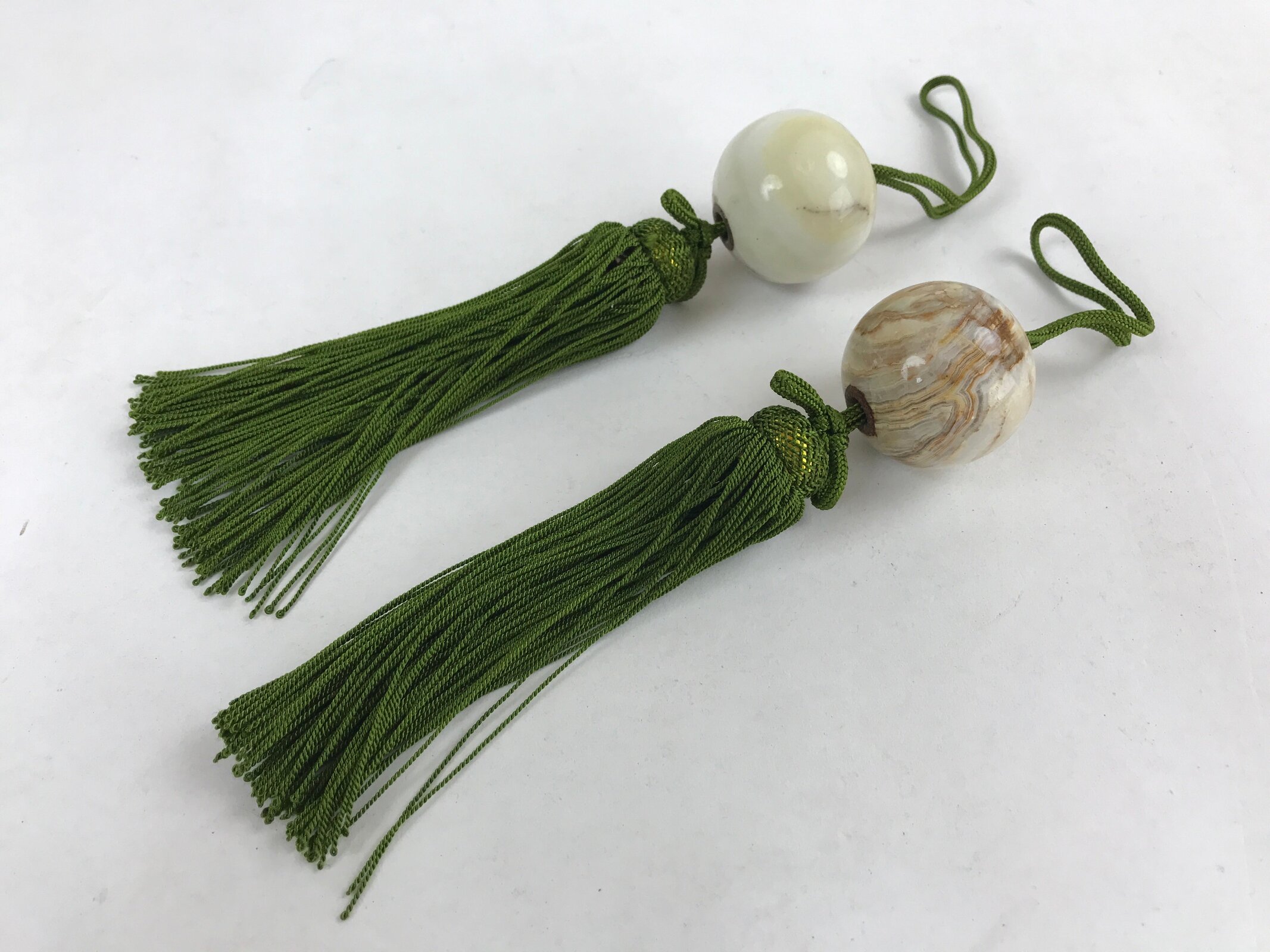 This is a pair of Japanese hanging scroll (kakejiku) weights, or fuchin. Fuchin is a decoration that hangs on both ends of the bottom of a hanging scroll. It’s a decoration as well as weighs the scroll down to keep it straight. This item features marbled agate stone spheres with a combination of white, light brown, and dark brown color in the grain. The holes on either end of the stones are capped with metal. It has green tassels with a gold accent under layer. The original box is included.