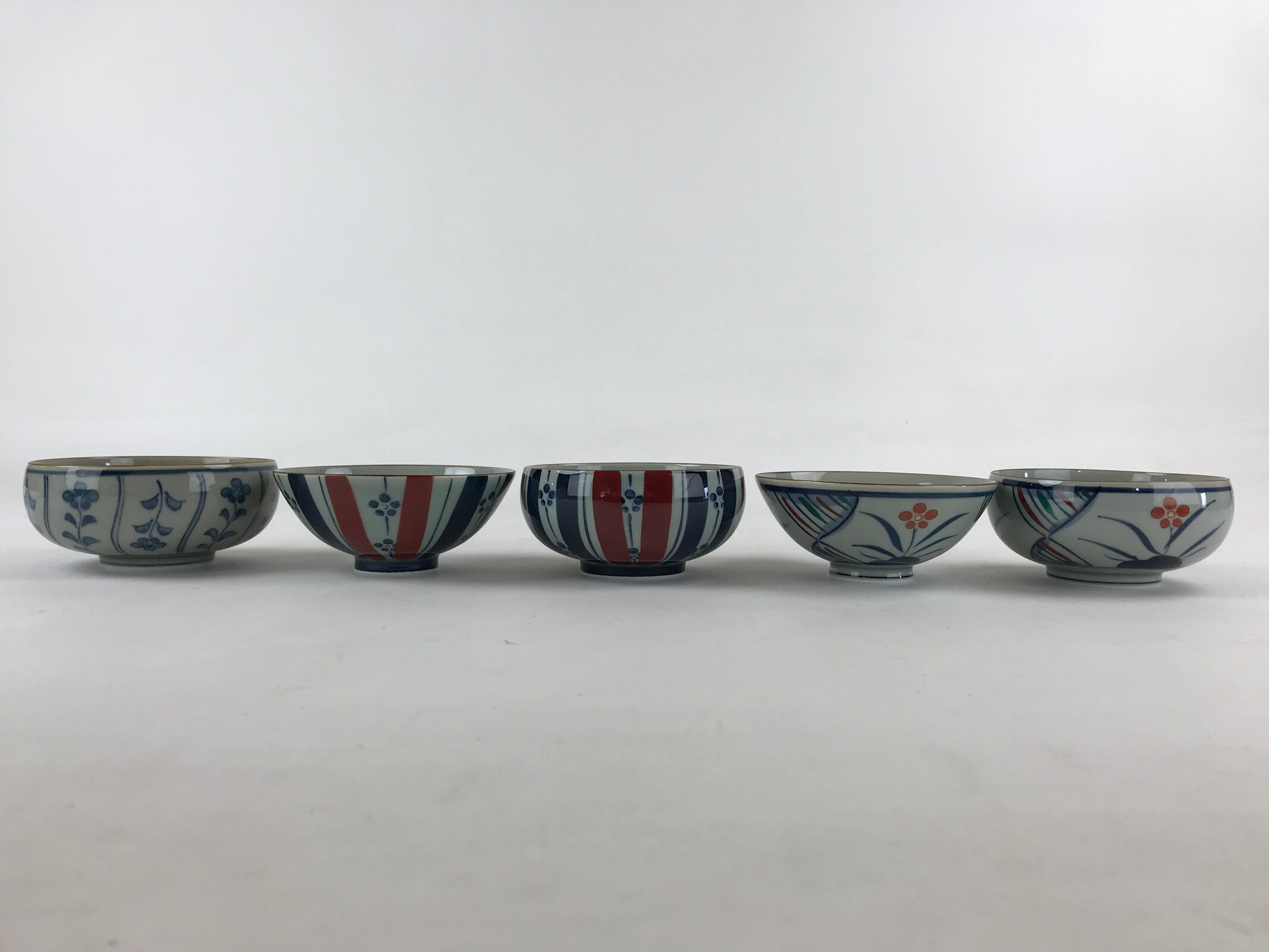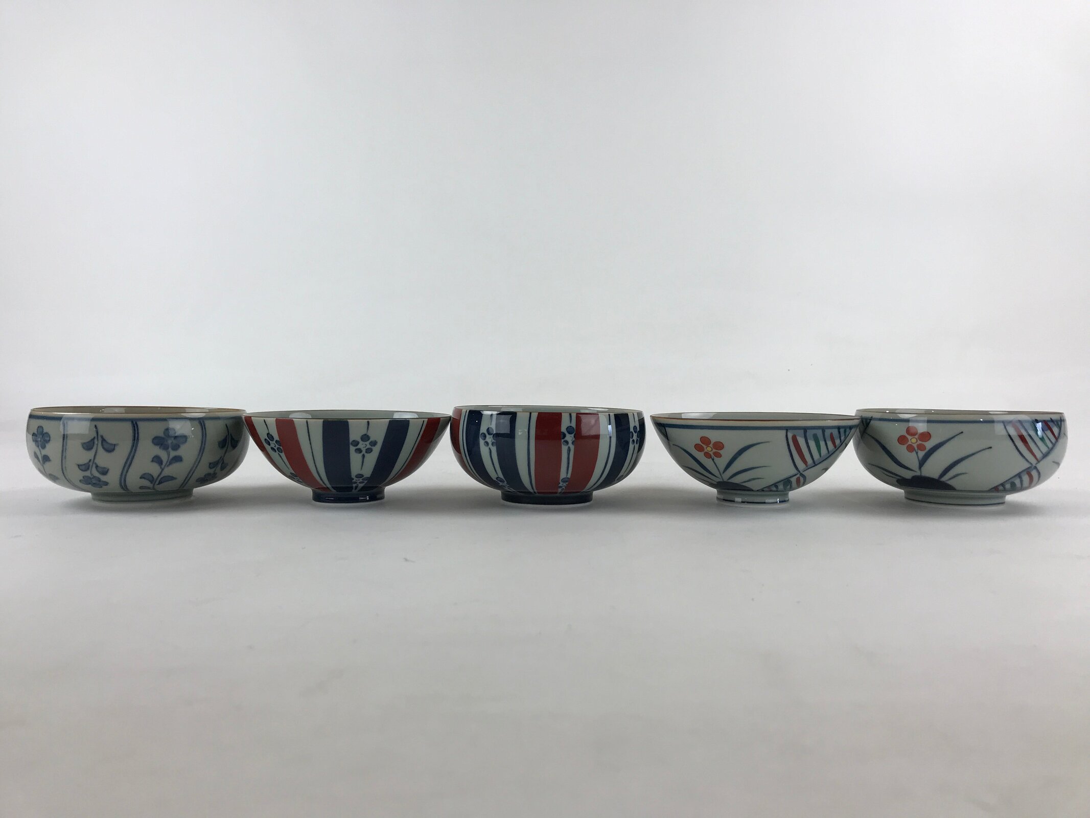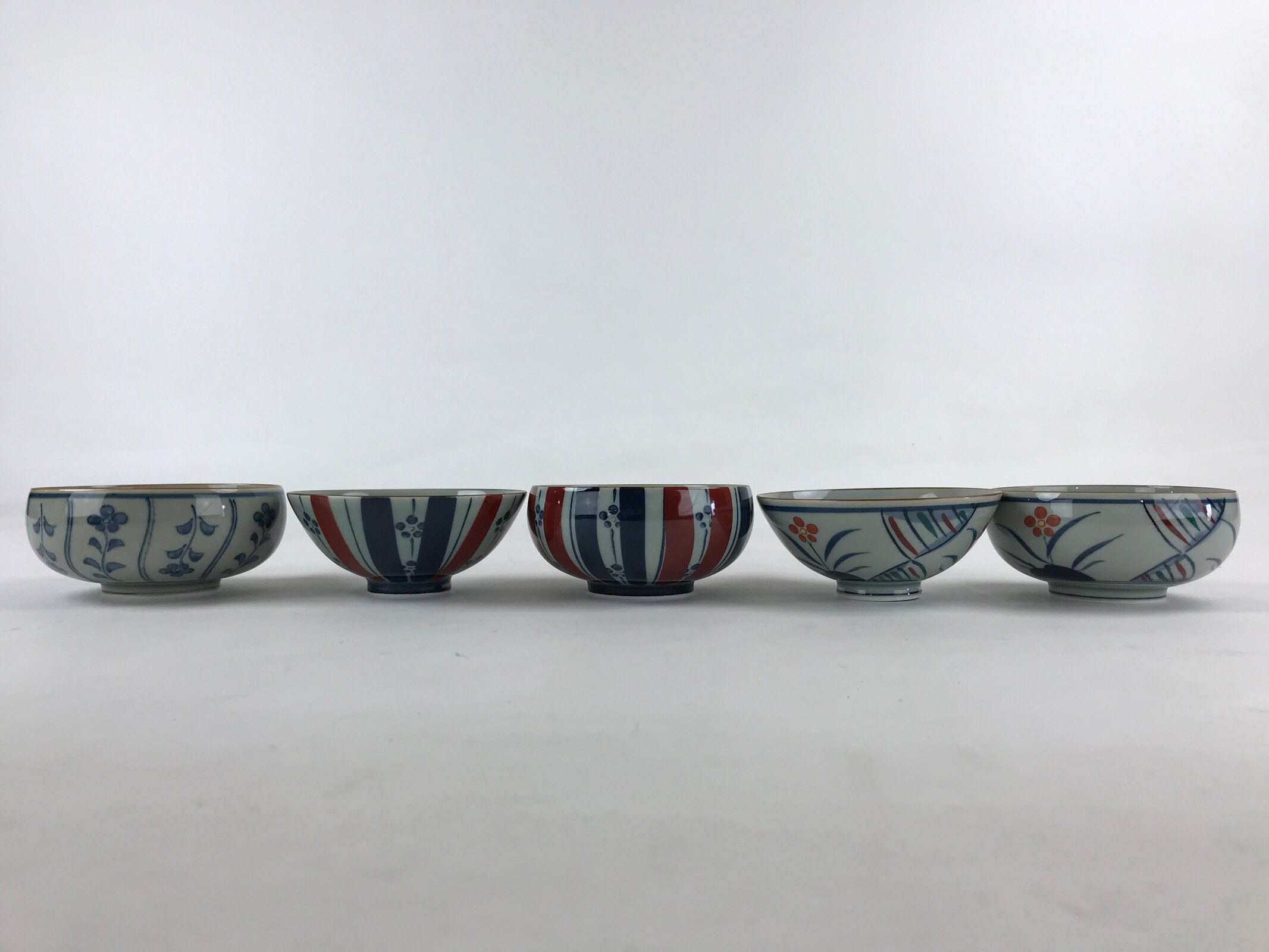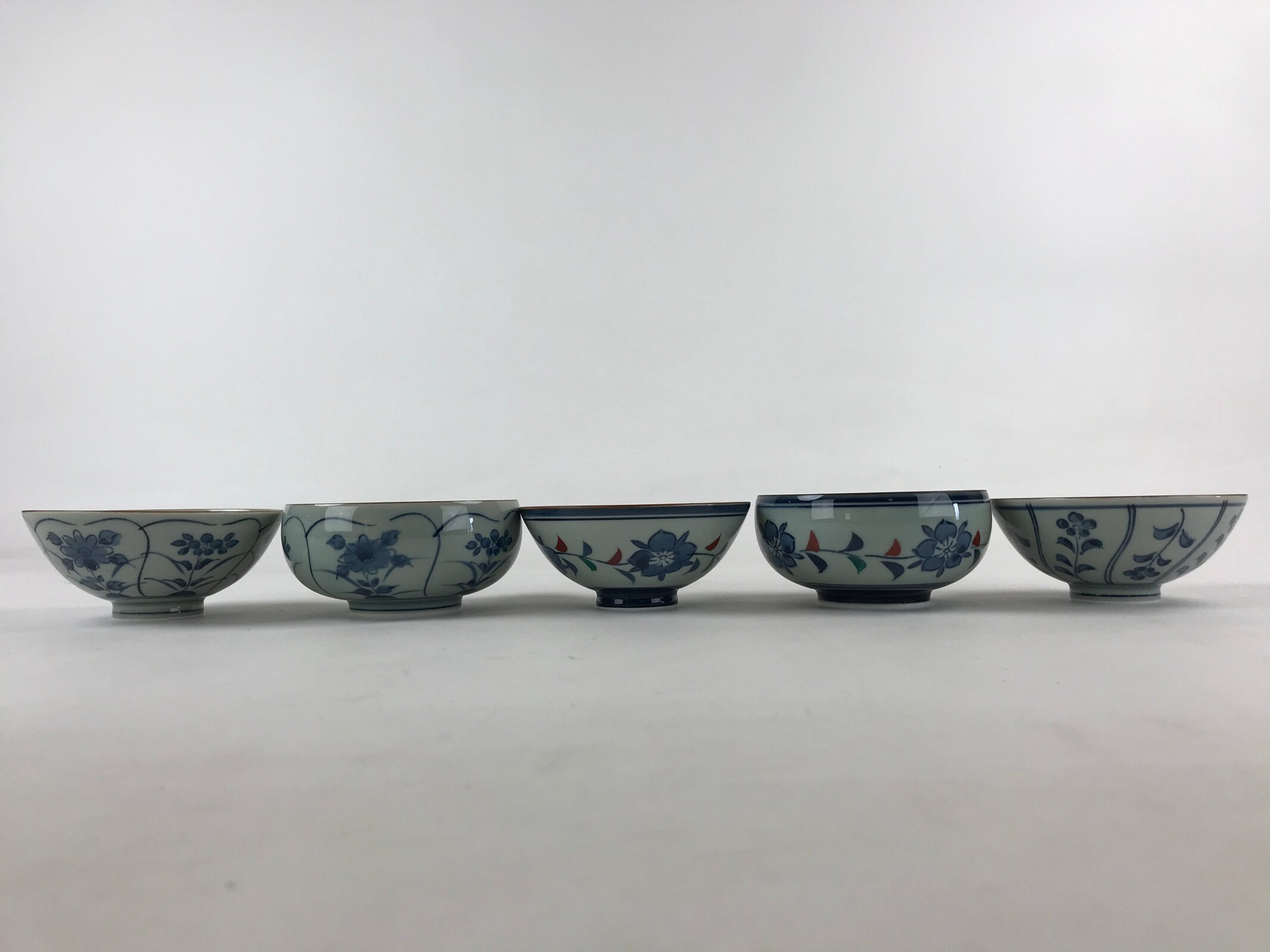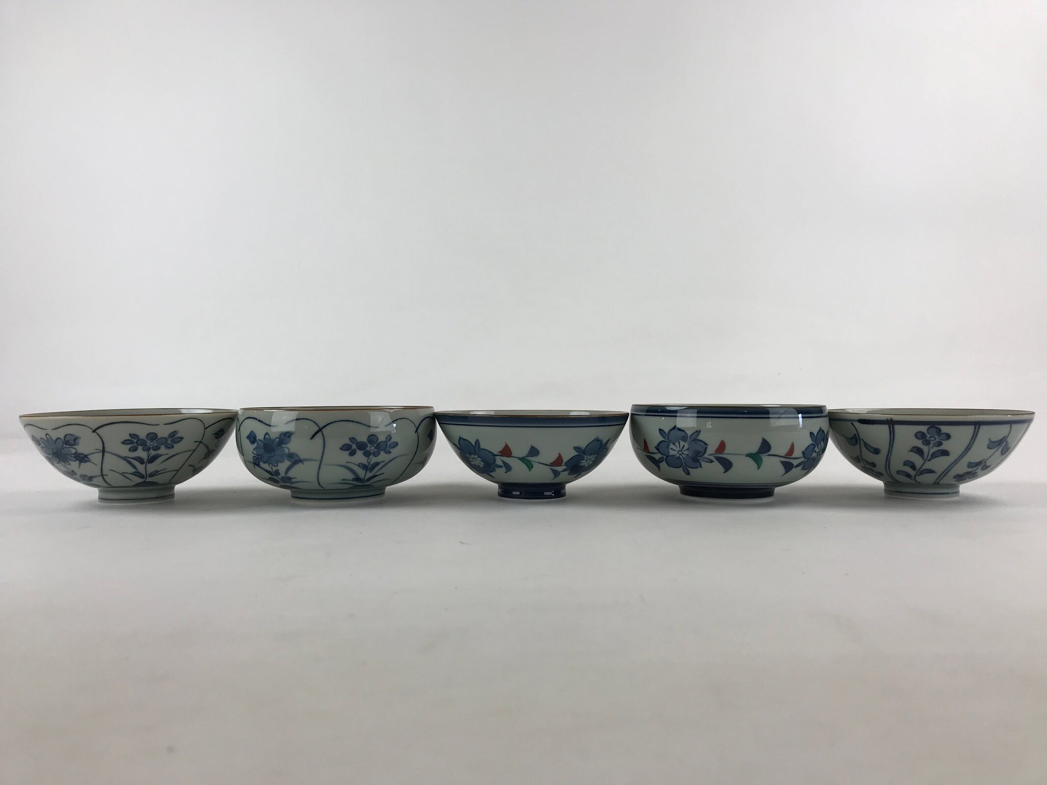 This is a Japanese vintage porcelain Arita ware Asahide kiln 10pc bowl set. There are 5 pairs of bowls and rice bowls, each with 5 different designs. All bowls are painted with flowers. These bowls are packed in a black lacquered wooden box.
