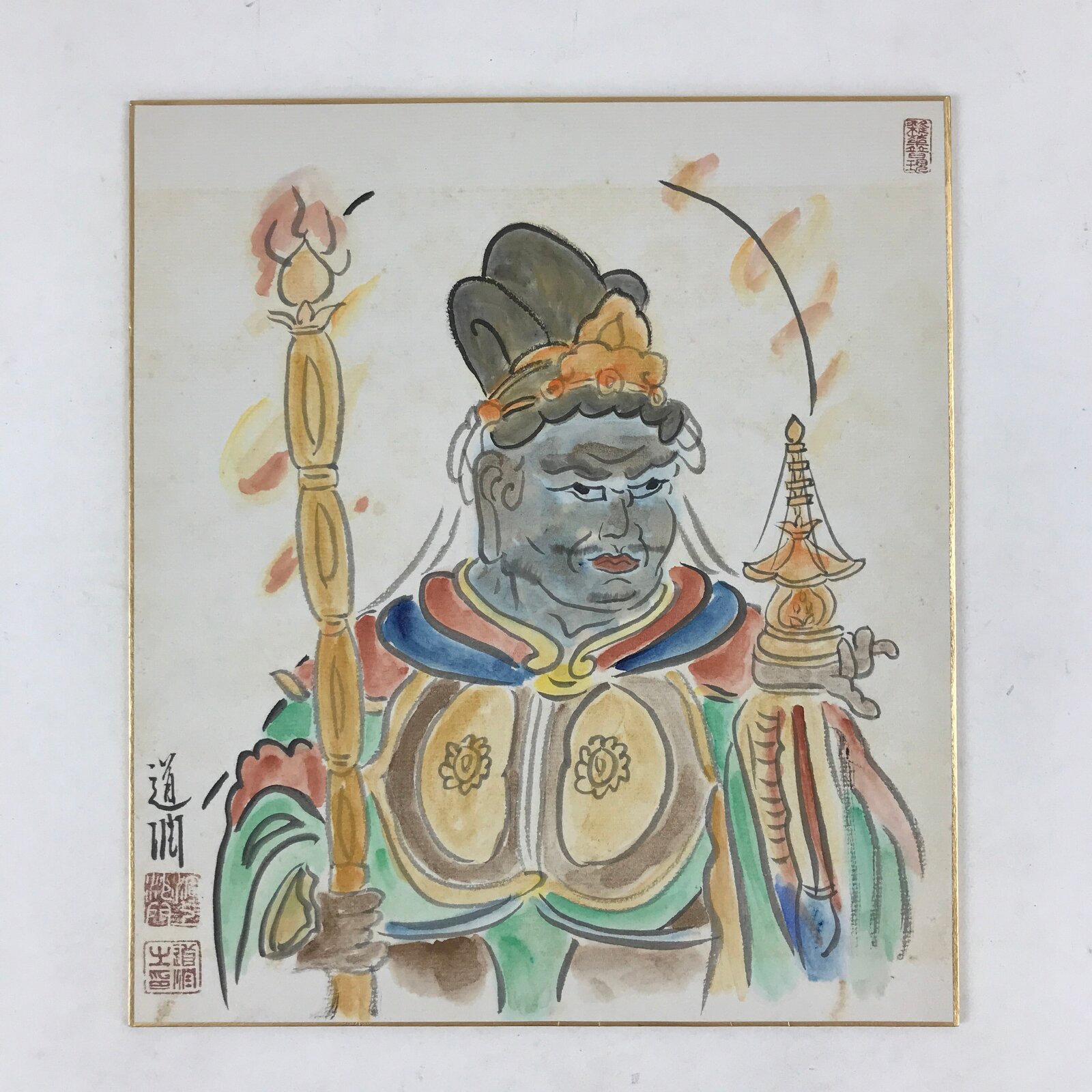 This is a vintage hand-painted shikishi art board of a blue man wearing a colorful robe and holding two objects in his hands. This painting has gorgeous vibrant colors. It is a unique display piece that can find a place in any home or office decor.