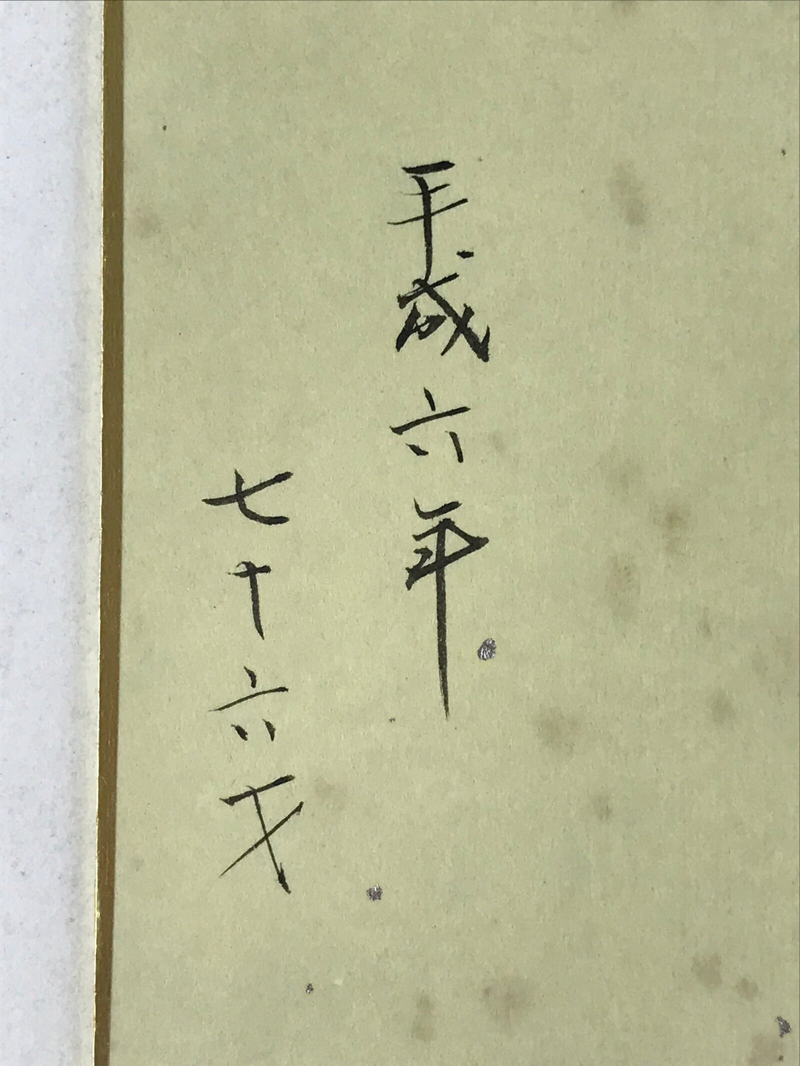 This item is a vintage hand-painted shikishi art board showing a calligraphed poem. The poem is painted on a paper that has different colors such as yellow, green and purple. On the back of the art board, there are some inscriptions corresponding to the date of the creation and the age of the author. It is a simple and modern display piece that can find a place in any home or office decor.