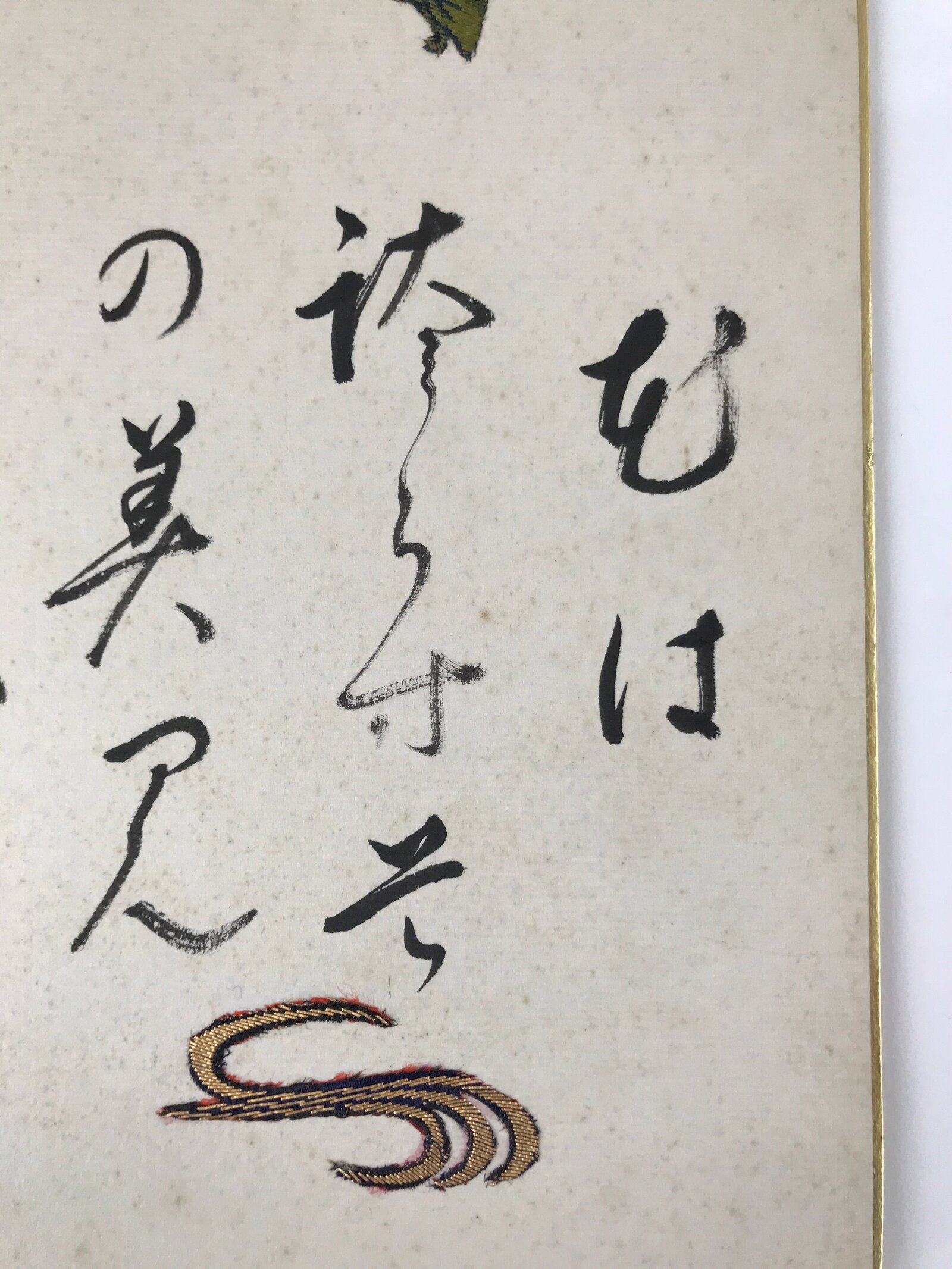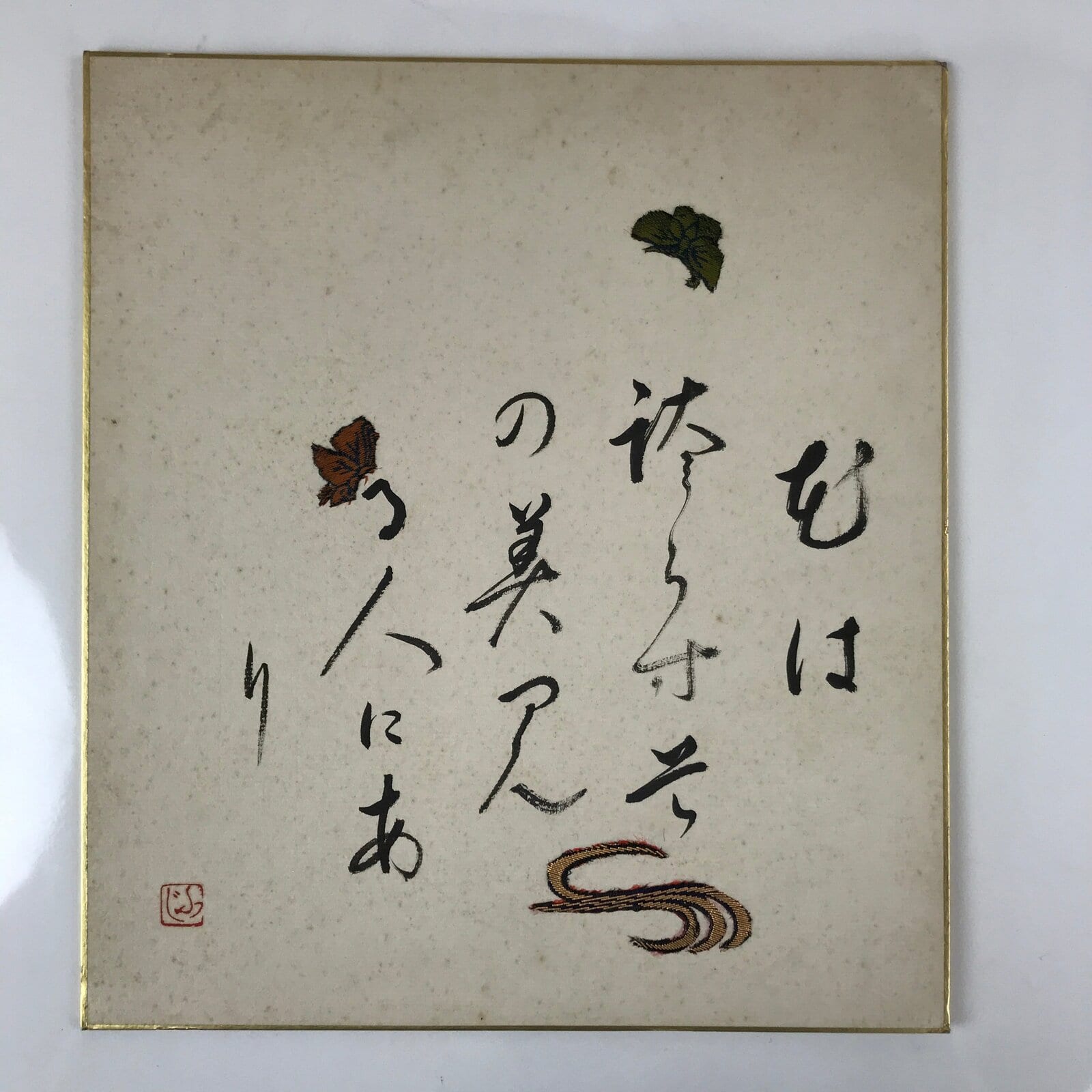 This vintage Japanese shikishi art board is a black calligraphy of a poem embellished with glued fabric pieces. This shikishi is signed with a red seal.
