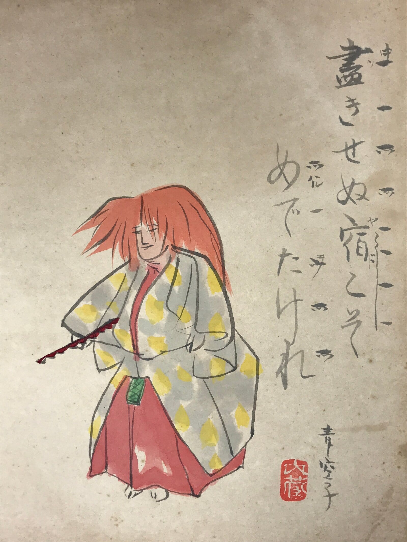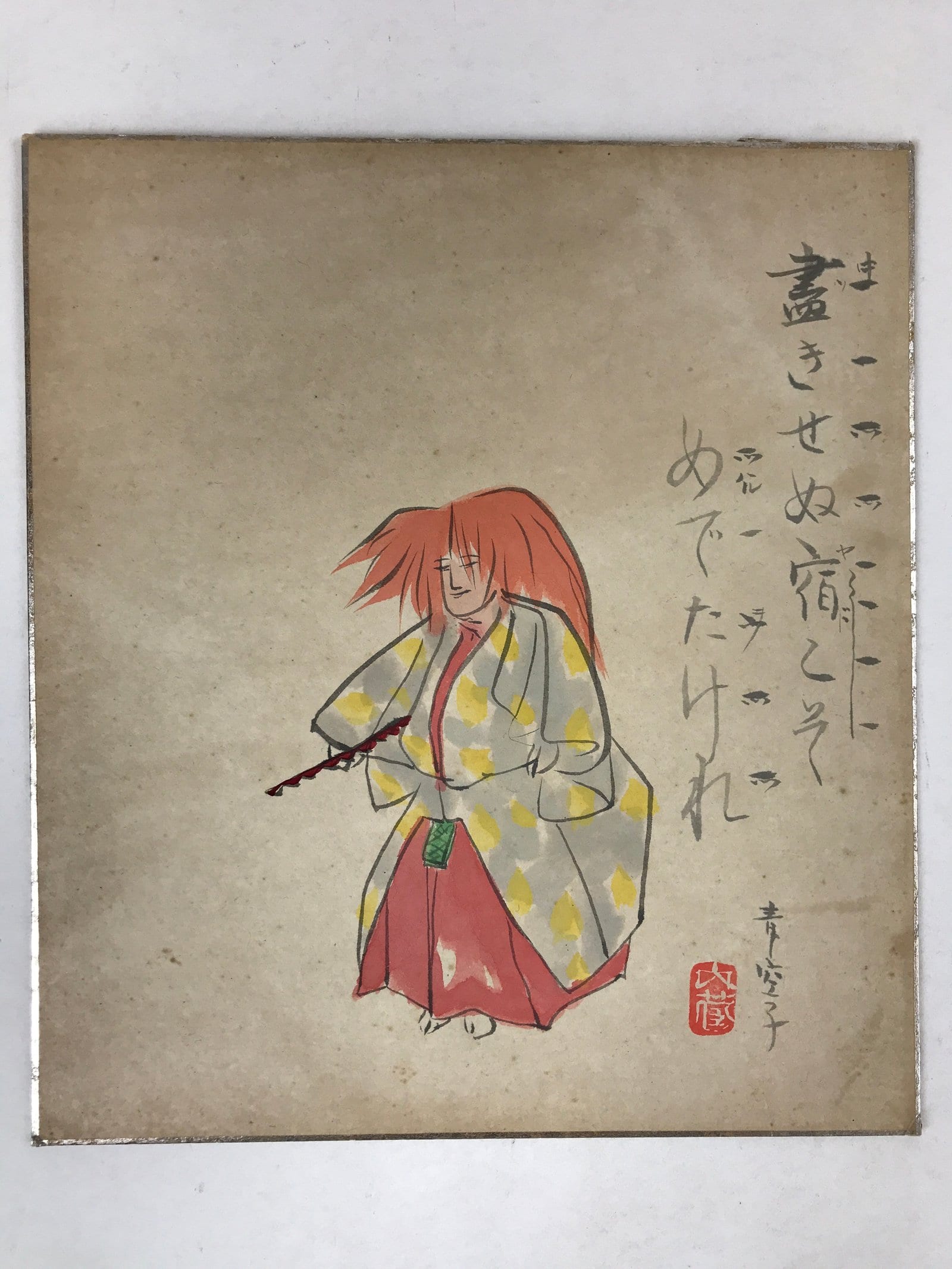 This item is a vintage Japanese zodiac shikishi art board. It is hand-painted and features a man with orange hair wearing a kimono. The illustration has a sentence attached. This shikishi art board is signed. There are some characters written on the back.