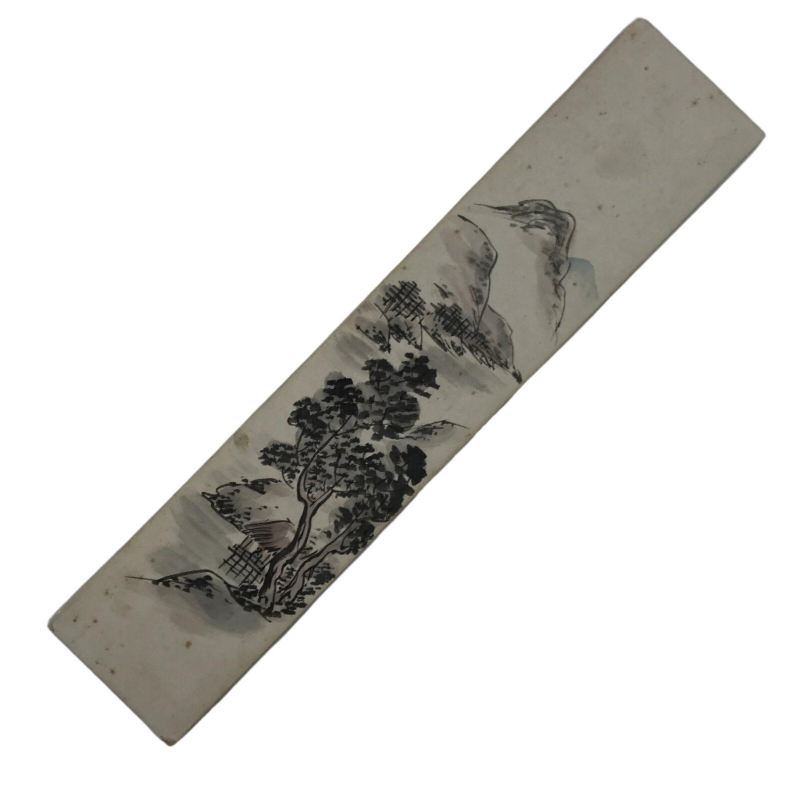This vintage Japanese tanzaku long-type shikishi art board features a landscape with mountains, trees, and a river. In the foreground, there is a house with a human character. This shikishi is in the sansui, literally mountains and water, style. It is black with subtle touches of color. The shikishi is hand-painted.
