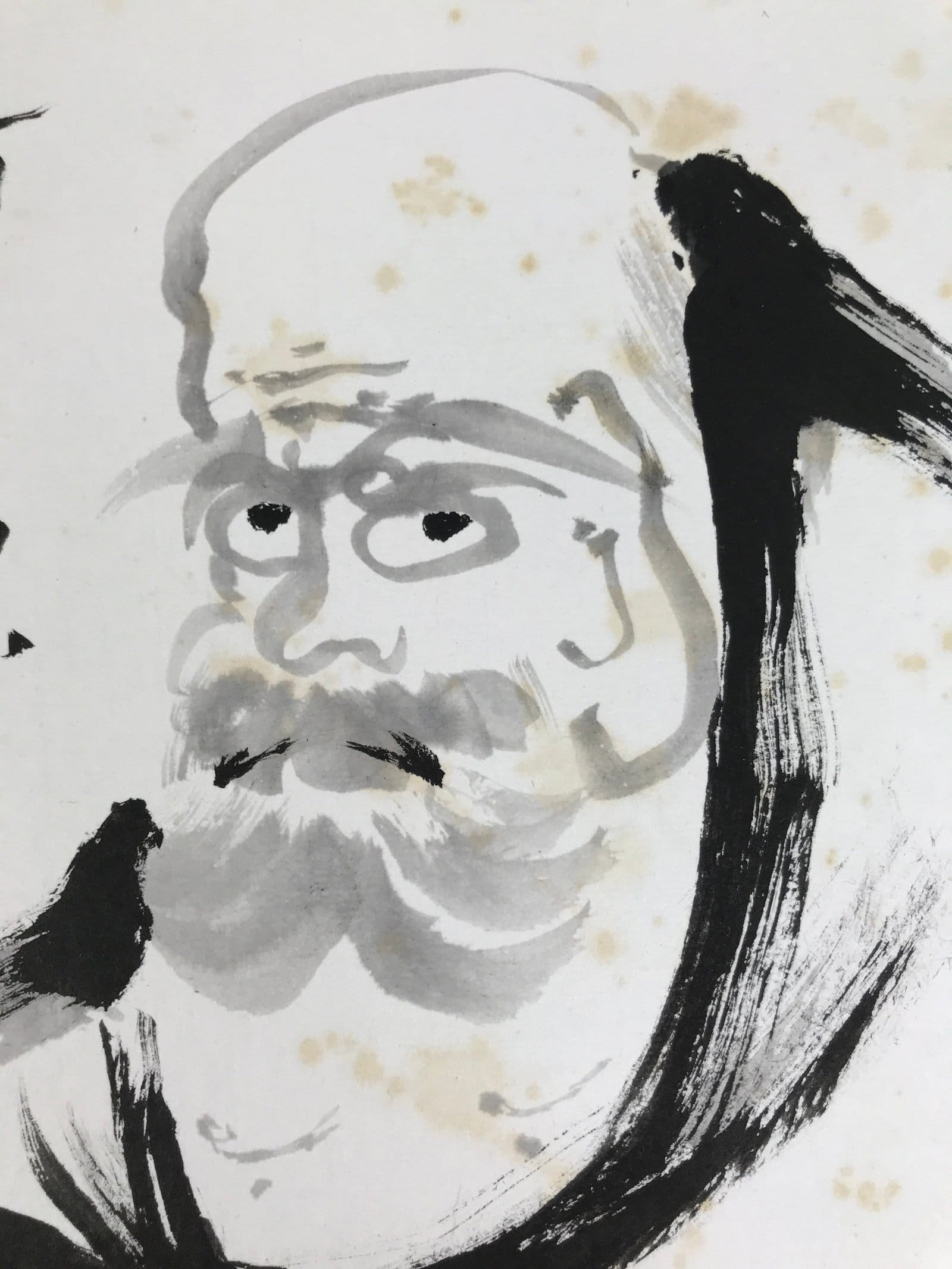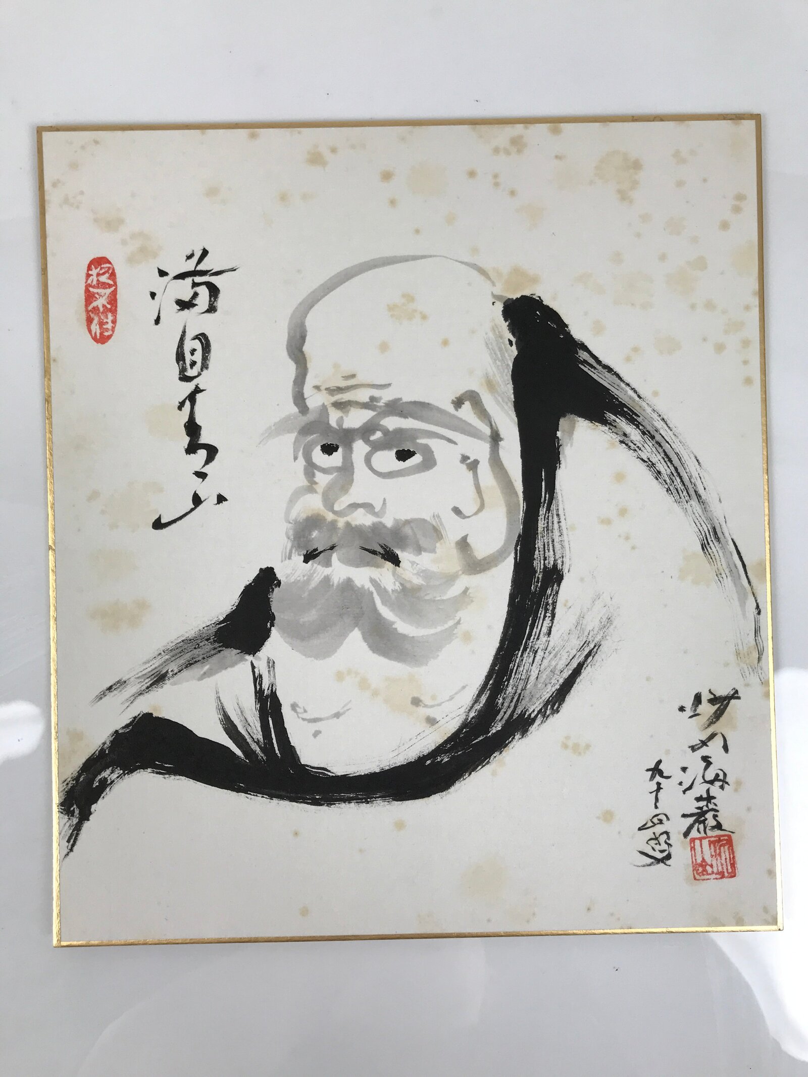 This Japanese shikishi art board features a black-and-white portrait of Boddhidharma (or Daruma in Japanese), a Buddhist monk. This painting focuses on the head of the monk. This shikishi is signed with names and red seals.