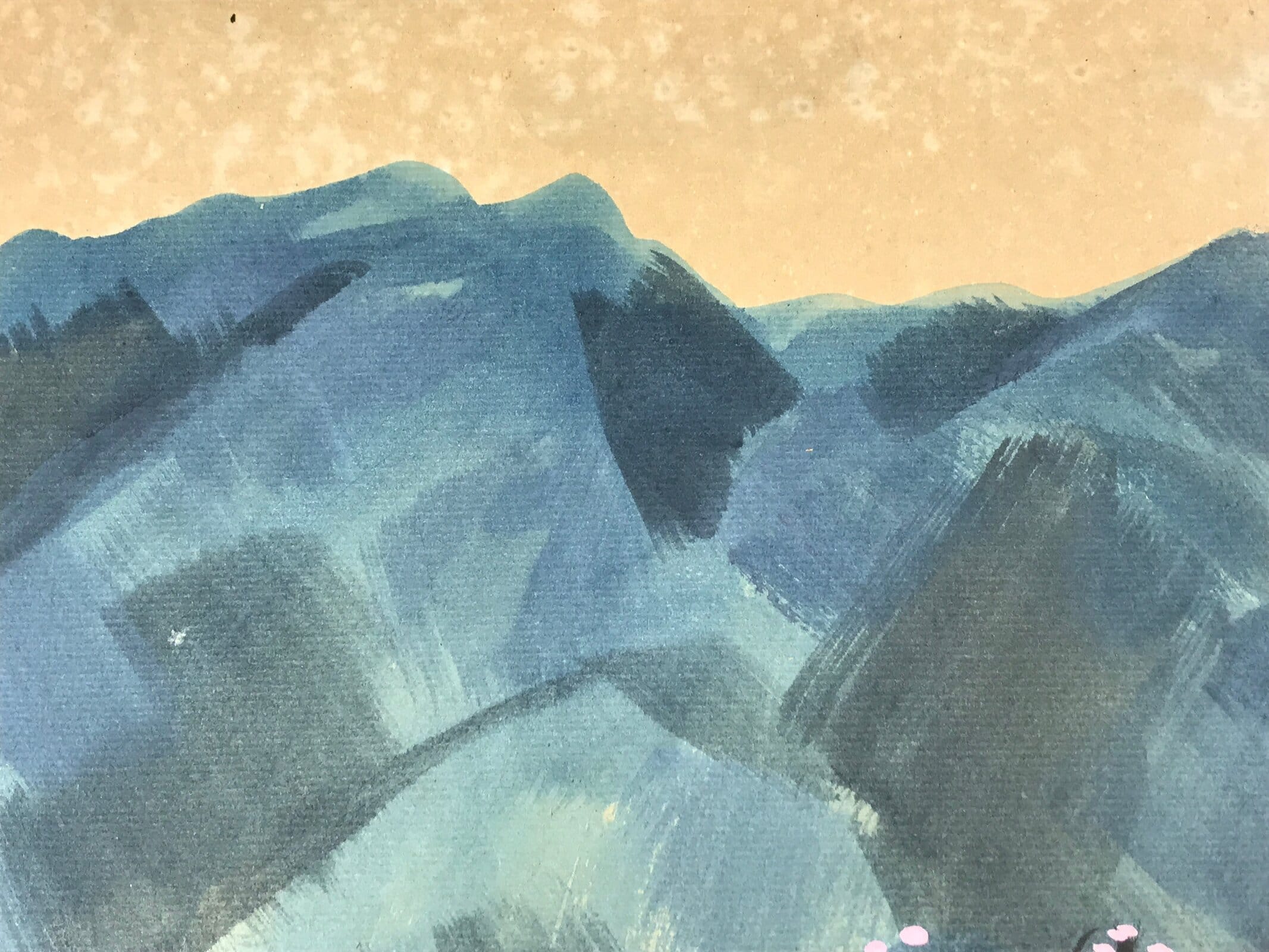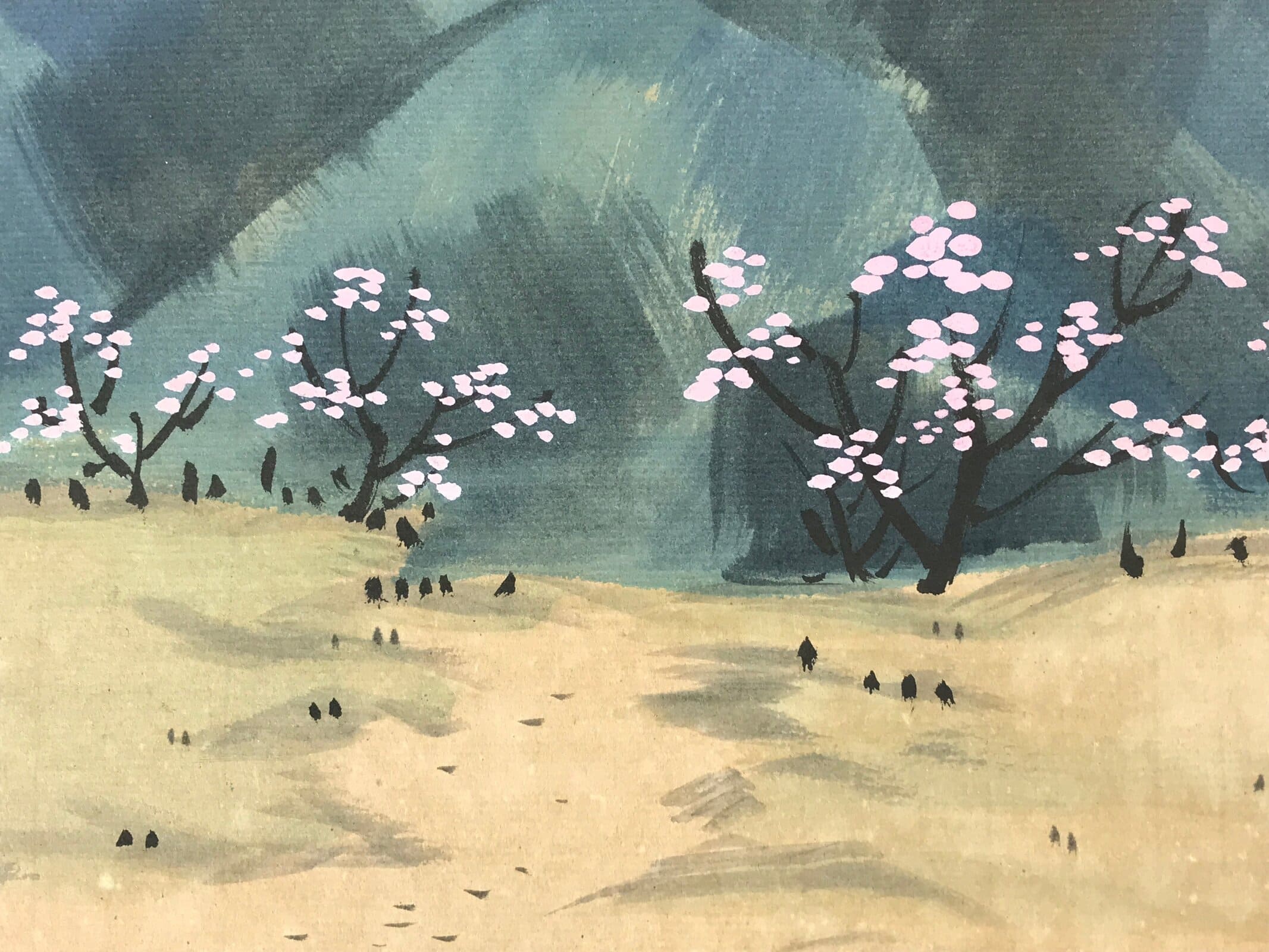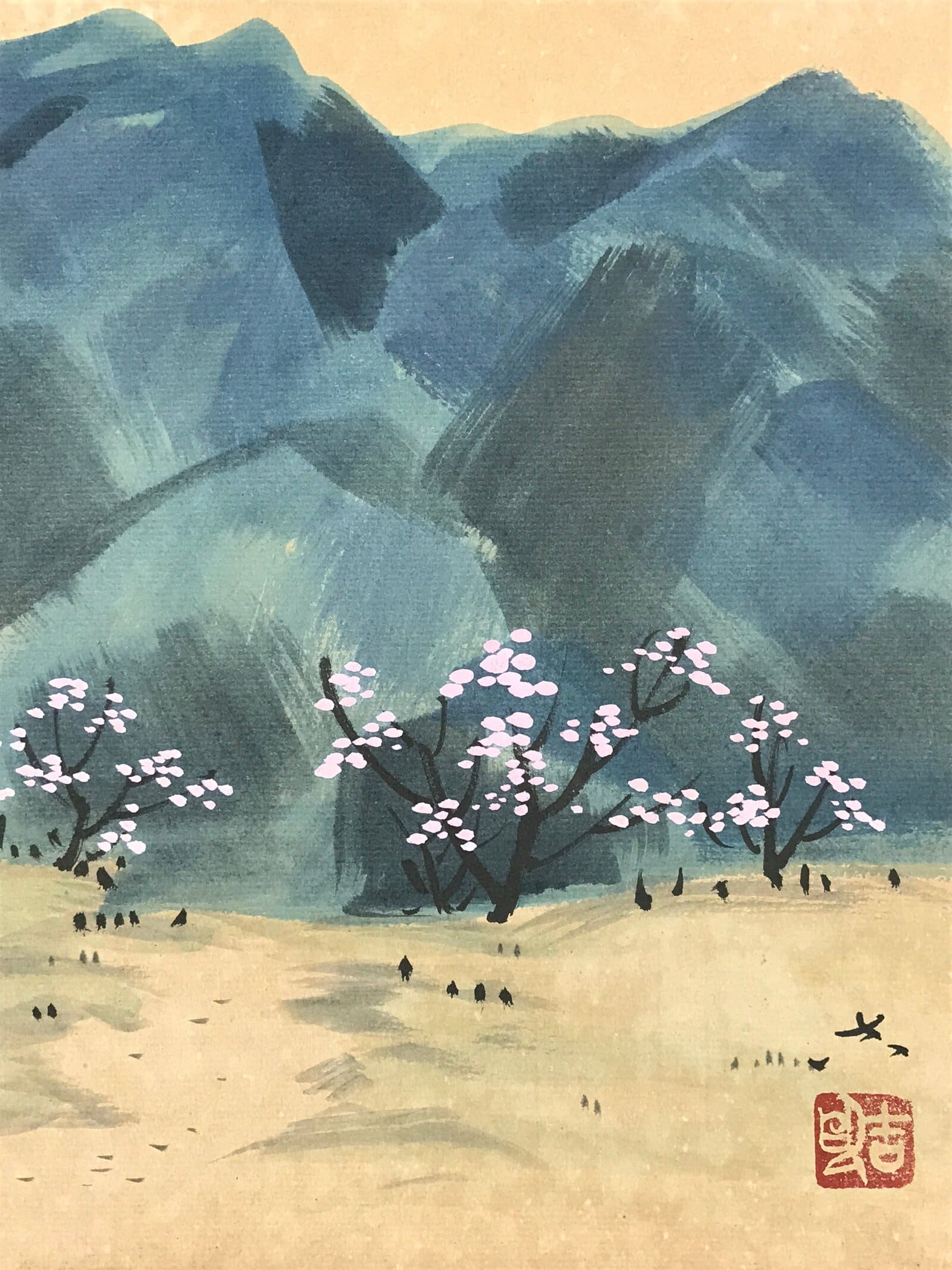 This is a vintage Japanese shikishi art board. It is hand-painted and features a landscape scenery with a big blue mountain on the background. Some trees with pink blossoms, most likely cherry blossoms or plum blossoms, can be seen in front of the mountain. Some people are painted as well. The shikishi art board is signed.