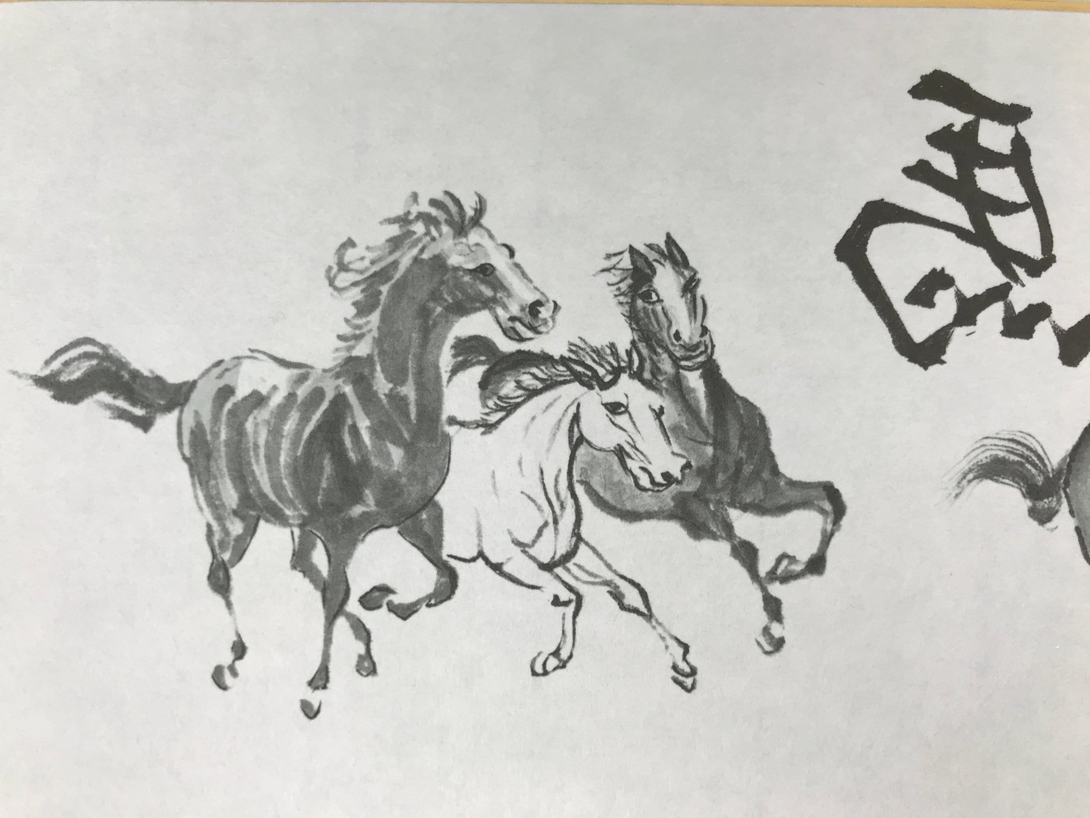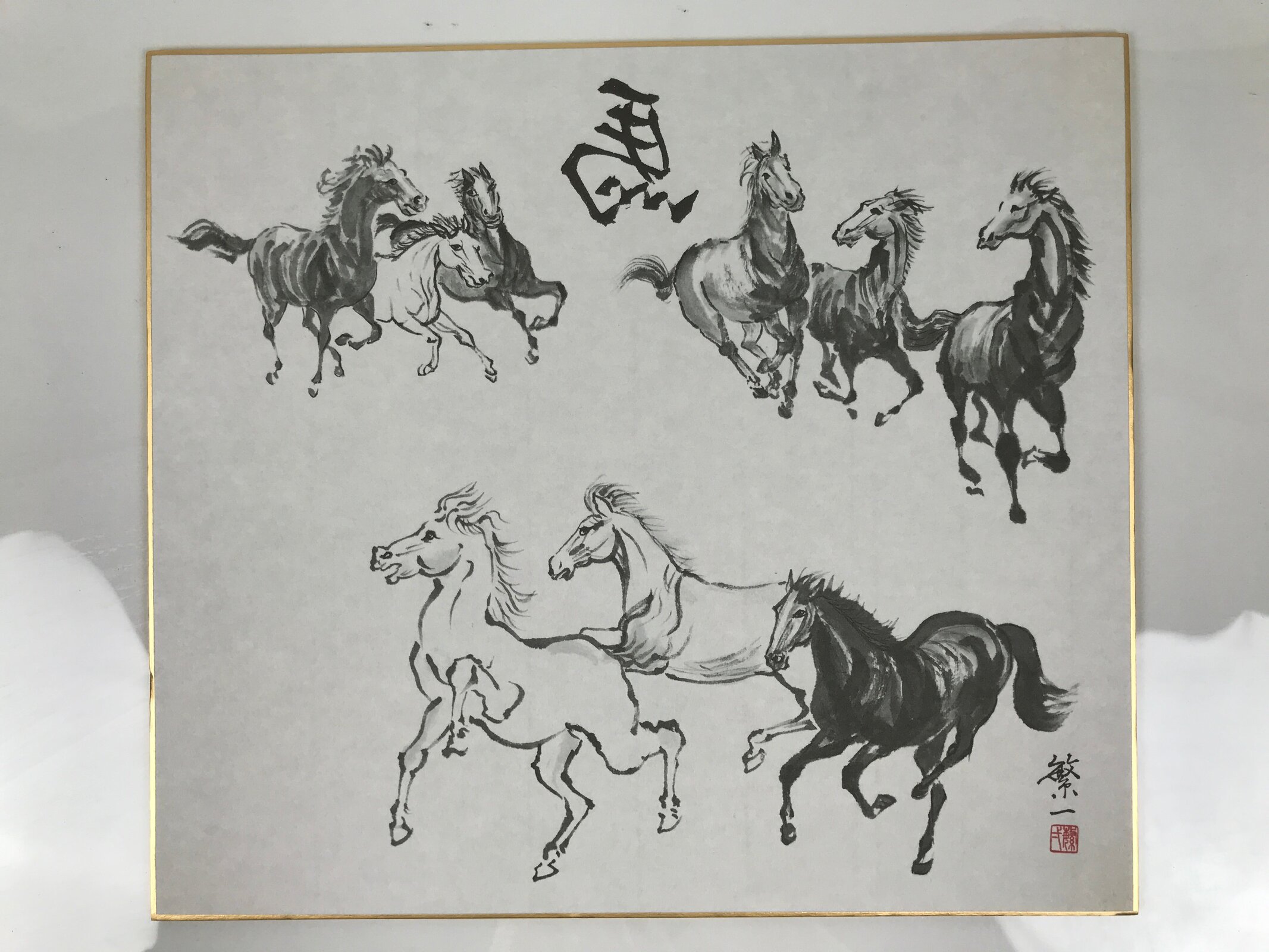 This Japanese shikishi art board is a printed reproduction featuring running horses in a realistic style painted in gray scale. At the top, there is a calligraphy of the kanji 馬, meaning horse, mirrored. It is a symbol of good fortune. This shikishi is signed with a name and a red seal, and it is stored in a plastic sleeve. There is a paper with explanations in Japanese on the back.