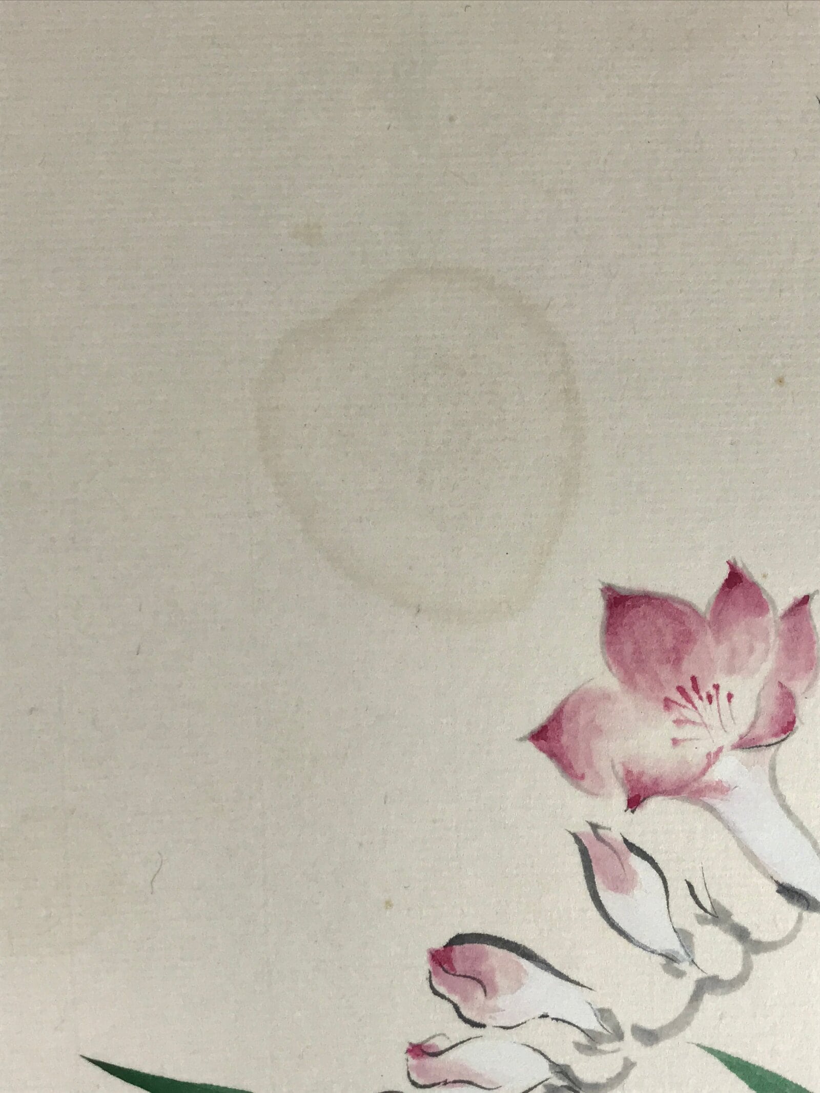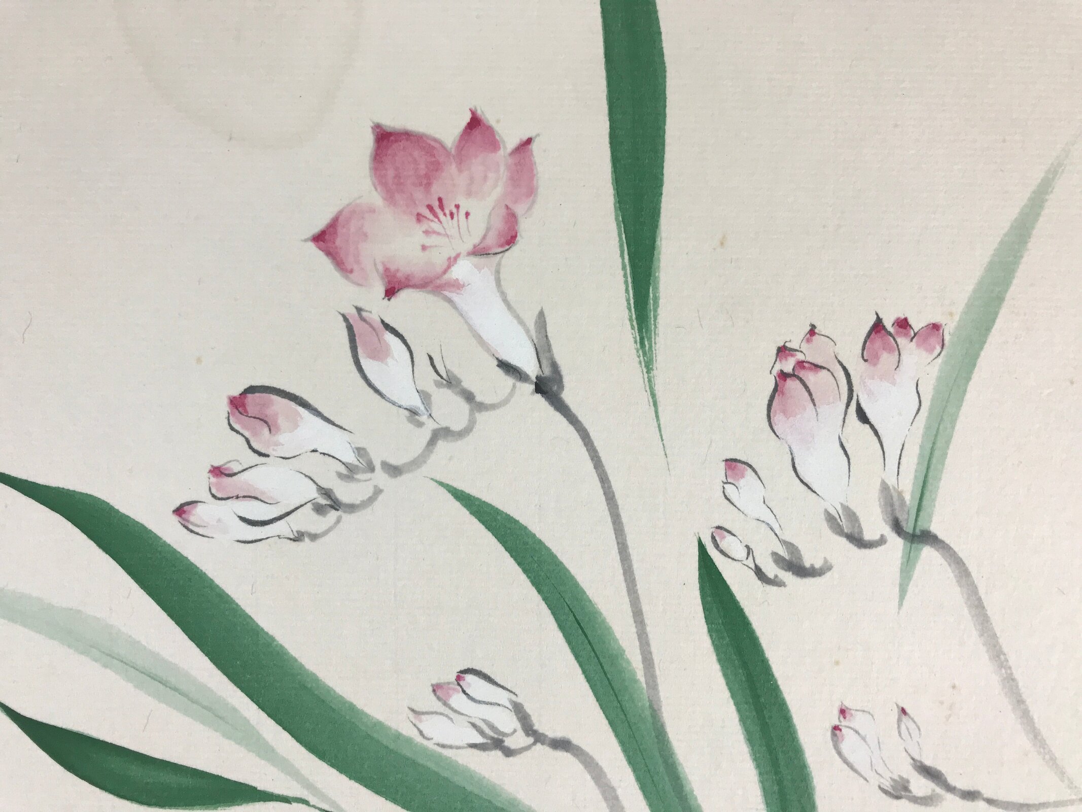 This is a vintage Japanese Shikishi-paper painted pink flower. There are three basic types of shikishi paper. Calligraphy (poem, haiku) only, Calligraphy plus pictures, and pictures only. Since the Heian period, people have been writing waka and haiku on Shikishi paper (various sizes), but in the Meiji period, they started using paper of the current size. Recently, Shikishi paper is being used as paper to write autographs of celebrities.