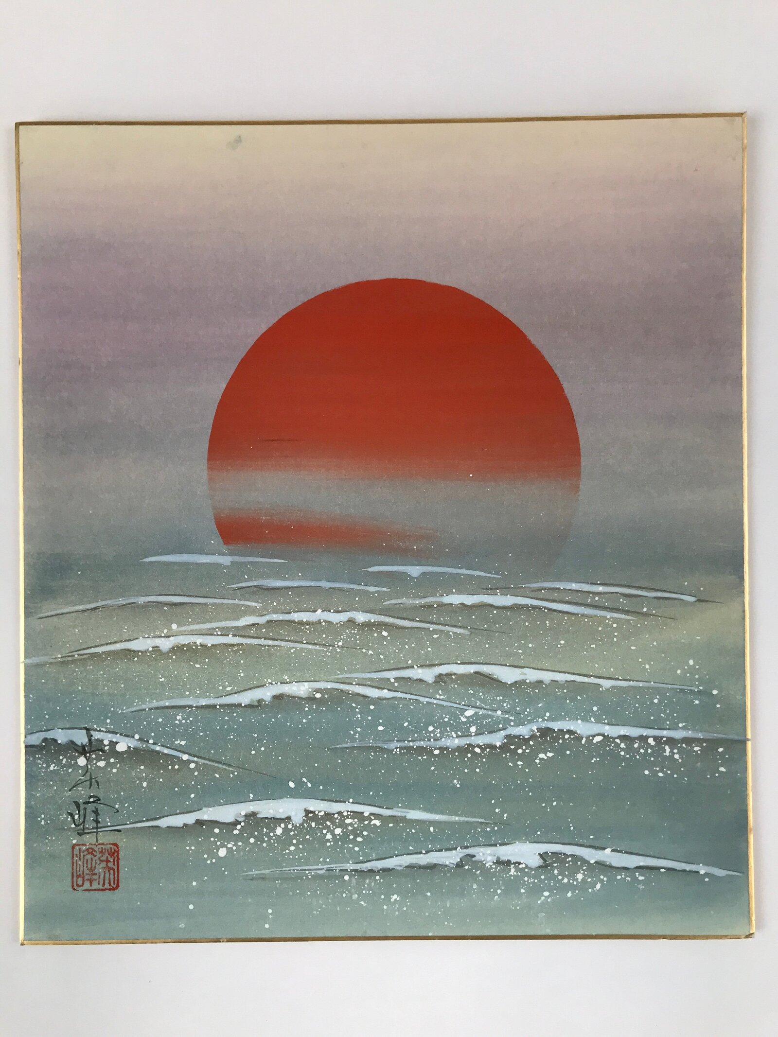 January 21, 2026Japanese Shikishi Art Board Vtg Nihonga Sunrise Waves Akita Eiho Orange A635
