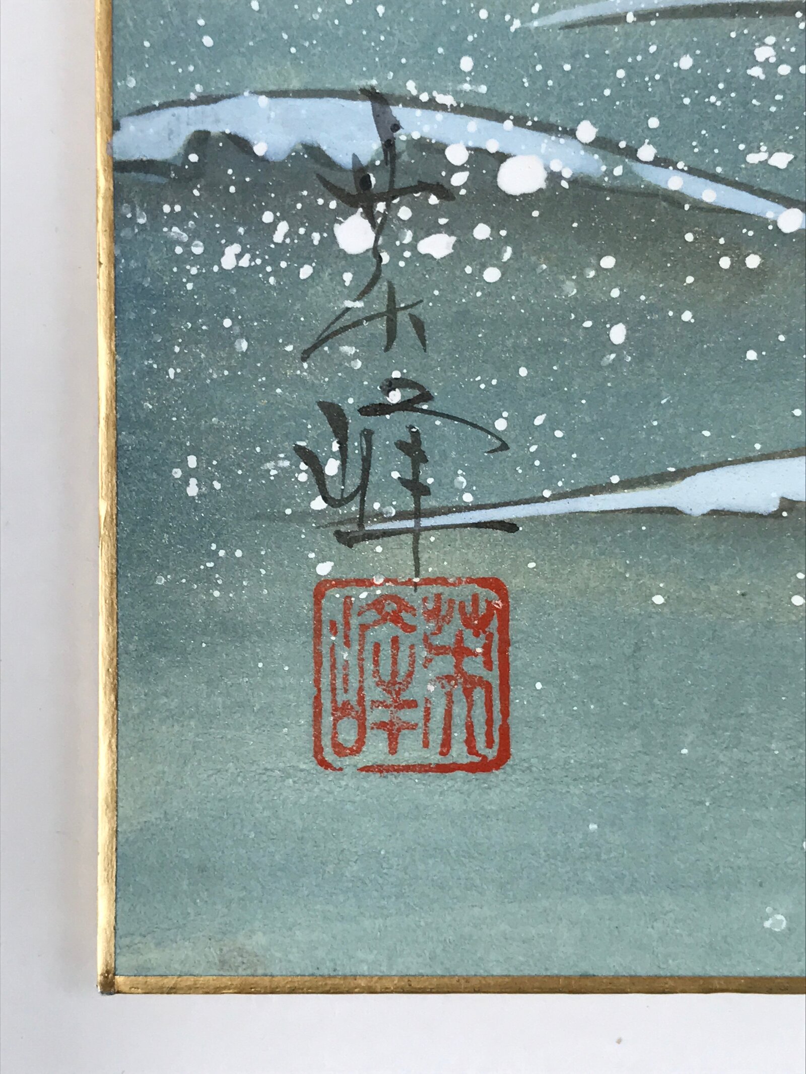 This Japanese shikishi art board represents an orange sun rising on the waves of the ocean. The orange sun is the center of this composition but the waves are detailed with white foam. This shikishi art board is signed on the bottom left. There is a tag on the back with the title, the painter’s name and other information.